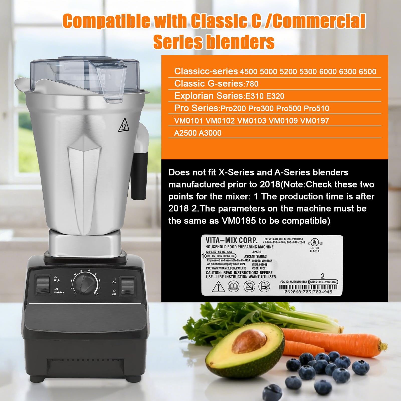Compatible Blenders: 64oz stainless steel pitcher jar compatible with Classic C /Commercial Series blenders: 4500, 5000, 5200, 5300, 6000, 6300, 6500, 780, E310/E320, Series 200/300/500/510/,VM0101, VM0102, VM0103, VM0109, VM0197, A2500 A3500 A3000. PLEASE NOTE: Does not fit X-Series and A-Series blenders manufactured prior to 2018. Example: vm0185a etc.