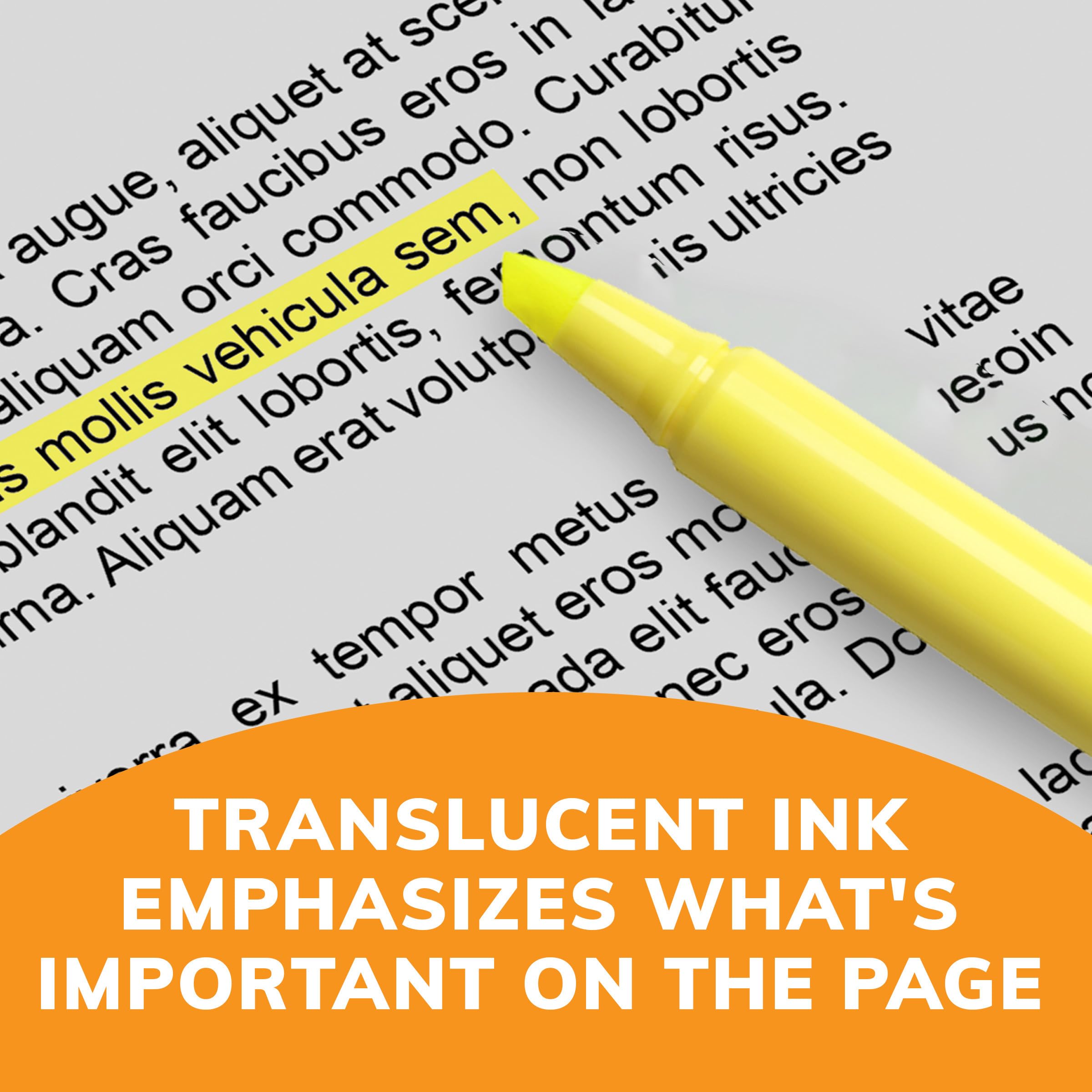 Highlighter set with translucent ink that emphasizes what's important on the page without obscuring the highlighted text