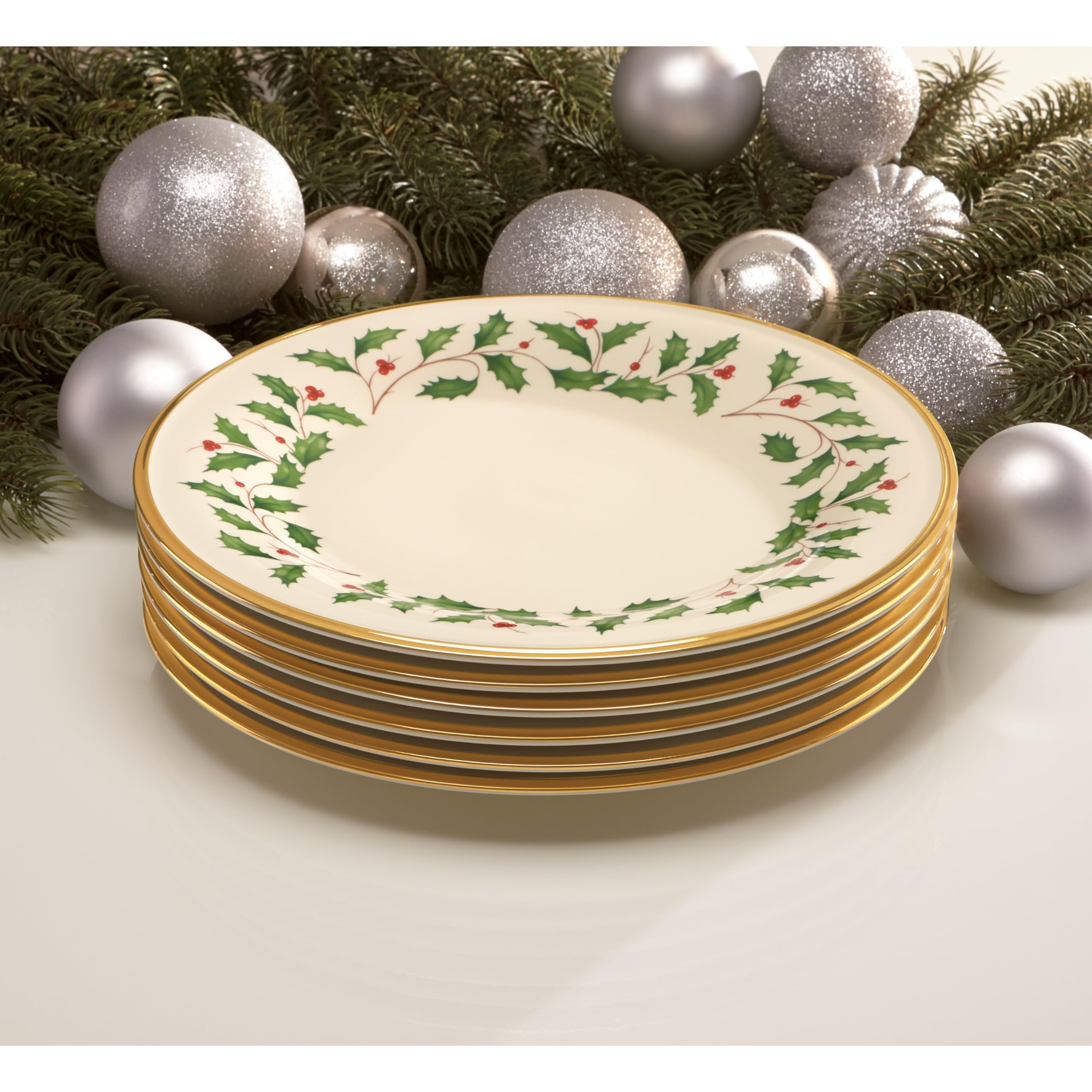 Part of the time-honored Lenox Holiday Dinnerware Collection, our holly and berry motif adorns the surface of the Holiday Dinner Plate. Crafted from durable ivory bone china with rich 24-karat gold trim, for an opulent holiday themed tableware addition, made in the USA.