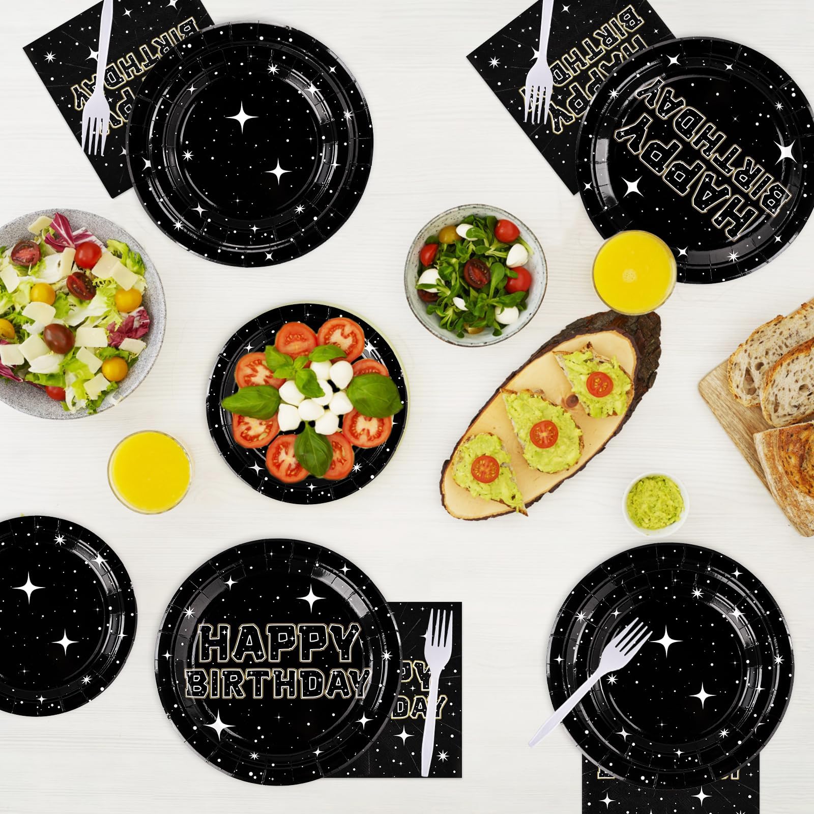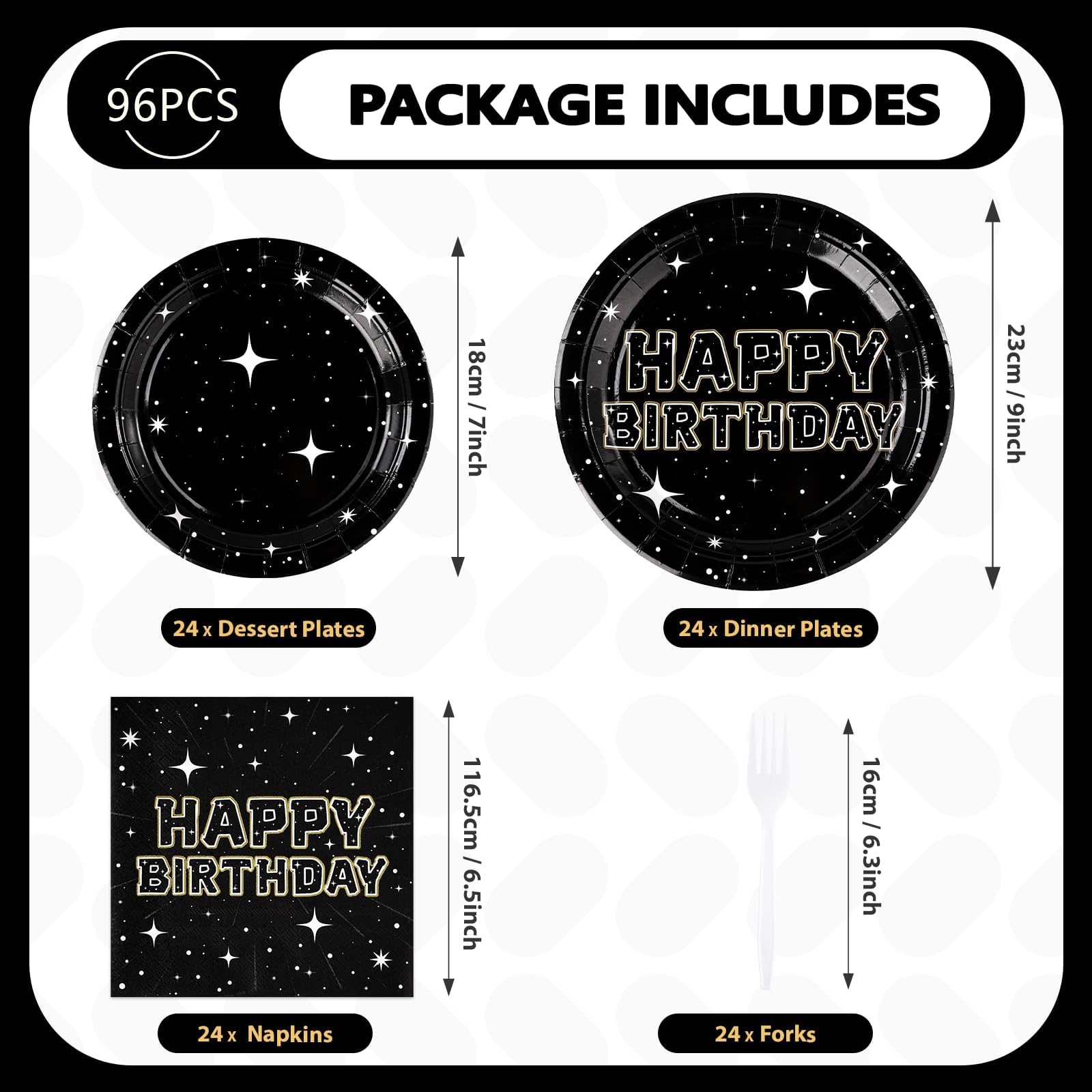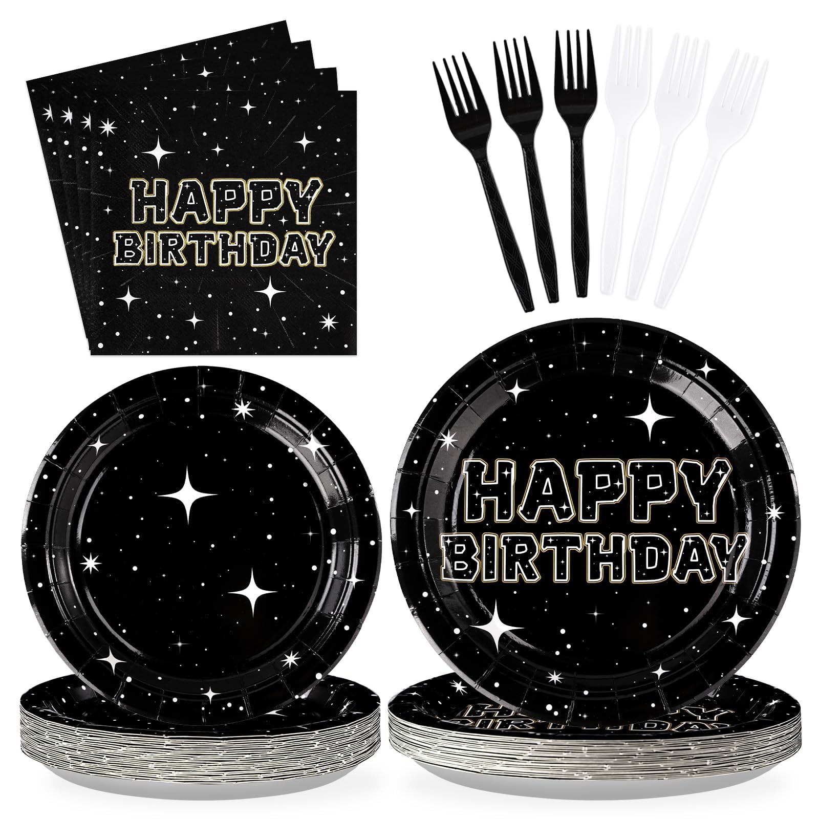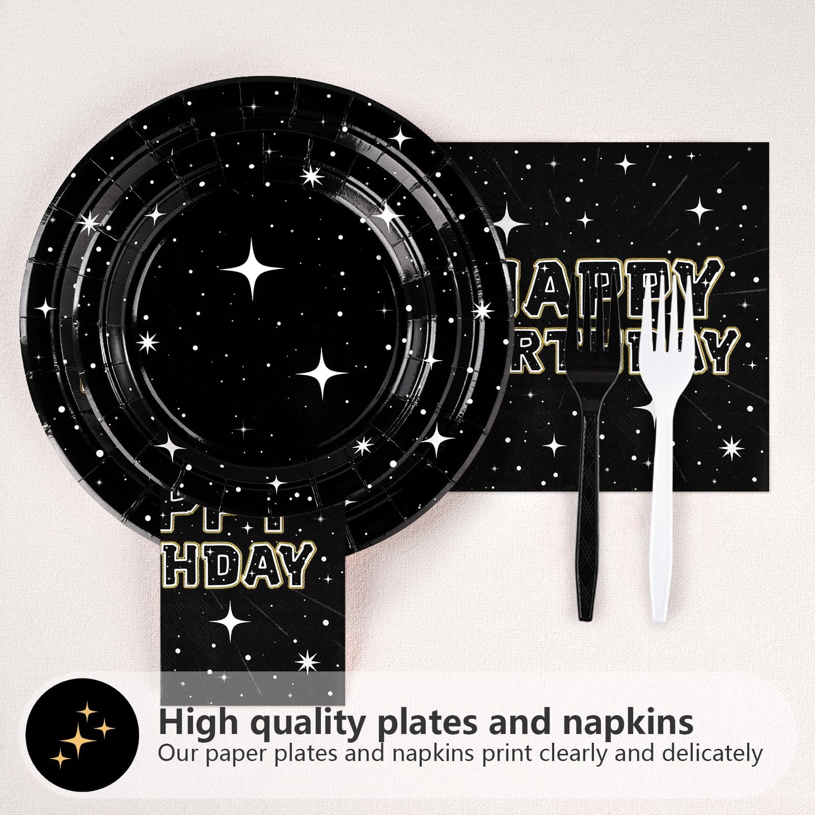 【Space Birthday Party Supplies】Black star party decorations flatware set includes 24pcs 9''stars dinner plates, 24pcs 7'' stars dessert plates, 24pcs stars napkins, 24pcs disposable forks.There are a total of 96 pieces in this stars party plates and napkins set,everything you need to serve up to 24 guests in style.The space stars birthday party supplies are enough to hold a different and unique party