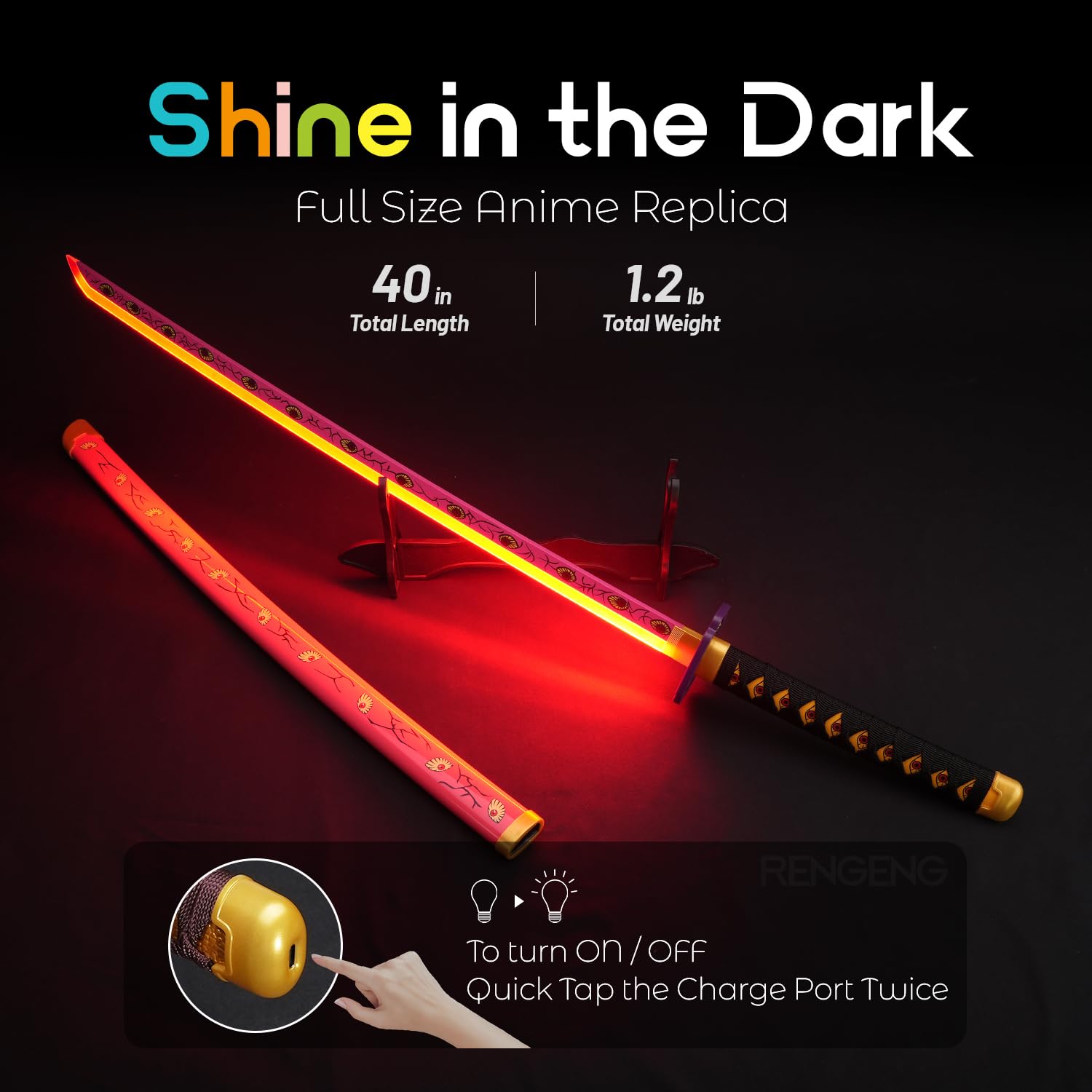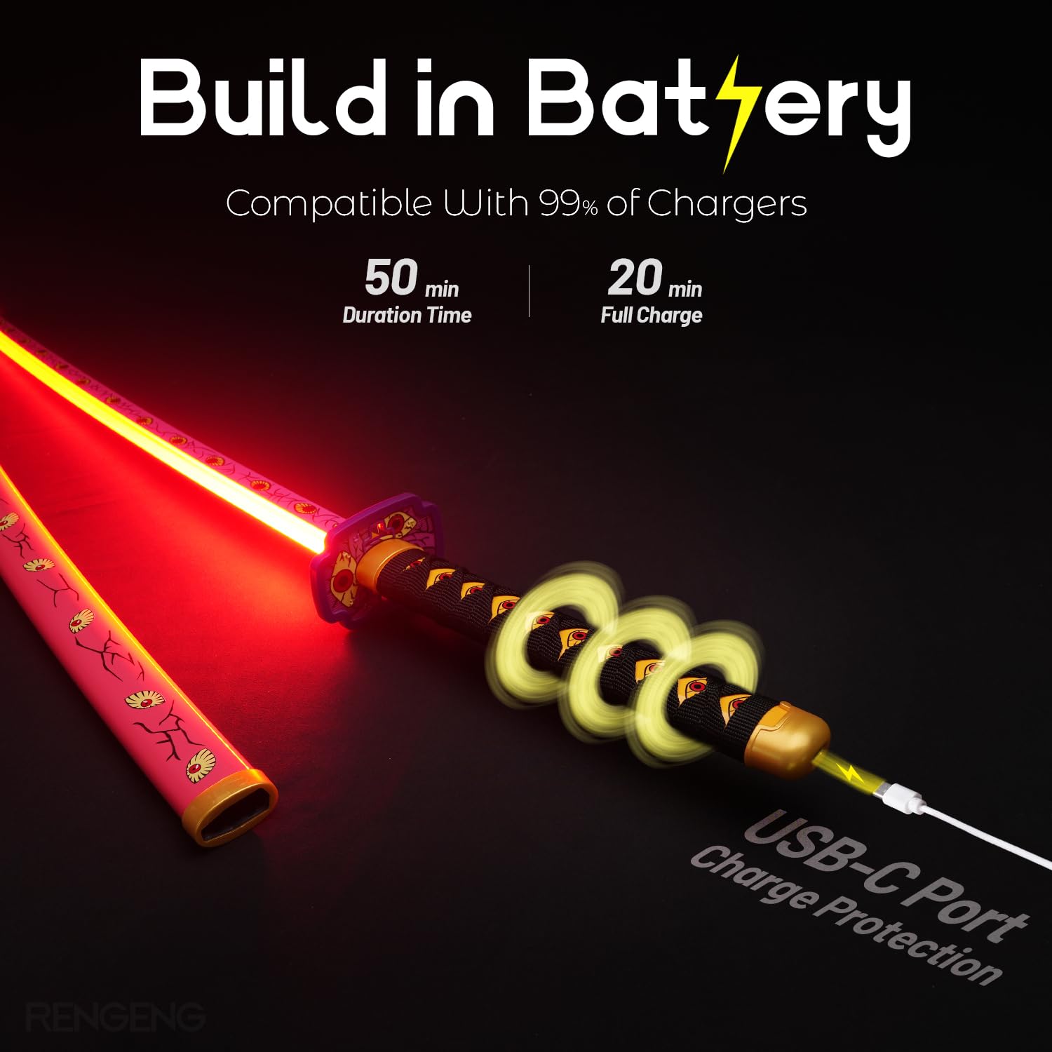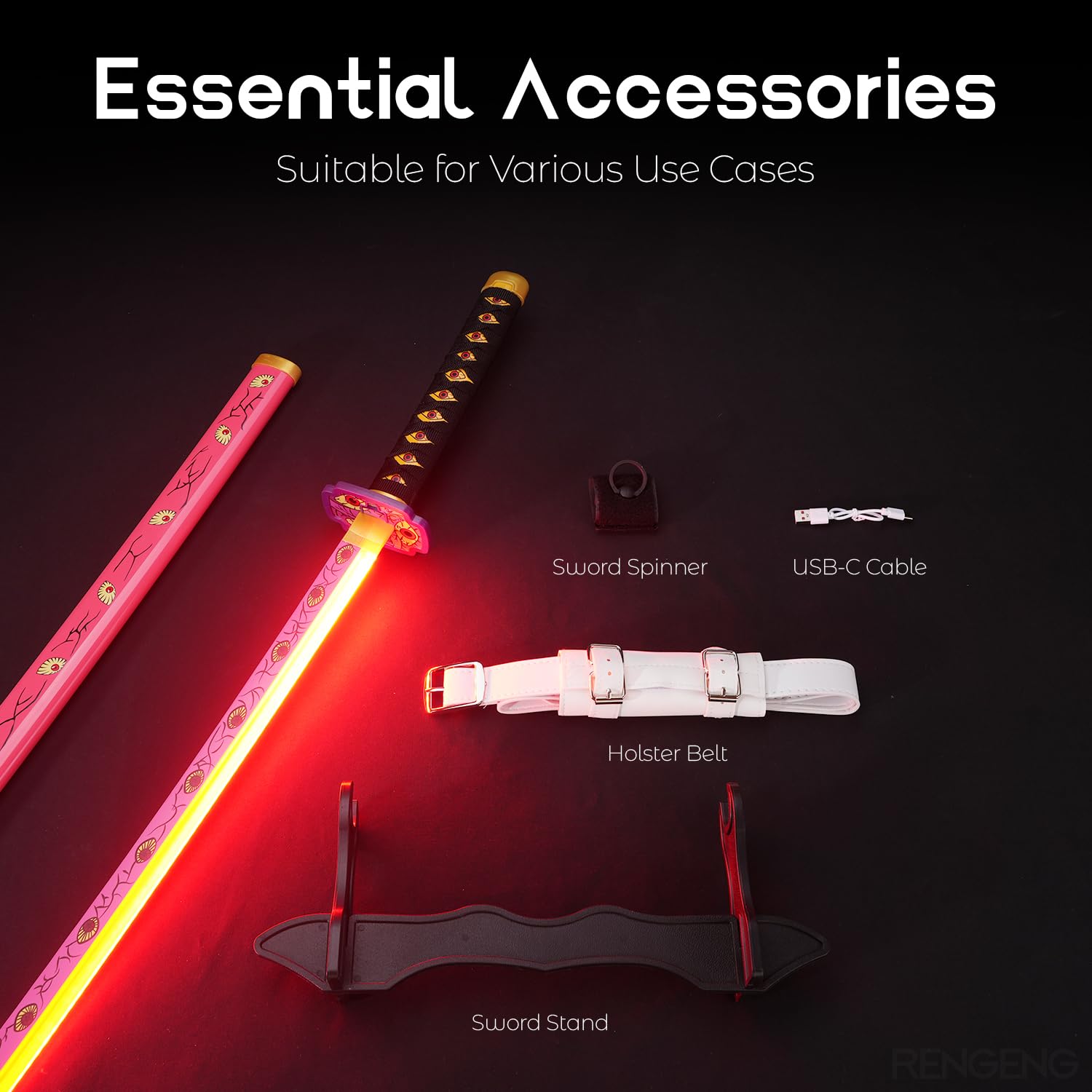 [Packaging Includes] This package contains: Light Up Sword x1, Holster Belt x1, Sword Stand x1, Sword Spinner x1, and USB-C Cable x1