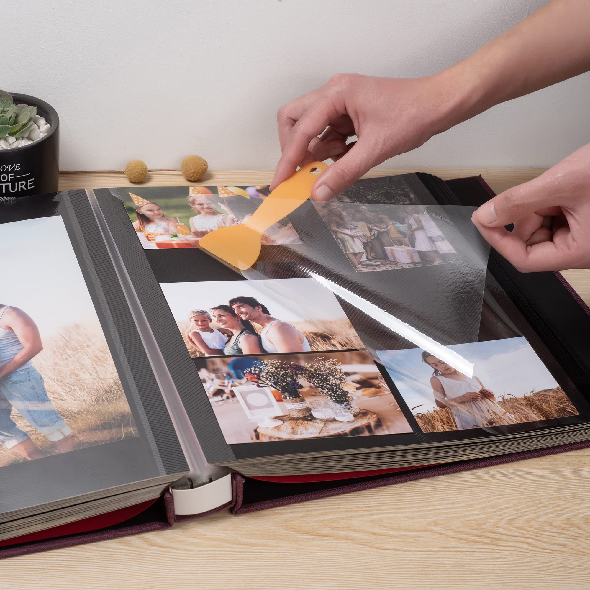 Self-adhesive design: suitable for any size photo, the page can be used repeatedly, free access to your precious photos. The included small scraper makes the protective film on the page more flat.
