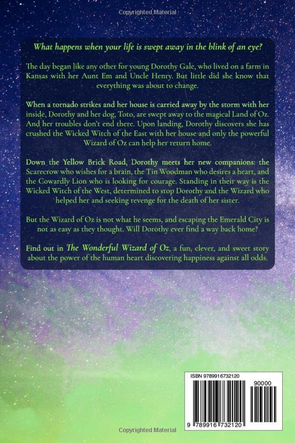 Enter a magical world of pure imagination with this classic unabridged edition of The Wonderful Wizard of Oz by L. Frank Baum. Now with over 150 high-quality classic illustrations by W. W. Denslow and a fun character quiz! When a tornado sweeps Dorothy and her loyal dog, Toto, away to the whimsical land of Oz, they find themselves in an impossible predicament. Not only has Dorothy’s house landed on the Wicked Witch of the East, but they can’t return home until they find the Powerful Wizard of this strange land. Following the Yellow Brick Road, Dorothy embarks on a journey to Emerald City, home to the Enigmatic Wizard of Oz, where she meets her unusual new friends. Dorothy encourages them to ask for help from the Wizard to grant their wishes: a brain for the Scarecrow, a heart for the Tin Woodman, and courage for the Lion. But as they wander through the vibrant land of Oz, they face packs of wolves, flocks of crows, haunted forests, and the malevolent Witch of the West in a battle that will determine their fate and the future of Oz itself. First published in 1900, The Wonderful Wizard of Oz has charmed generations with its unique characters and priceless lessons about friendship, bravery, and love. Whether you're revisiting this beloved classic or discovering it for the first time, this beautifully crafted collection will take you on an adventure like no other. Discover inside: 150+ high-quality, first-edition classic illustrations by W.W. Denslow. A fun quiz about Dorothy and her friends at the end of the book. A new cover design you’ll love. Easy-to-read formatting, ideal for young and adult readers. The Wonderful Wizard of Oz, one of the best classic novels for young boys and girls of all time, is perfect for book lovers and young readers, and an essential addition to any collection.