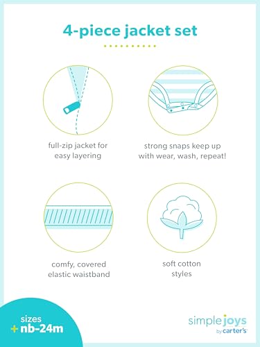 Description Dressing your little one is a breeze with the Simple Joys by Carter's 4-Piece Set, thoughtfully designed for everyday comfort and effortless style. This versatile set includes two short-sleeve bodysuits, a cozy zip-up jacket, and a pair of pants, offering endless mix-and-match possibilities for your baby boy’s wardrobe. The bodysuits feature expandable shoulders and snap closures for quick and convenient changes, while the soft cotton fabric ensures your little one stays comfortable all day. The pants, complete with a gentle stretchy waistband, provide a snug yet flexible fit, perfect for active crawlers and curious explorers. Adding an extra layer of charm, the zip-up jacket is adorned with playful prints and patterns that spark smiles and creativity.