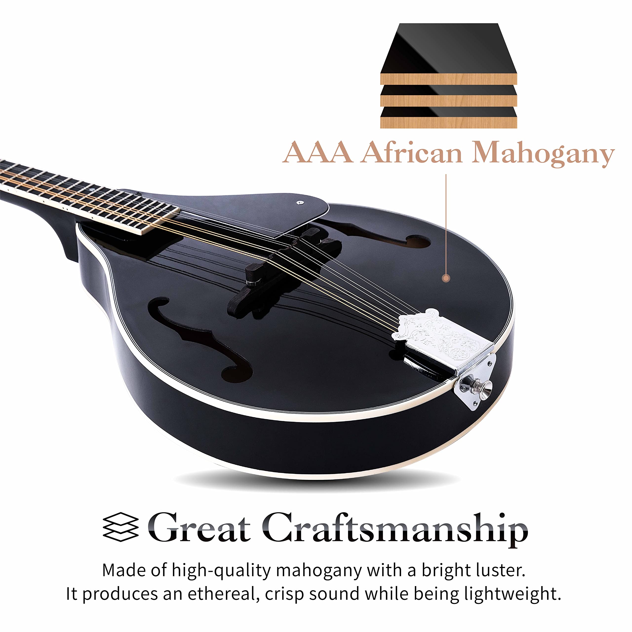 ♪ SOUND QUALITY: The sound produced by the Mulucky mandolin is composed of sound quality and timbre. The quality of the sound depends on the player, and the sound quality depends on the material and craftsmanship of the mandolin itself.