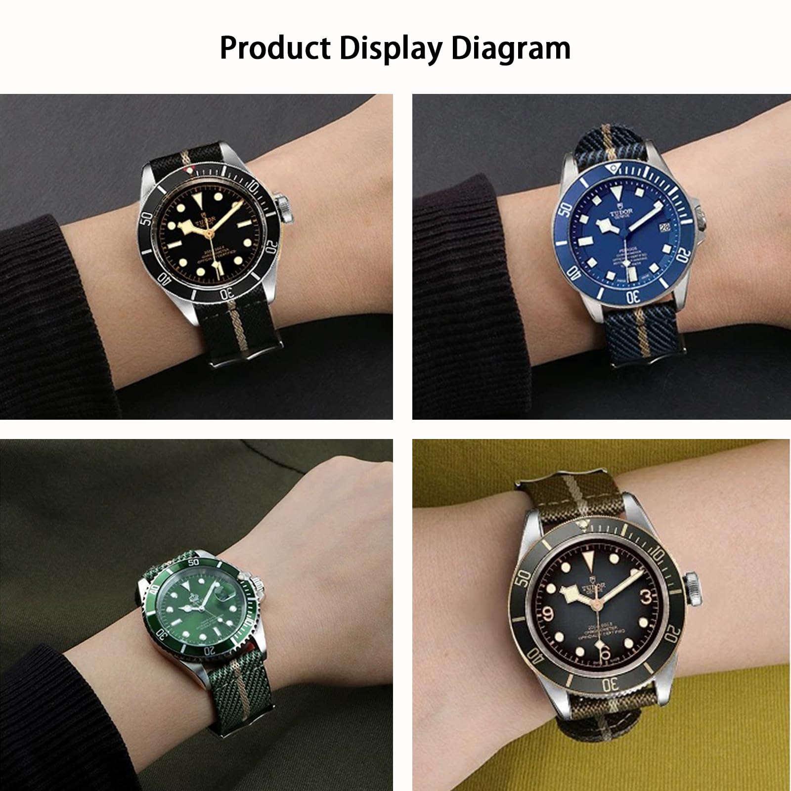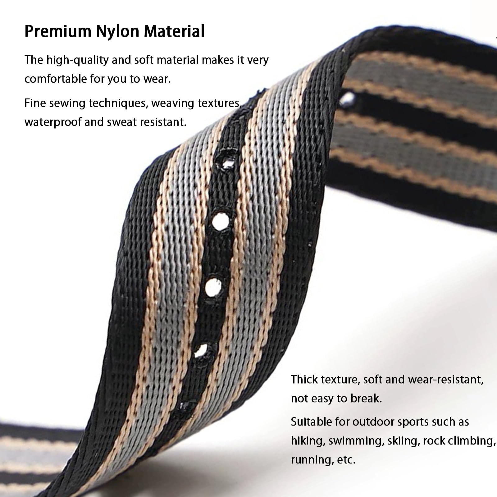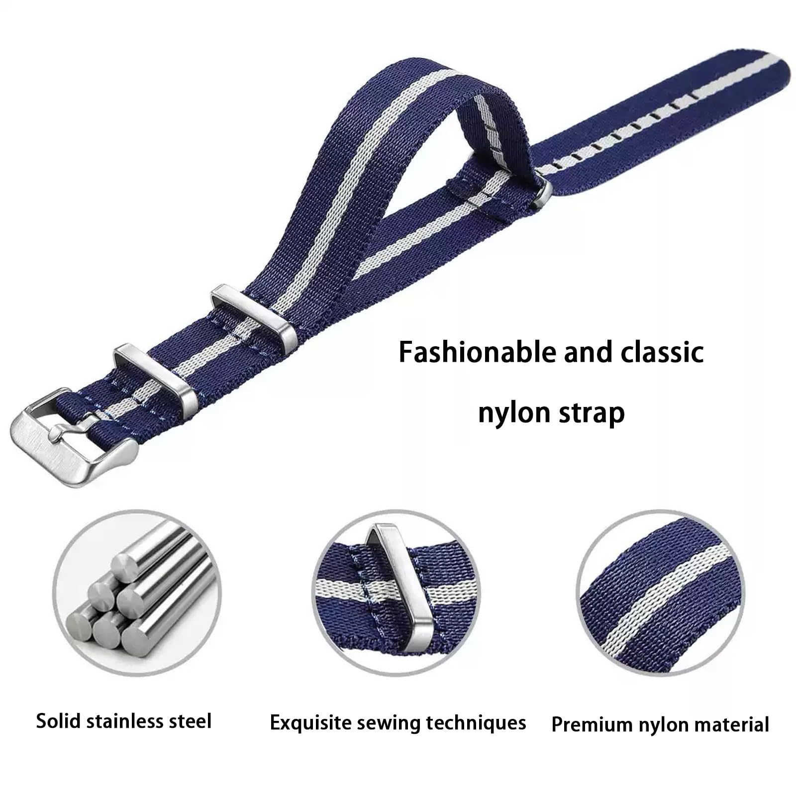 【Premium Material】Our nylon watch band are made of 1.5mm thick premium ballistic woven nylon materials, soft, breathable, lightweight and waterproof. And buckle fabricated from 316L surgical grade stainless steel. Nylon strap is heat sealed and stitched, Neat stitching make the band durable. The surface of the watch band is smooth, feels soft and comfortable. The heavy duty stainless steel buckle is also the latest fashion style, solid and sturdy at the same time.