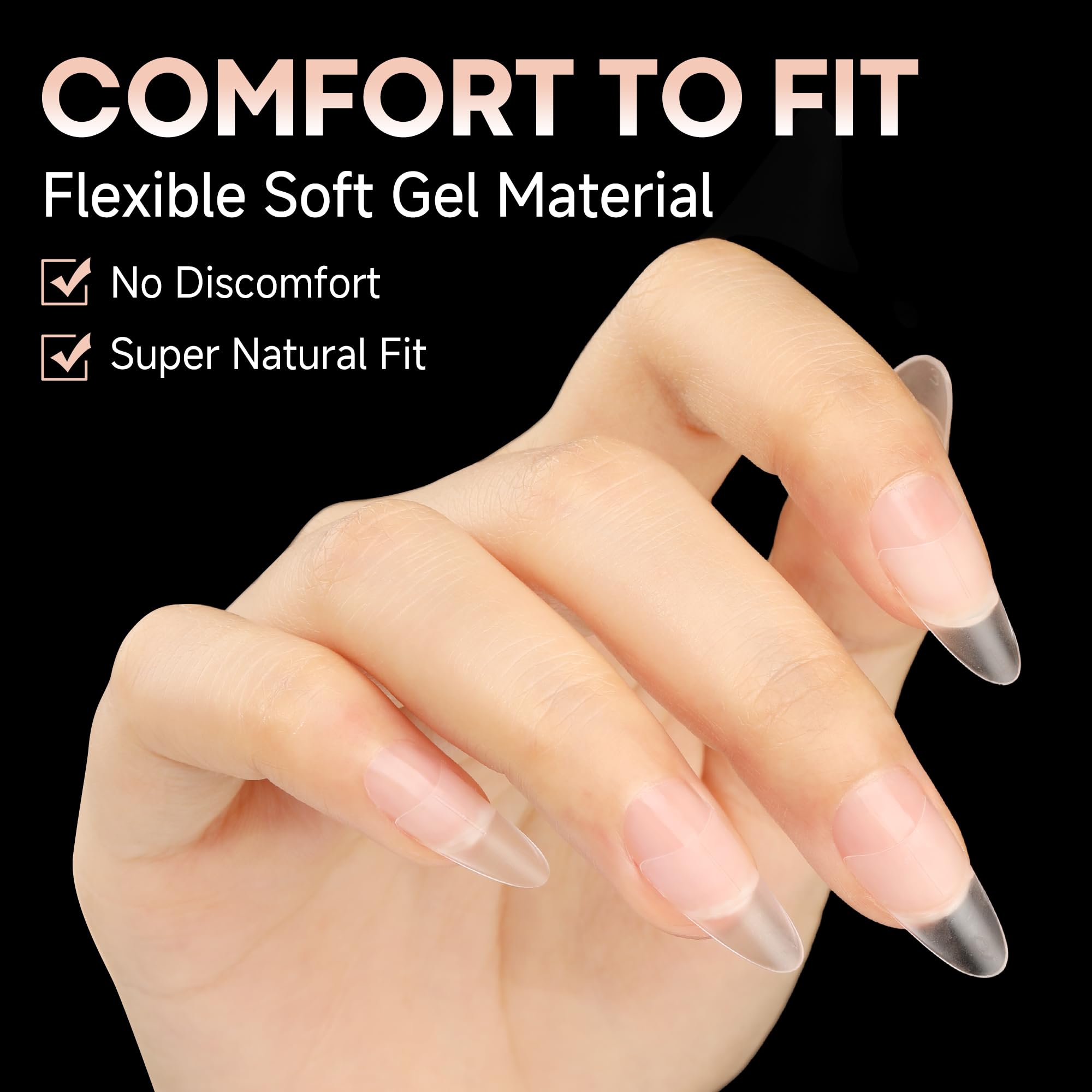 💅NATURAL FITTING EFFECT-The medium almond gel nails are made of premium soft gel material, flexible, tracelss and comfortable. No matter how pinched, the gel nail tips will quickly return to its original shape without leaving any creases. Upgraded with "thick front, ultra thin back" design, the front edge is break-resistant and better fit nails. Give you salon-level nail art enjoyment.