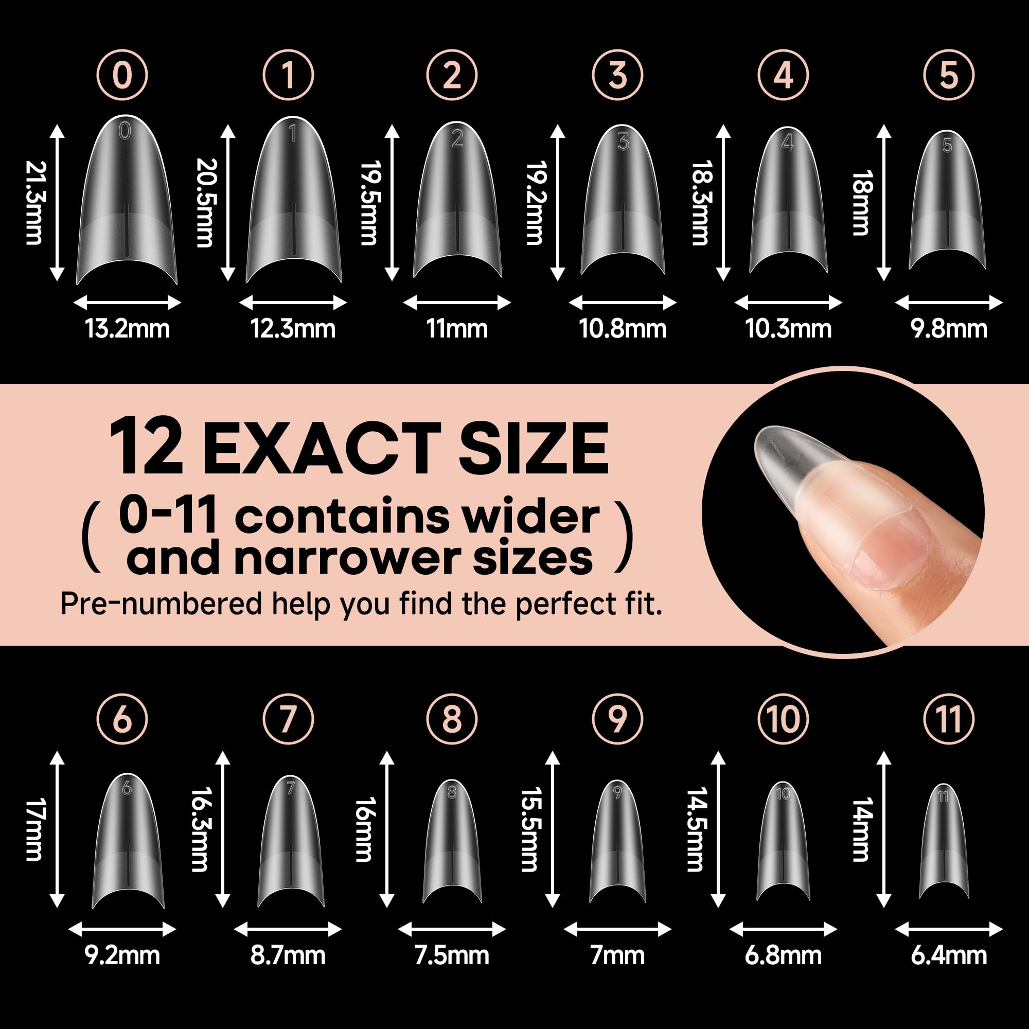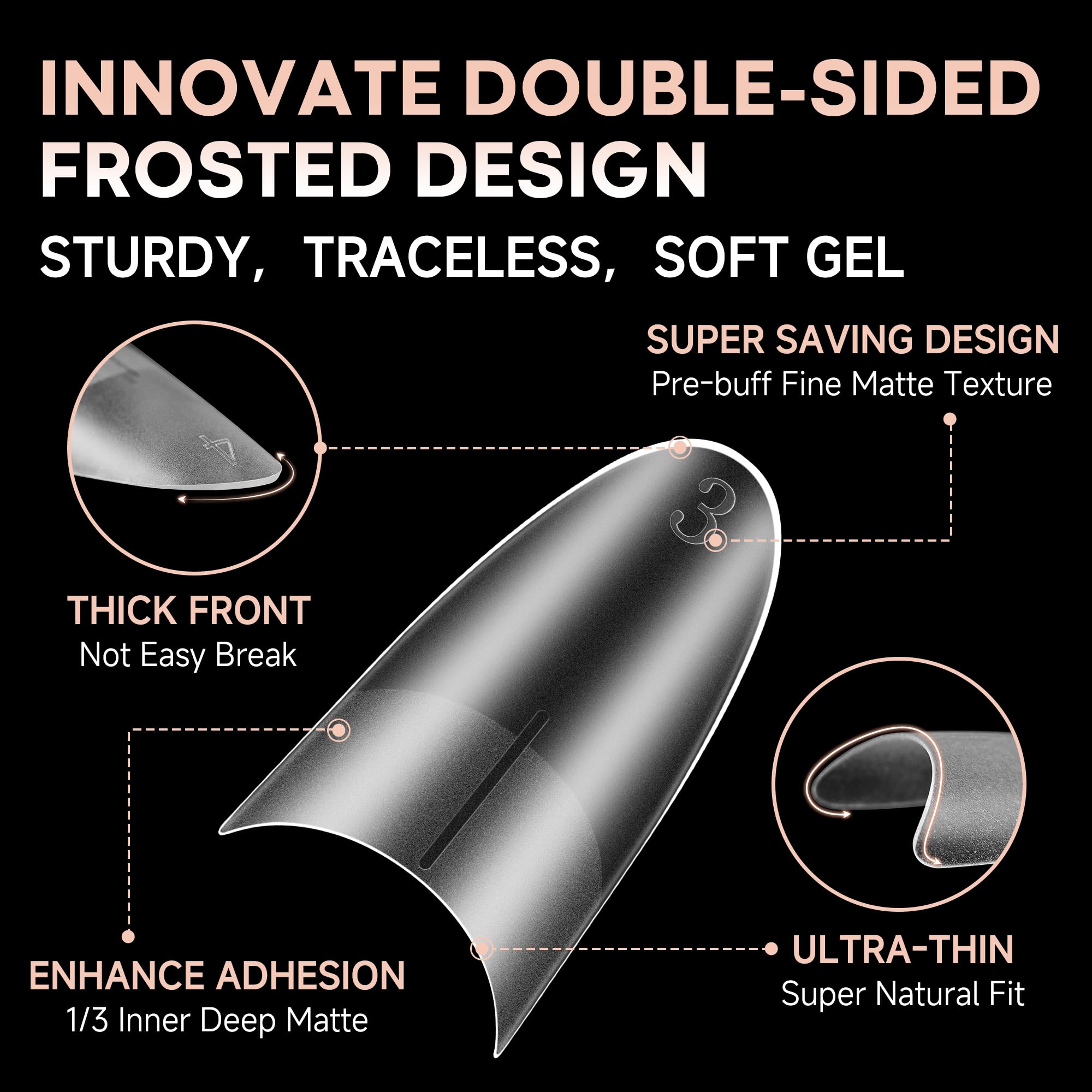 🎉 NEWLY DOUBLE SIDE MATTE TEXTURE-Our medium almond gel nail tips feature new double-sided matte nail tips design, no extra filing required! The outer wall makes it easier to apply nail polish and gives a glossy finish. The inner deep matte firmly adheres to the nail without worrying about the nail pop off easily. Easily get beauty that lasts 28+ days. We are committed to bringing you professional, efficient and safe nail care.