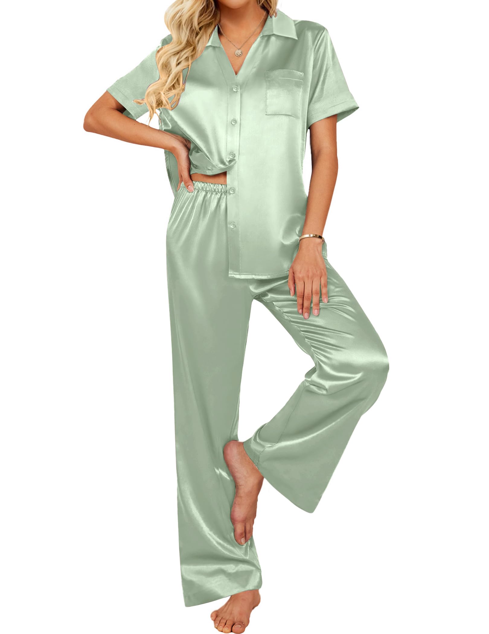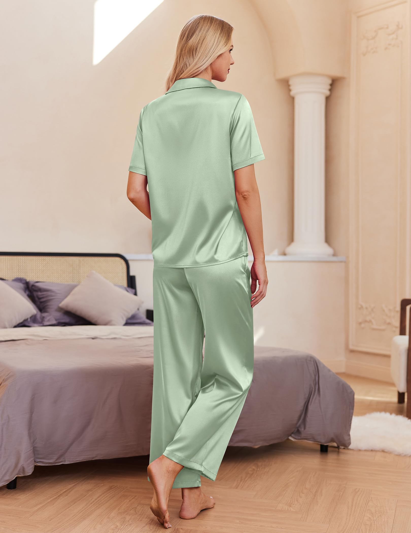 Material: Silk pajama set is made of premium lightweight, breathable and skin-friendly fabric, just like wrapped in a cloud, helping you have a sound sleep