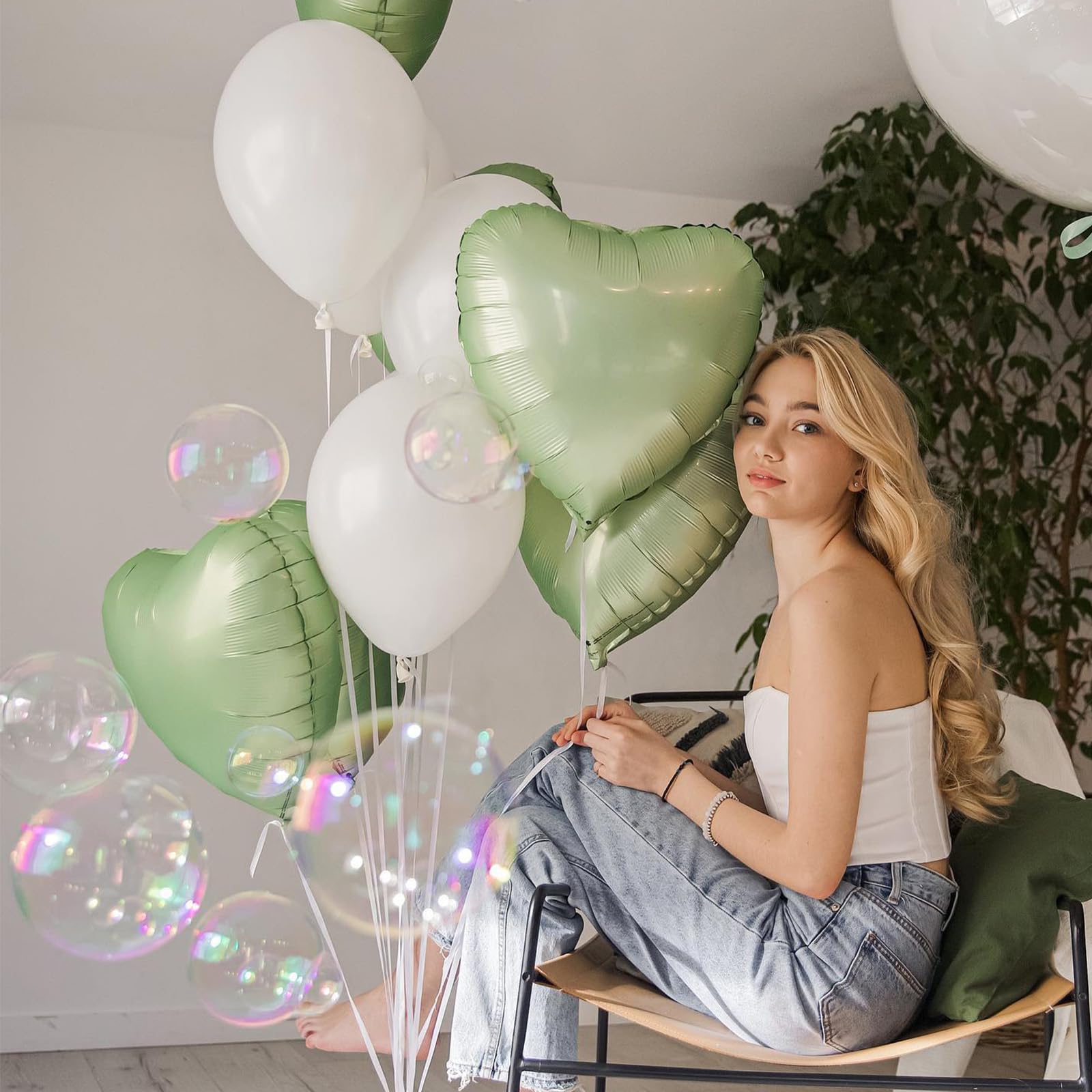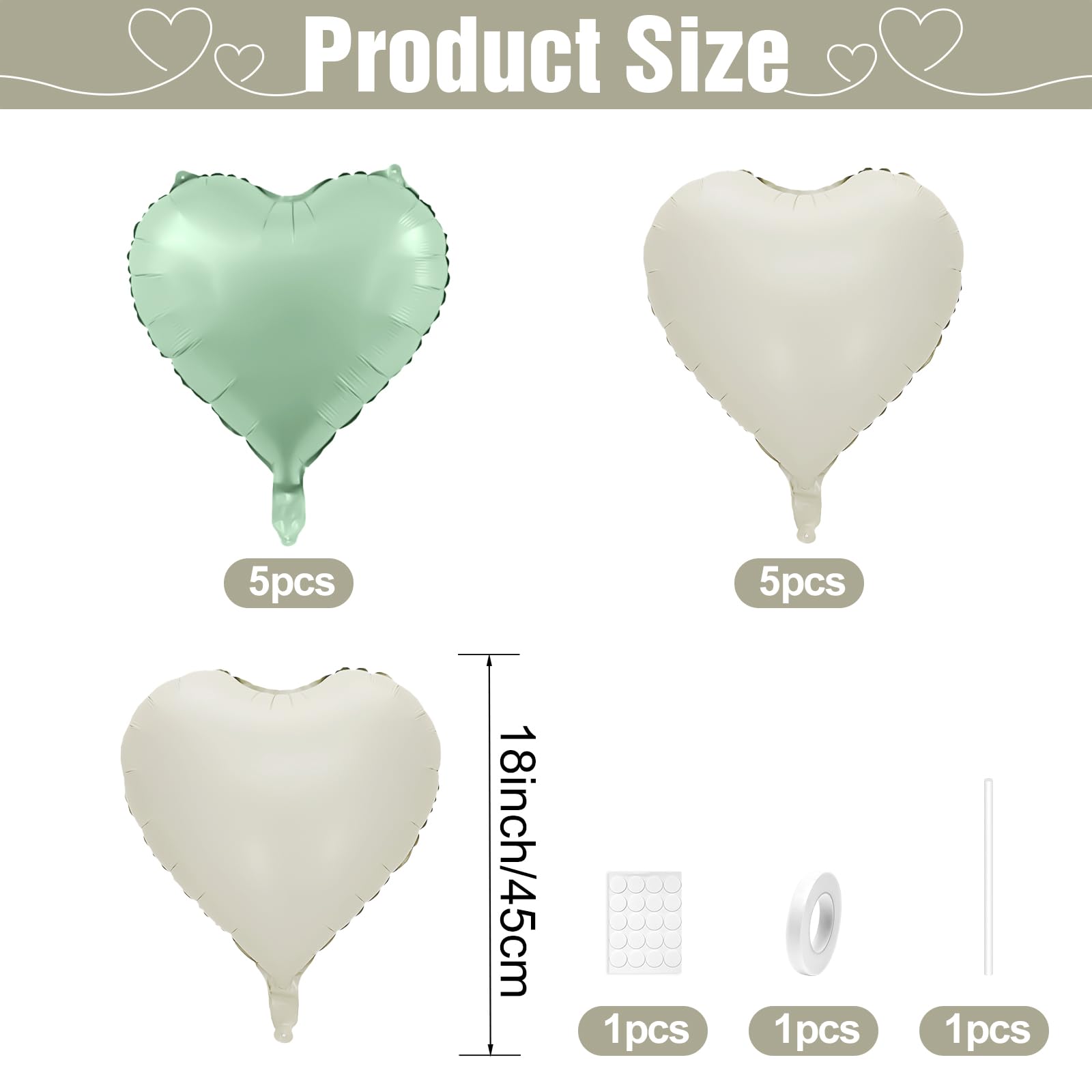 " Heart Balloons – 10PCS Elegant Foil Heart Balloons for Party Decorations Description: Key Features: 10PCS Premium Heart Balloons – Includes 5 olive green and 5 cream white 18-inch heart-shaped balloons with ribbons. The generous size makes them ideal for eye-catching party decor. High-Quality Material – Crafted from durable polyester film with embossing technology, these balloons are non-toxic, odorless, and resistant to leaks and bursts. Suitable for helium or air inflation, they maintain their elegant appearance throughout your event. Easy to Inflate & Reuse – Simply fill with helium or air (inflate up to 90% capacity to prevent overexpansion). Includes a straw for easy deflation, allowing you to store and reuse the balloons for future celebrations. Versatile for Any Occasion – Perfect for Valentine’s Day, Mother’s Day, birthdays, baby showers, engagements, bridal showers, weddings, anniversaries, and photo backdrops. Ideal for both indoor and outdoor decor. Usage Tips – Minor color variations may occur due to different production batches (please refer to the actual product). Avoid over-inflating or contact with sharp objects to extend balloon life. For a floating effect, use helium; for fixed decor, air works perfectly. "