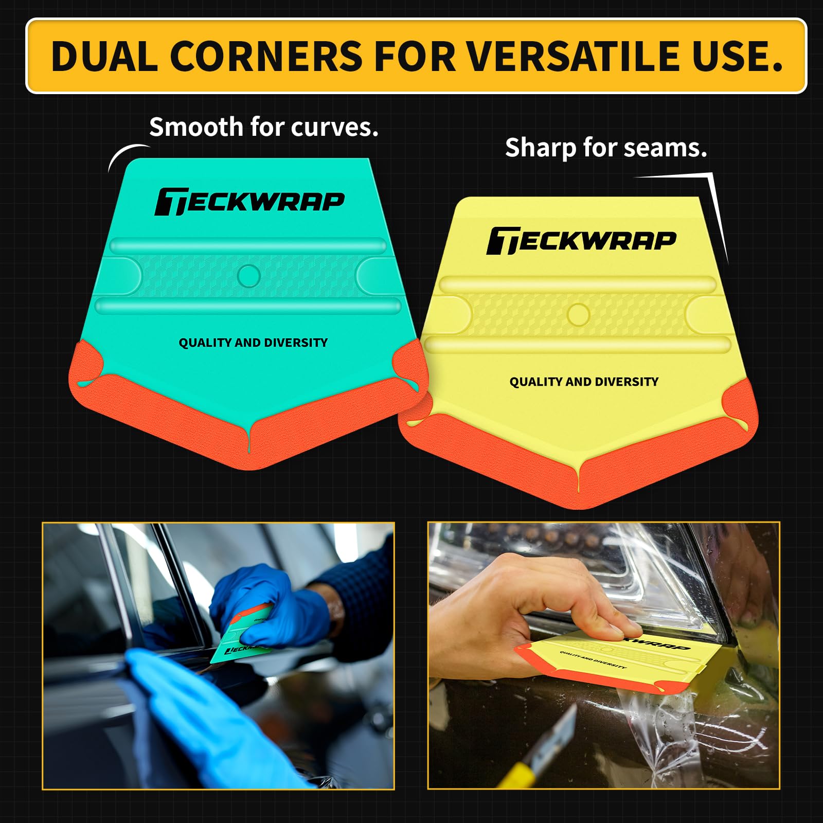TECKWRAP V-Shape Felt Squeegee brings superior control to challenging vinyl applications. Its unique angled silhouette is optimized for tight curves, edges, and recessed surfaces—making it a favorite for complex sections like headlights, mirrors, and bumpers. Ergonomically enhanced with twin ribs, it stays firmly in your hand, reducing the risk of slipping even during long installations or when wearing gloves. The dual-corner design features one rounded edge for gentle contours and one sharp edge for deep creases or trimming work. With two hardness levels to choose from—Yellow (40A) for soft films like PPF or chrome, and Blue (50A) for slightly firmer vinyl—this tool adapts to your material and task. The integrated velvet felt ensures every pass is smooth, clean, and scratch-free. Ideal for precision work and wrap professionals who demand both flexibility and accuracy.