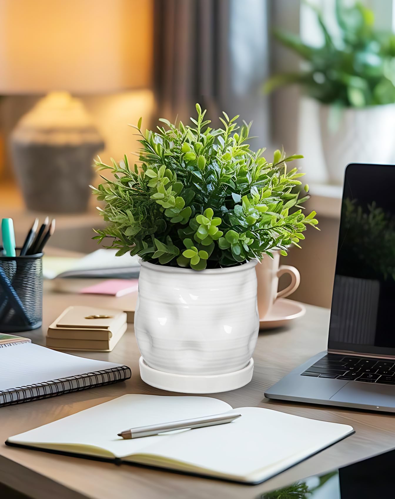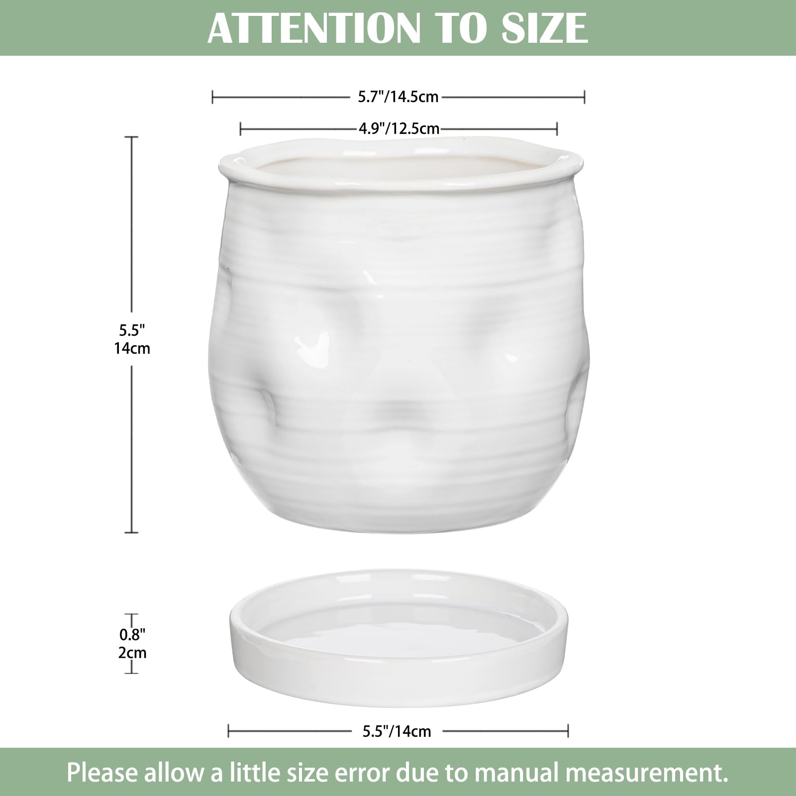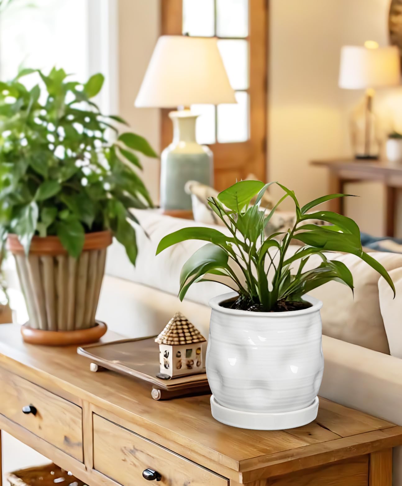 Indoor Planters with Drainage and Tray--Bring Handcrafted Harmony to Your Home Add a touch of artisan charm to your indoor or outdoor space with our collection of indoor flower pots. Available in a serene Sage Green, a crisp White, and a rich Seafoam, each planting pots indoor brings its own unique character while sharing the same exceptional craftsmanship. The artful, hand shaped texture and soft, undulating rim give every planter an organic, one of a kind feel, enhanced by a delicate cream accent line for a refined finish. Designed for both beauty and function, this ceramic planter pot is an ideal home for most small to medium plants. Its 4.9 inch opening provides ample room for succulents, herbs, or a budding snake plant. The integrated drainage hole and matching saucer work together to support a healthy root environment, offering both convenience and protection for your surfaces. With its minimalist cylindrical silhouette, this round planter seamlessly complements a variety of decor styles. It brings a natural, calming element to modern shelves, adds earthy texture to boho-chic tables, or provides a classic accent in farmhouse kitchens. Whether used singly as a statement piece or grouped for greater impact, it helps you create your own personal oasis. Ready to gift or to elevate your own plant display, this ceramic flower pots combines thoughtful design with everyday versatility. Note: Plant are not included. Please allow 1.5"-2" differs due to manual measurements. Due to different light settings the actual color might vary a bit from the pictures. Since ceramic succulent pots are fragile products, you will receive a satisfactory solution if you receive an unsatisfactory product.