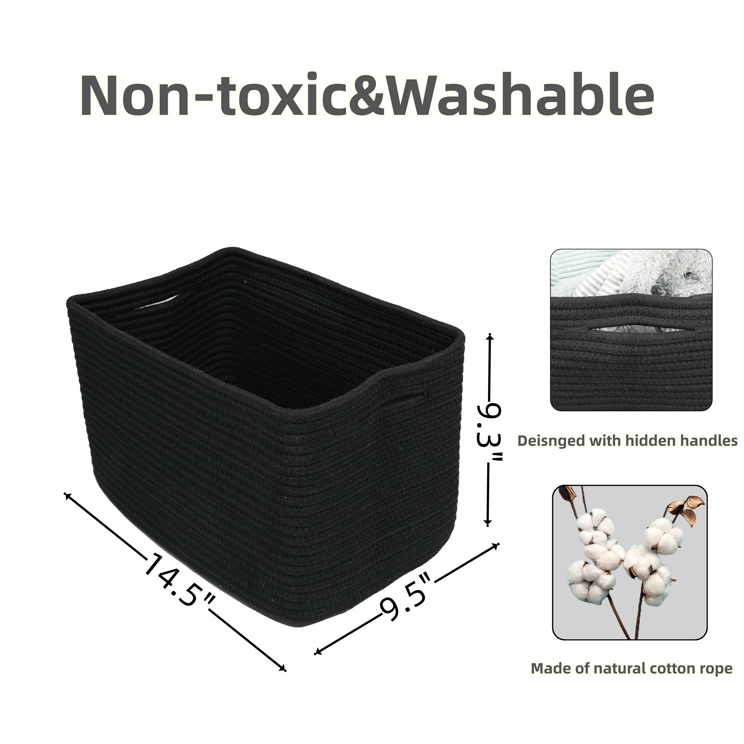 1, Medium to Large rectangle woven basket for storage: Our rope basket with handles size is 14.5”X9.5”X9.3”. Designed as home storage basket for organizing. Could use as toy basket, pet basket, book basket, towel basket, clothes basket, nursery basket, wicker basket for storage and more. Perfect as storage basket for shelves or closet storage bins to store household items.