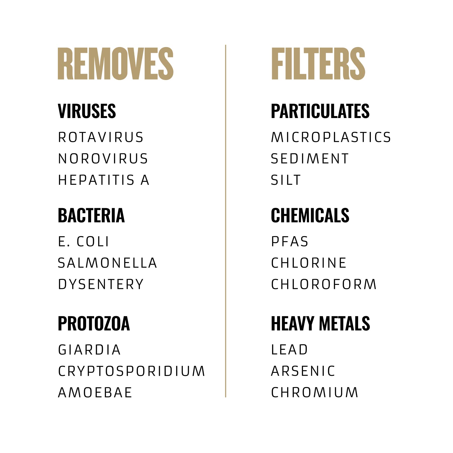 REMOVES WATERBORNE PATHOGENS, including viruses, bacteria, and protozoan cysts (e.g. rotavirus, hepatitis A, norovirus, giardiasis, cryptosporidium, E. coli, cholera, salmonella and dysentery, and more)