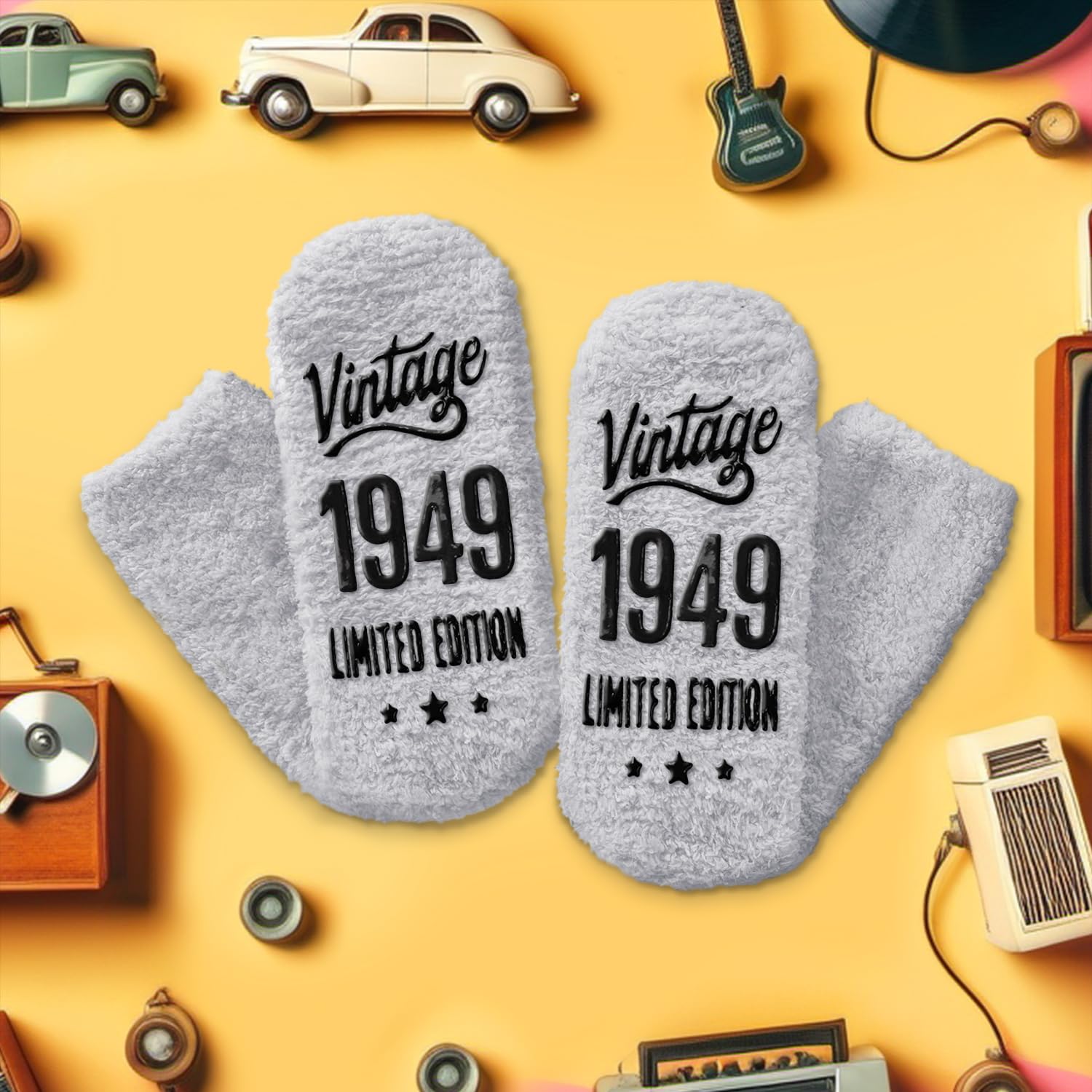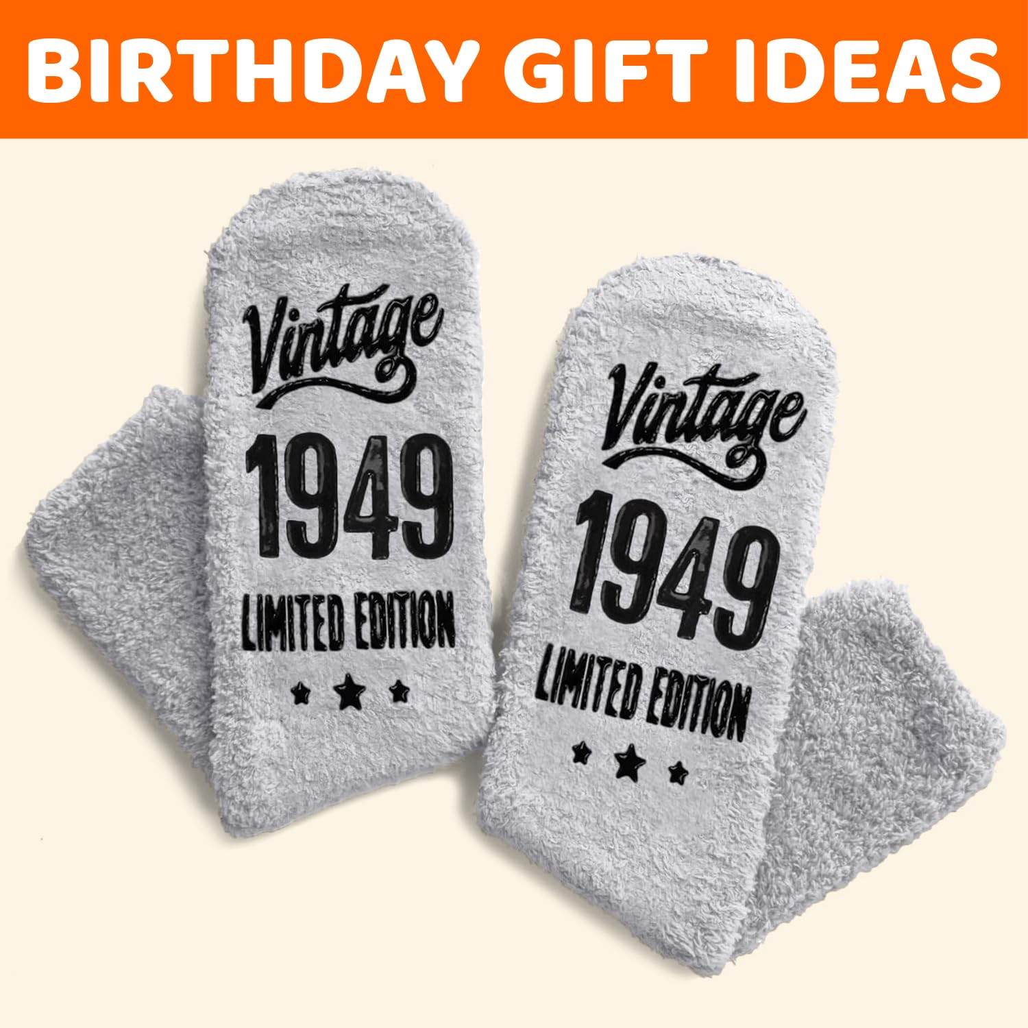 1949 BIRTHDAY GIFTS: Give him this perfect 76th birthday gift to remind him of how happy he is. His smile will get even wider when he reads the words "Vintage 1949 LIMITED EDITION." Practical, emotional, and humorous, this pair of birthday socks makes a great gift if your friend or family member was born in 1949!