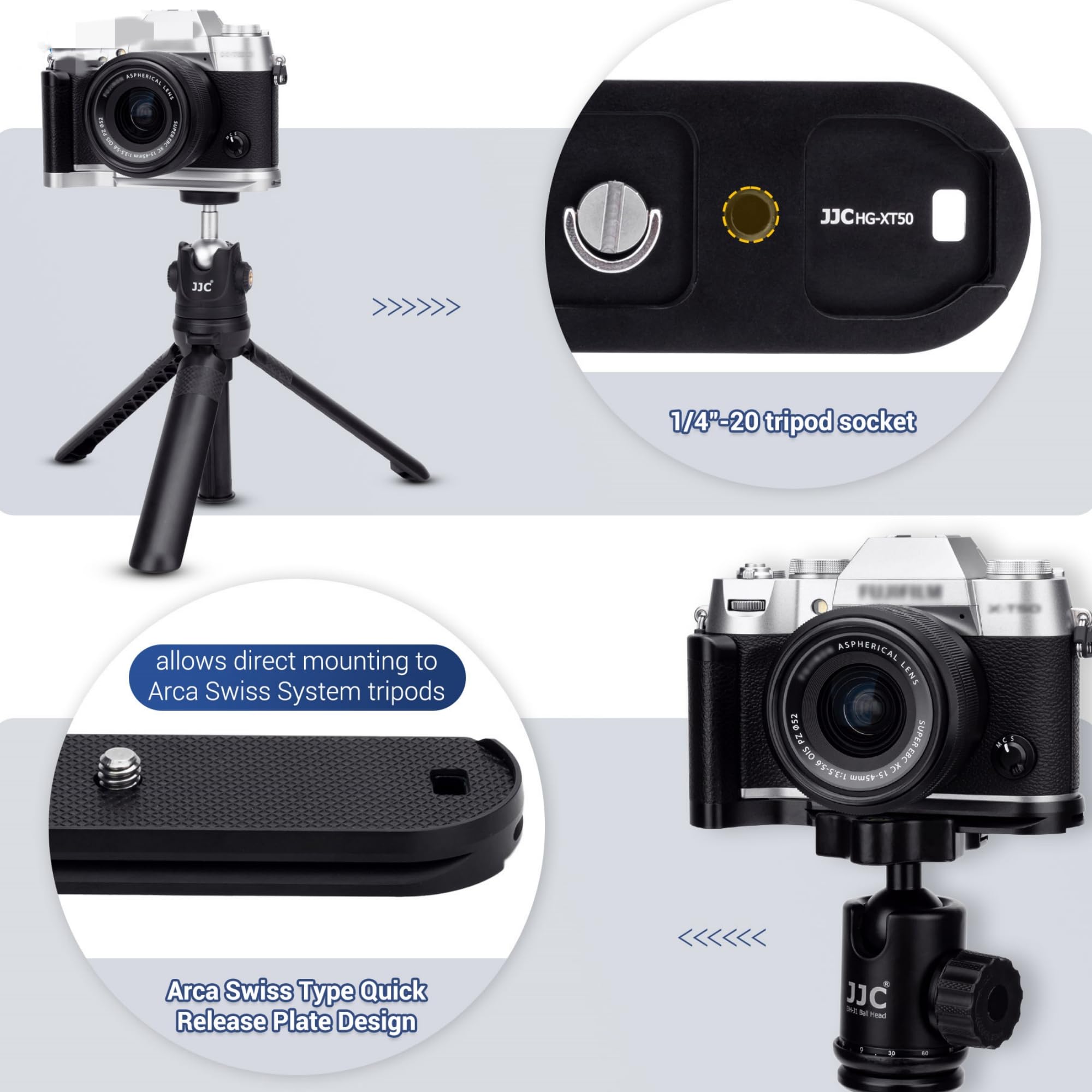 This XT50 hand grip adopts an Arca-Type quick release plate design and you can slide this grip with the camera onto an Arca-Type ball head directly. The bottom of the grip has a 1/4"-20 female thread for mounting the camera to a stand or tripod.The slanted edge of the handle is designed to make it easy to open and close the camera's folding screen.
