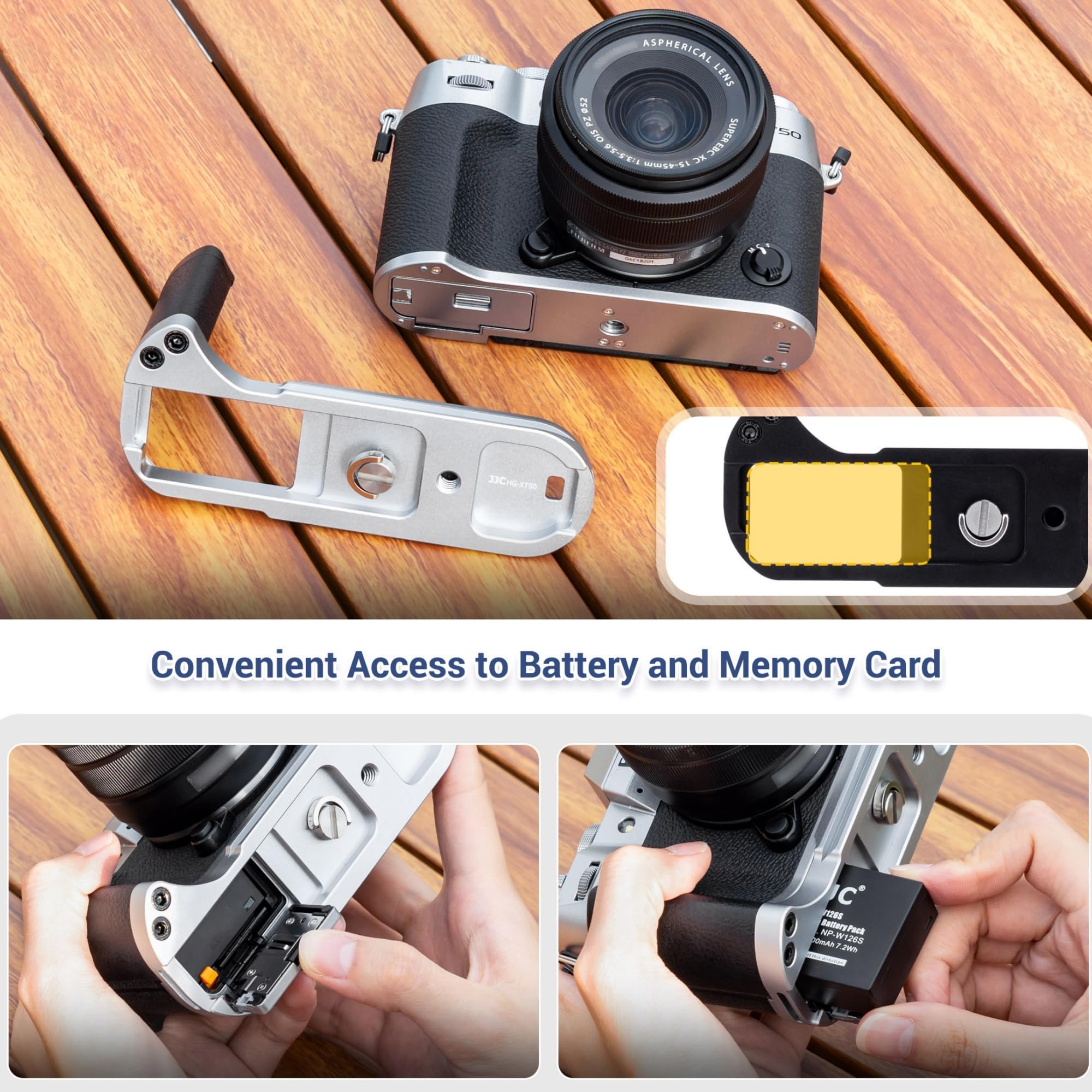 The design at the bottom of the handle allows you to install batteries or memory cards easily without removing the handle,and this XT50 handgrip features an eyelet for the camera strap, which allows you to connect the camera hand strap.