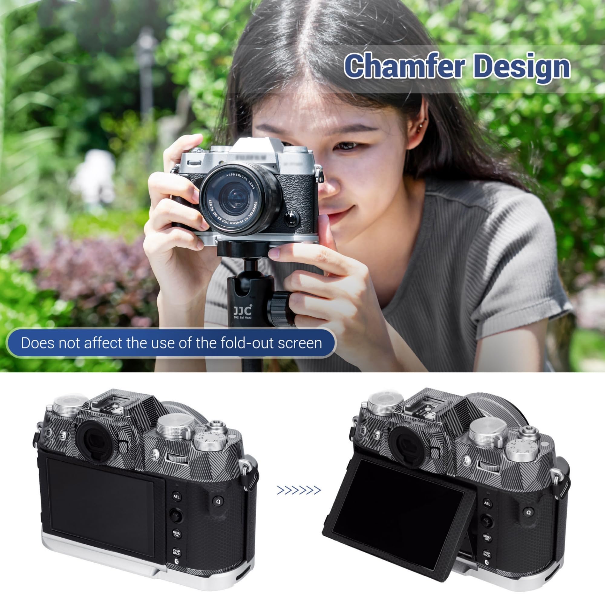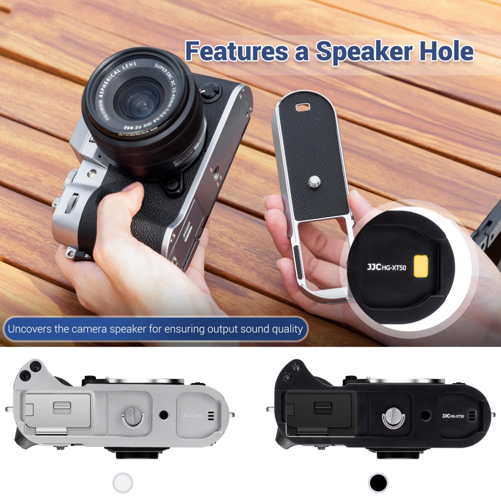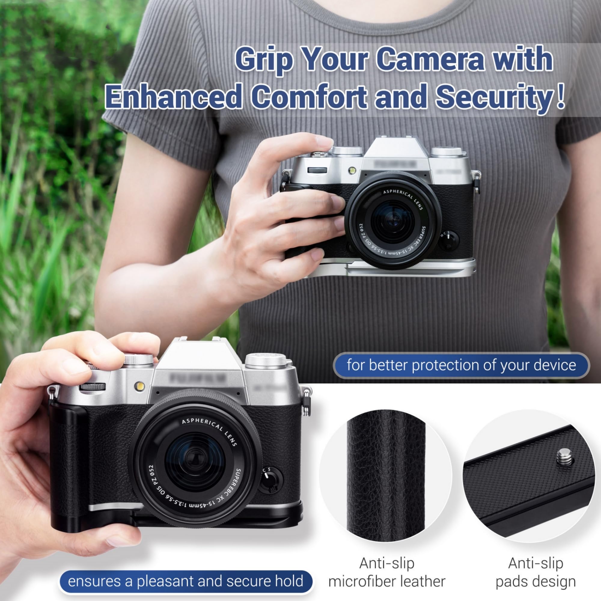 Made of aluminium alloy,it is sturdy and durable.The microfibre leather on the surface of the grip is not only non-slip but also comfortable ,and the non-slip pad design of the handle also provides extra protection for the camera, providing a stable and secure X-T50 grip.