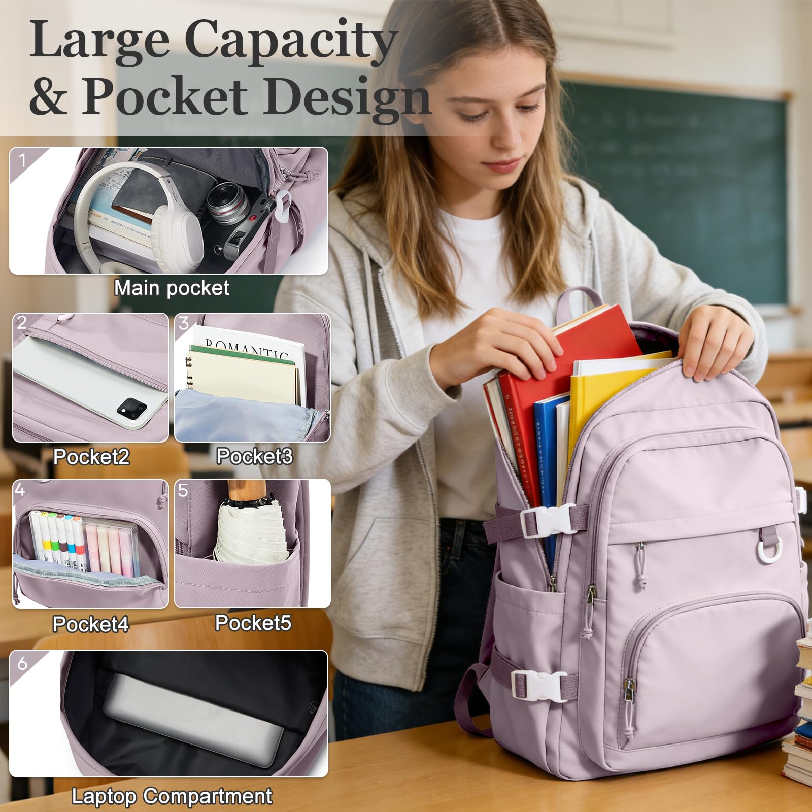 EXTRA LARGE CAPACITY】 This backpack offers plenty of storage space, perfect for everyday use. The backpack has four pockets of varying sizes to keep your laptop, iPad, mobile power, camera, books, and anything else you need to keep your belongings organized. In addition, there is a separate computer compartment in the main pocket that can hold up to a 15.6-inch laptop.