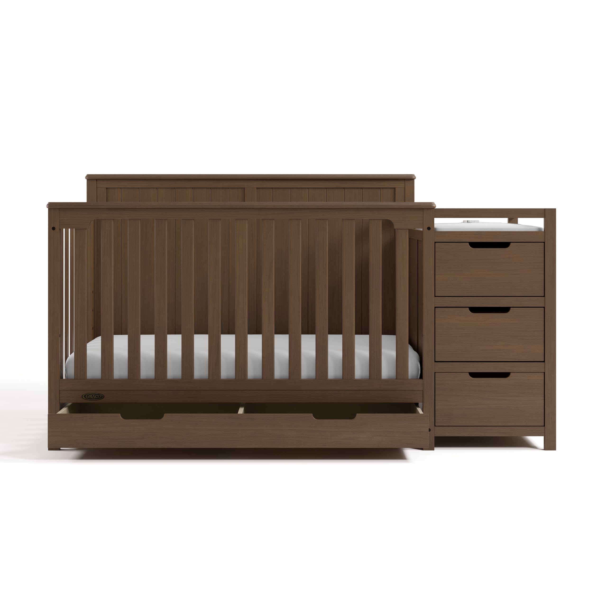 The Graco Hadley 5-in-1 Convertible Crib and Changer with Drawer was designed with safety, innovation, and convenience in mind. Available in White, Espresso, and Pebble Gray baby-safe, non-toxic finishes, the Hadley features a spacious drawer for easy storage of nursery essentials, and converts from crib to toddler bed, day bed, and full-size bed to grow with your baby throughout life’s multiple stages. Like all Graco cribs, the Hadley is Baby Safety Alliance Verified and is meticulously tested to meet or exceed all applicable Consumer Products Safety Commission (CPSC) and American Society for Testing and Materials (ASTM) safety standards to ensure the safest sleeping environment for your child. The Graco Hadley 5-in-1 Convertible Crib and Changer with Drawer features an attached changing table, complete with a water-resistant baby changing pad with safety strap, as well as 3 drawers and 2 open shelves. This all-in-one crib is backed by a 1-year limited manufacturer's warranty. To complete your Graco crib, we recommend pairing it with the award-winning Graco Premium Foam Crib and Toddler Bed Mattress. Easy assembly required. Mattress not included. Crib conversion kit sold separately.