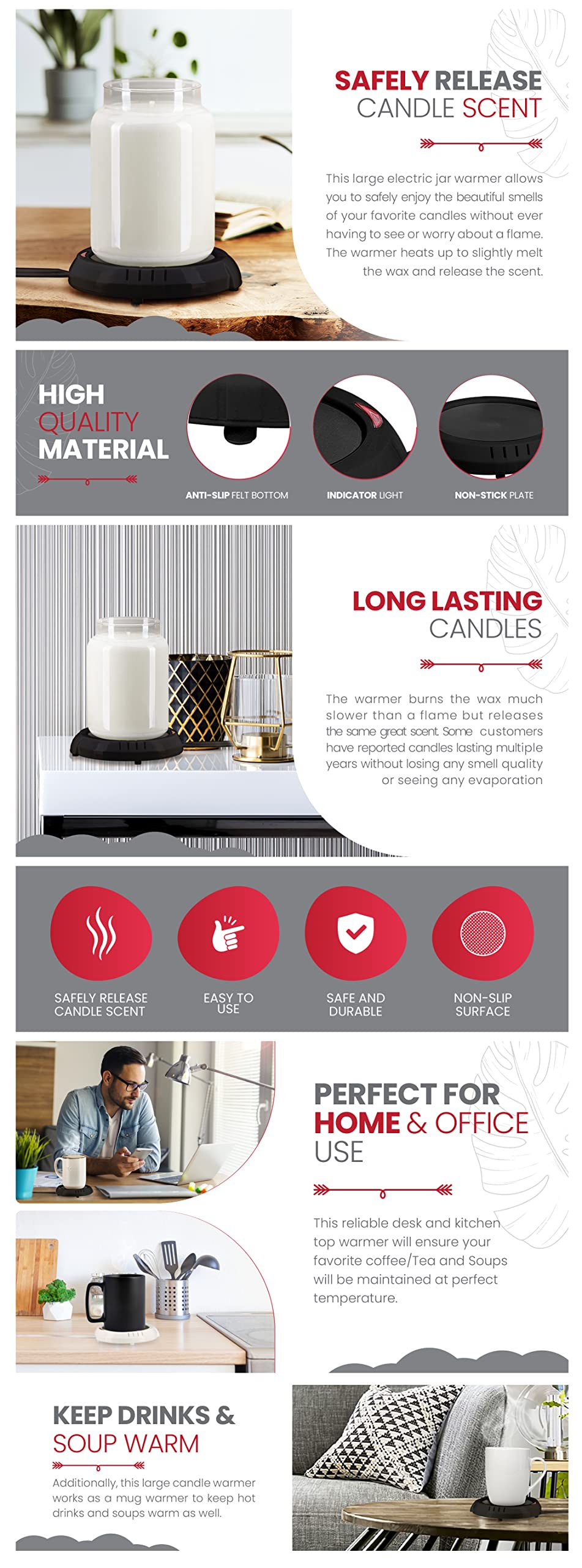 HOME AND OFFICE USE: This reliable desk and kitchen top warmer will ensure your favorite coffee/Tea and Soups will be maintained at perfect temperature.