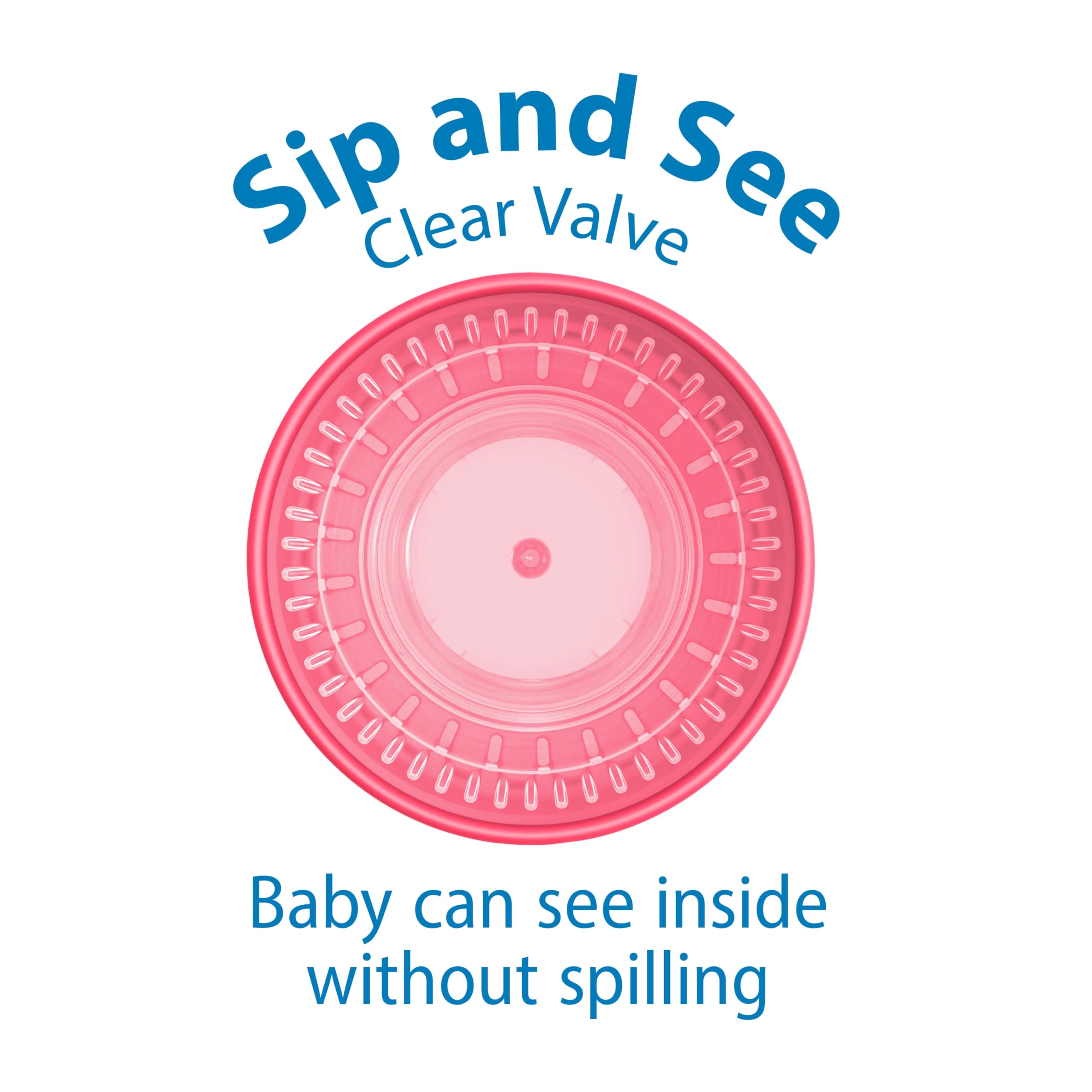 SEE INSIDE. The Sip and See Silicone Valve lets baby see inside the cup without spilling, and translucent sides let you see when it’s time for a refill.