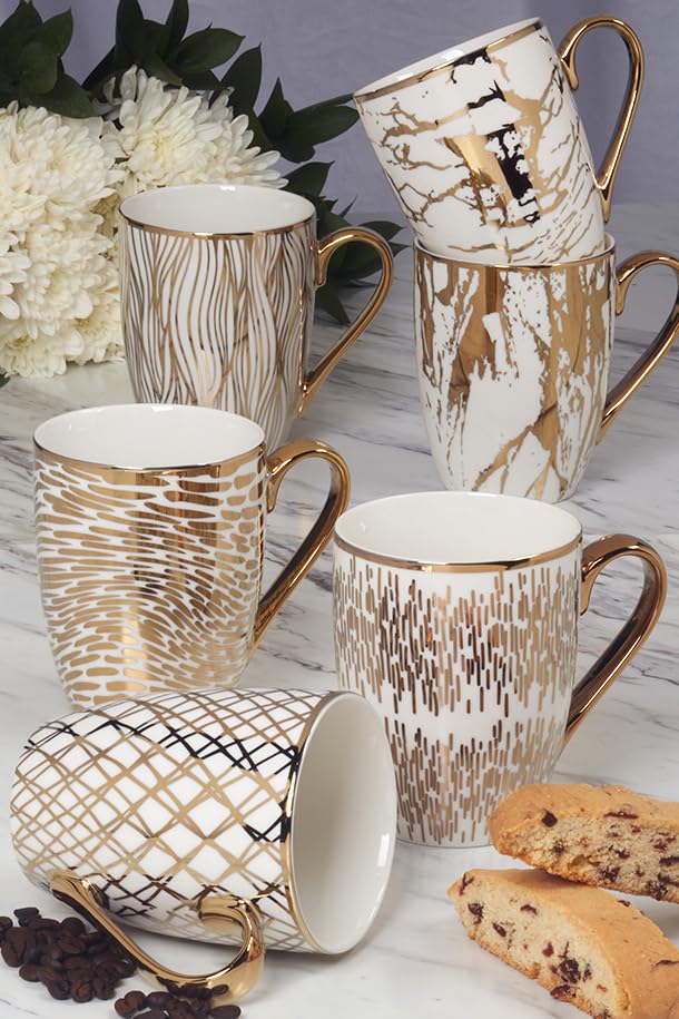 Unique Gold Designs on White Porcelain: Admire six distinct Gold Rim porcelain Mug designs on each Designer Coffee Mug in the set. The White and Gold Coffee Mugs bring a stylish, modern touch to any decor, enhancing both everyday use and special occasions.