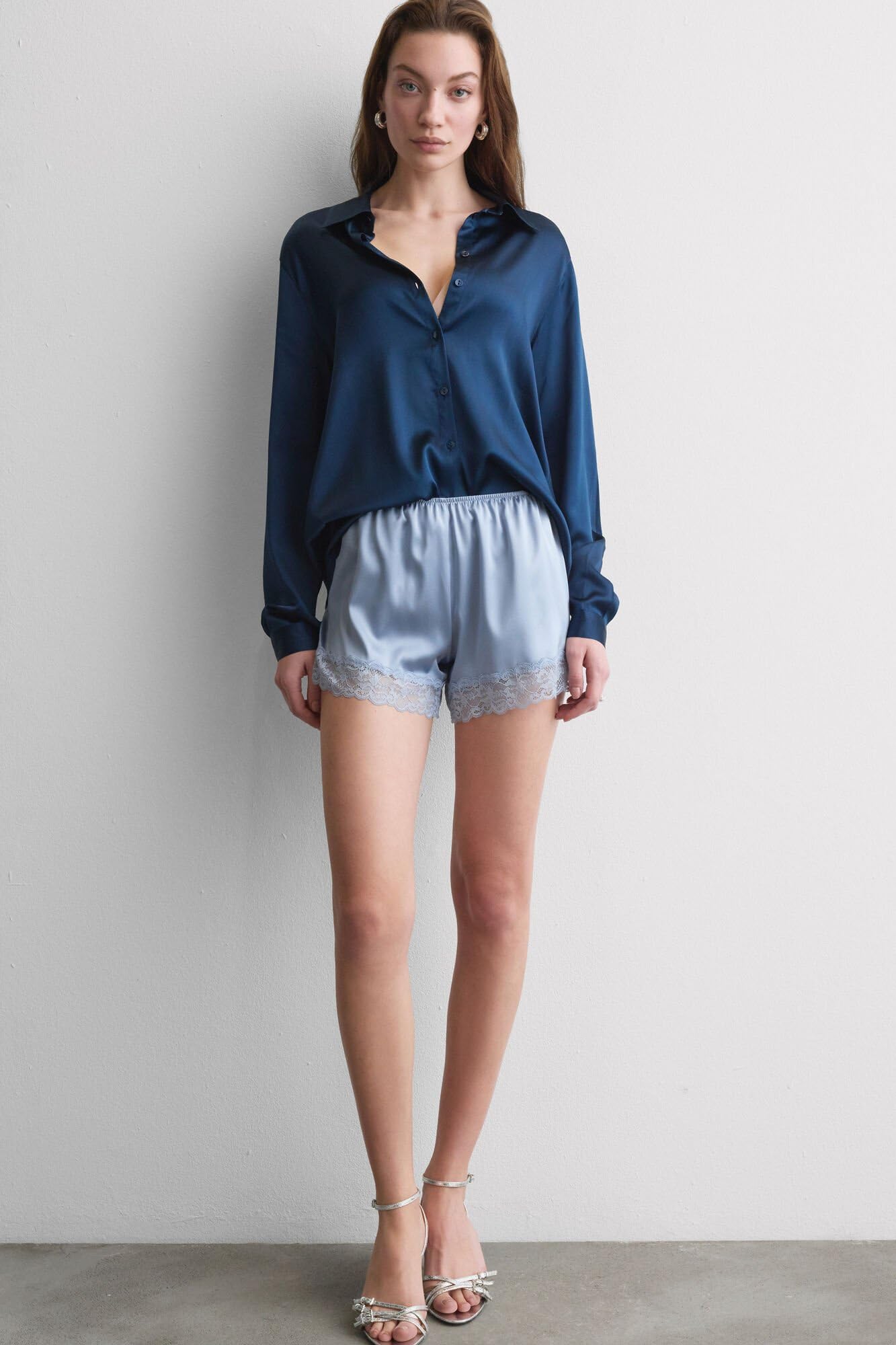 Description Our lace trim silk shorts are the definition of understated elegance, crafted from light stretch silk satin that drapes beautifully and feels soft against the skin. The delicate lace ruffle at the hem adds a romantic touch, turning a simple silhouette into something effortlessly refined. Perfect for wearing as nightwear or pairing with matching silk tops, these shorts bring a sense of quiet luxury to your everyday moments. The regular fit is designed for comfort, allowing the silk to flow naturally with the body. Smooth and breathable, the fabric feels cool and lightweight, making these lace nightwear shorts a pleasure to slip into after a long day. Subtle stretch ensures ease of movement, while the refined finish makes them versatile enough to style as loungewear too. Crafted from Bluesign certified silk, our lace trim shorts reflect Intimissimi’s commitment to both quality and sustainability, creating a piece you’ll love to wear season after season.