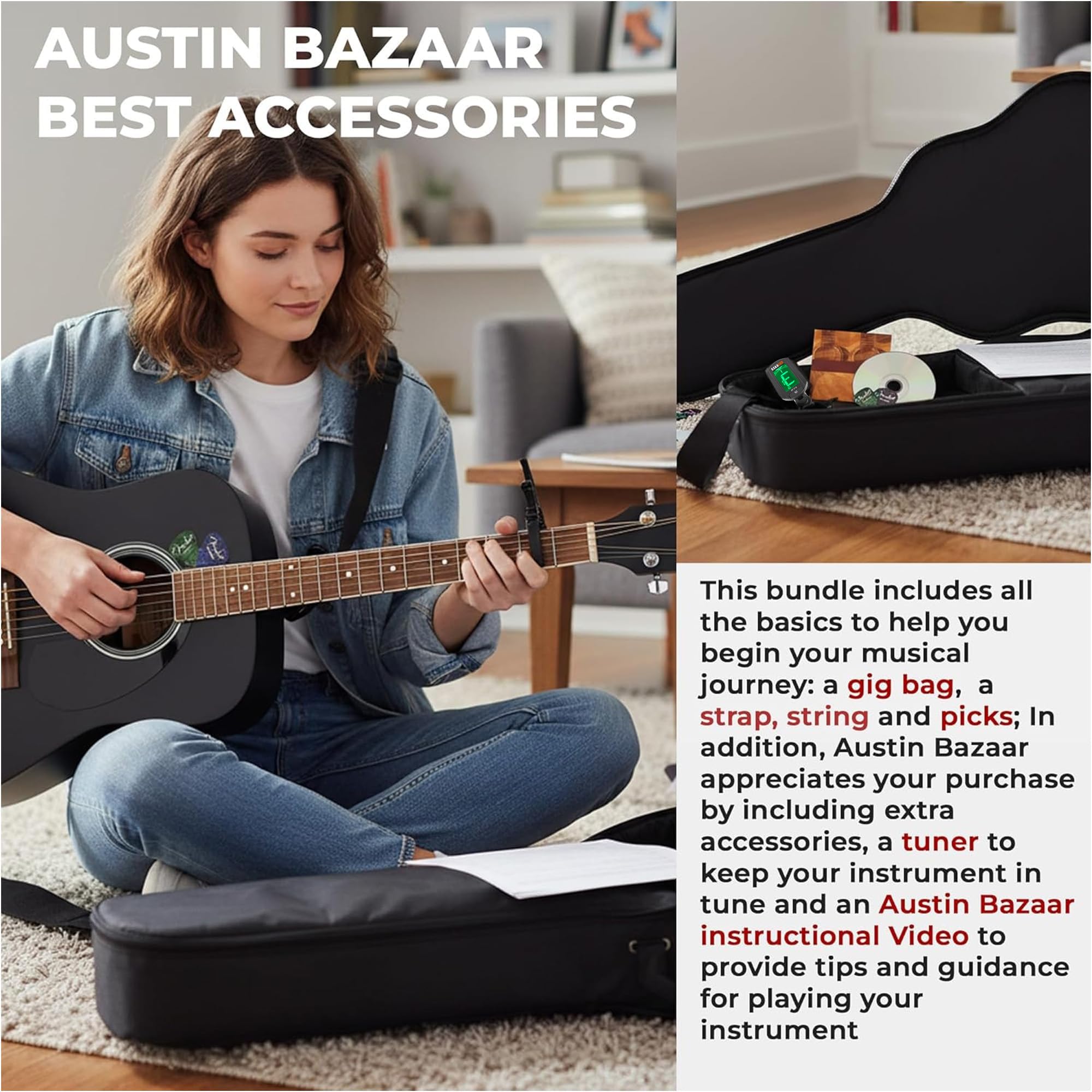EVERYTHING IN ONE BOX: Austin Bazaar enhances your purchase with essential accessories, including a gig bag for safe transport, a clip-on tuner to stay in tune, a strap for standing practice or performance, extra strings, picks to start playing right away, and an instructional DVD to help you learn your new instrument