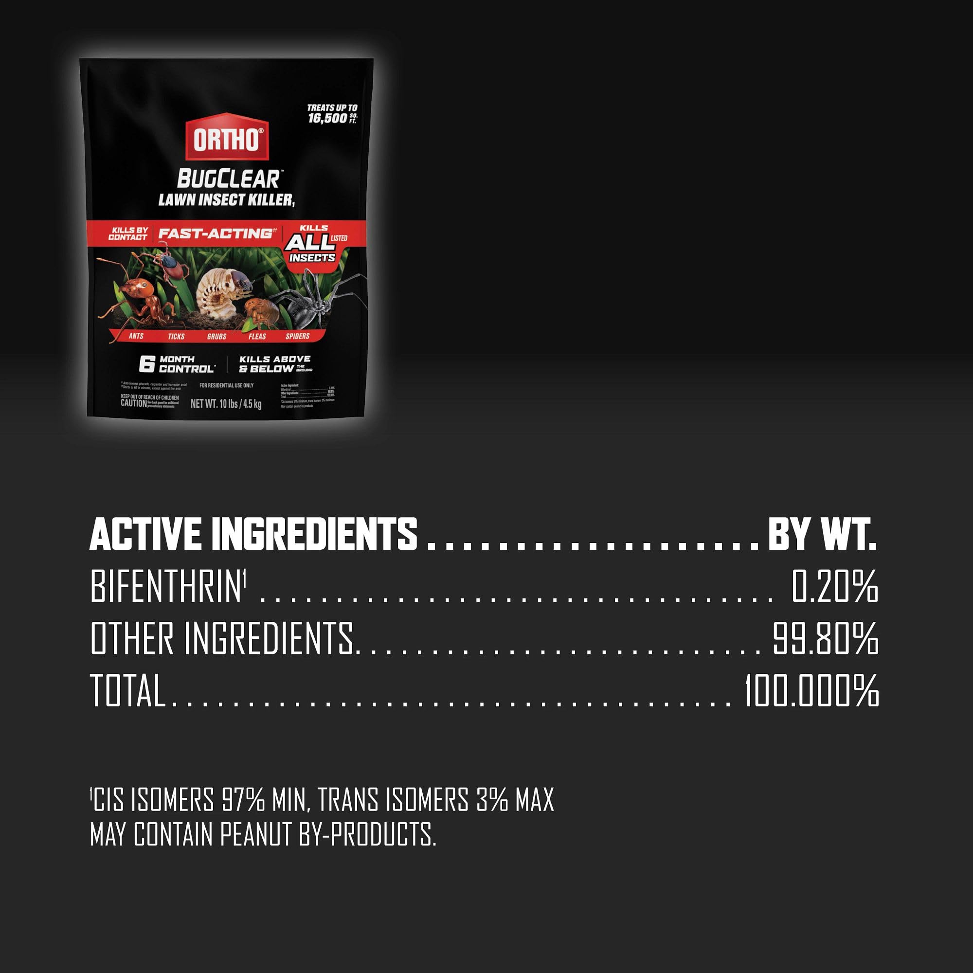 Protect your lawn from ants, spiders, ticks, fleas, armyworms, and grubs with Ortho BugClear Lawn Insect Killer1. These fast-acting lawn bug killer granules start to kill in minutes (except against fire ants) and kill listed pests by contact. This pest control product provides long-lasting insect control up to 6 months against ants (excludes carpenter, pharaoh, and harvester ants) and 3 months against other listed insects for lawn pest control and yard protection during bug season. You can use it on lawns, ornamental plants, around your home's perimeter, in flower beds, and even on listed vegetables for outdoor insect management in backyards. Apply this yard bug killer early in the spring before infestation or whenever insect activity or damage is first observed to help support grass health as part of lawn care program for DIY homeowners. Simply apply with a Scotts Spreader or other compatible spreader, then water in immediately after application. People and pets may re-enter treated areas once dry. This 10 lb. bag of Ortho BugClear Lawn Insect Killer1 treats up to 16,500 sq. ft.