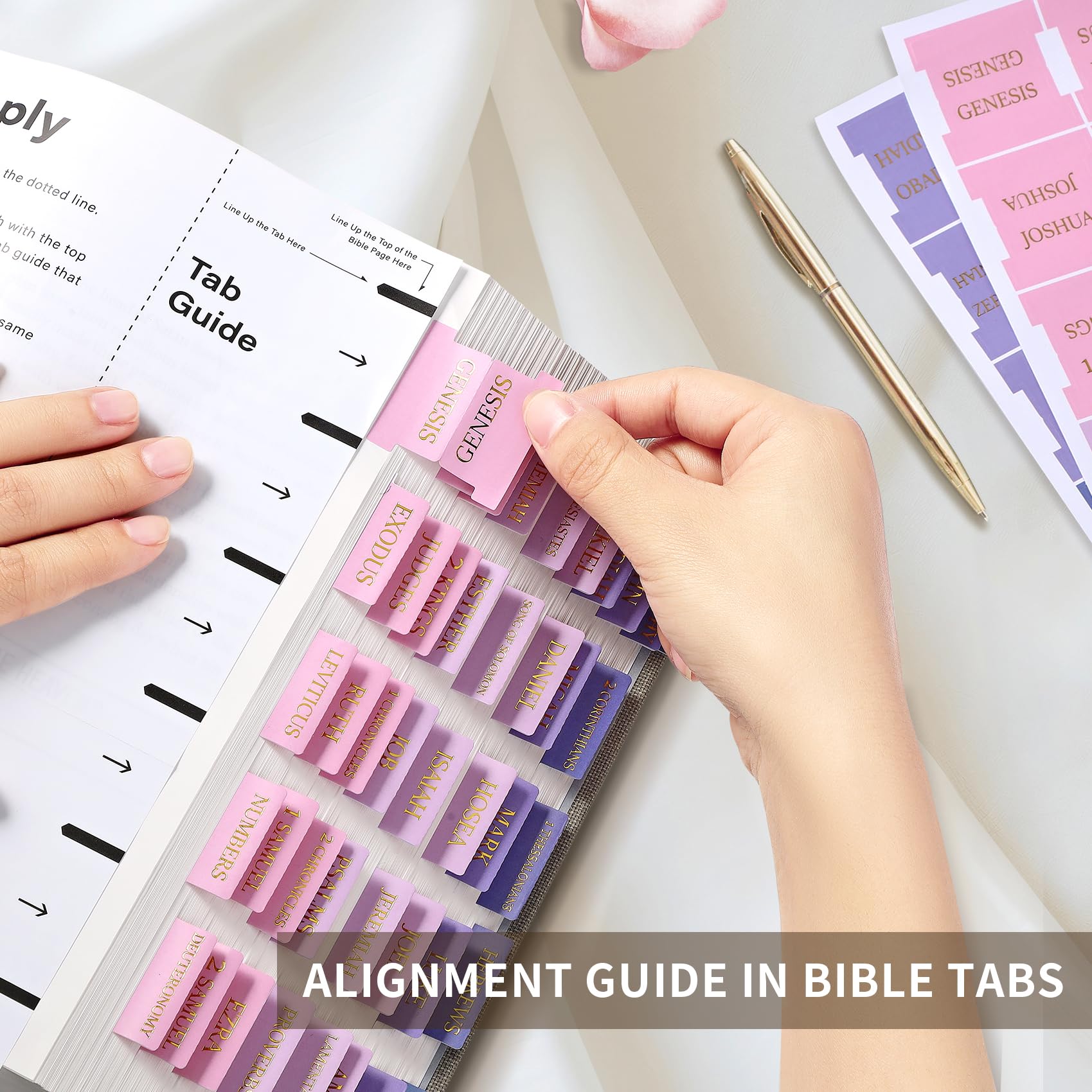 Simple Application with Alignment Guide - Experience the simplicity of perfectly aligned Bible tabs with our built-in Alignment Guide. Just align them effortlessly using the included guide or get creative with your placement in your new Bible. The Bible stickers are pre-scored in the middle for easy folding.