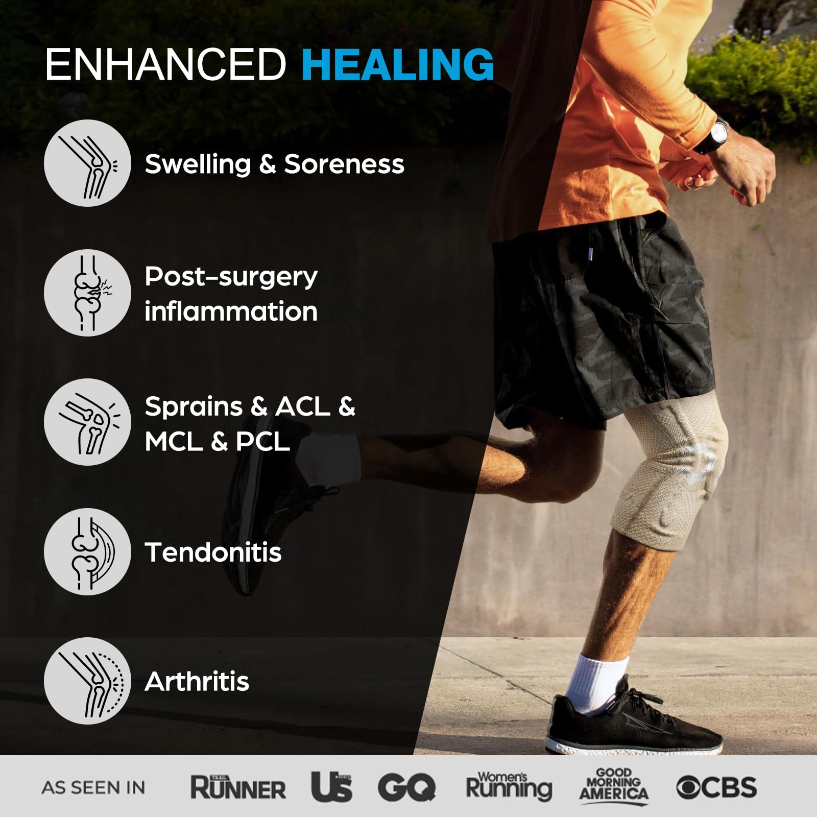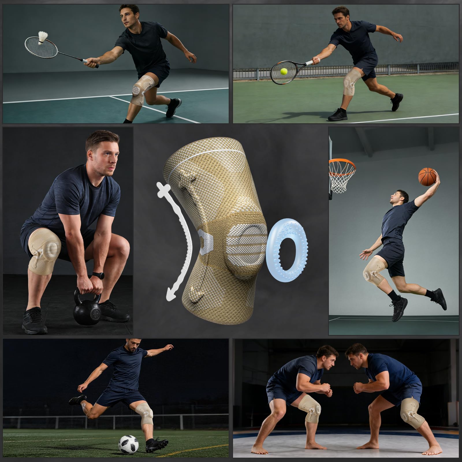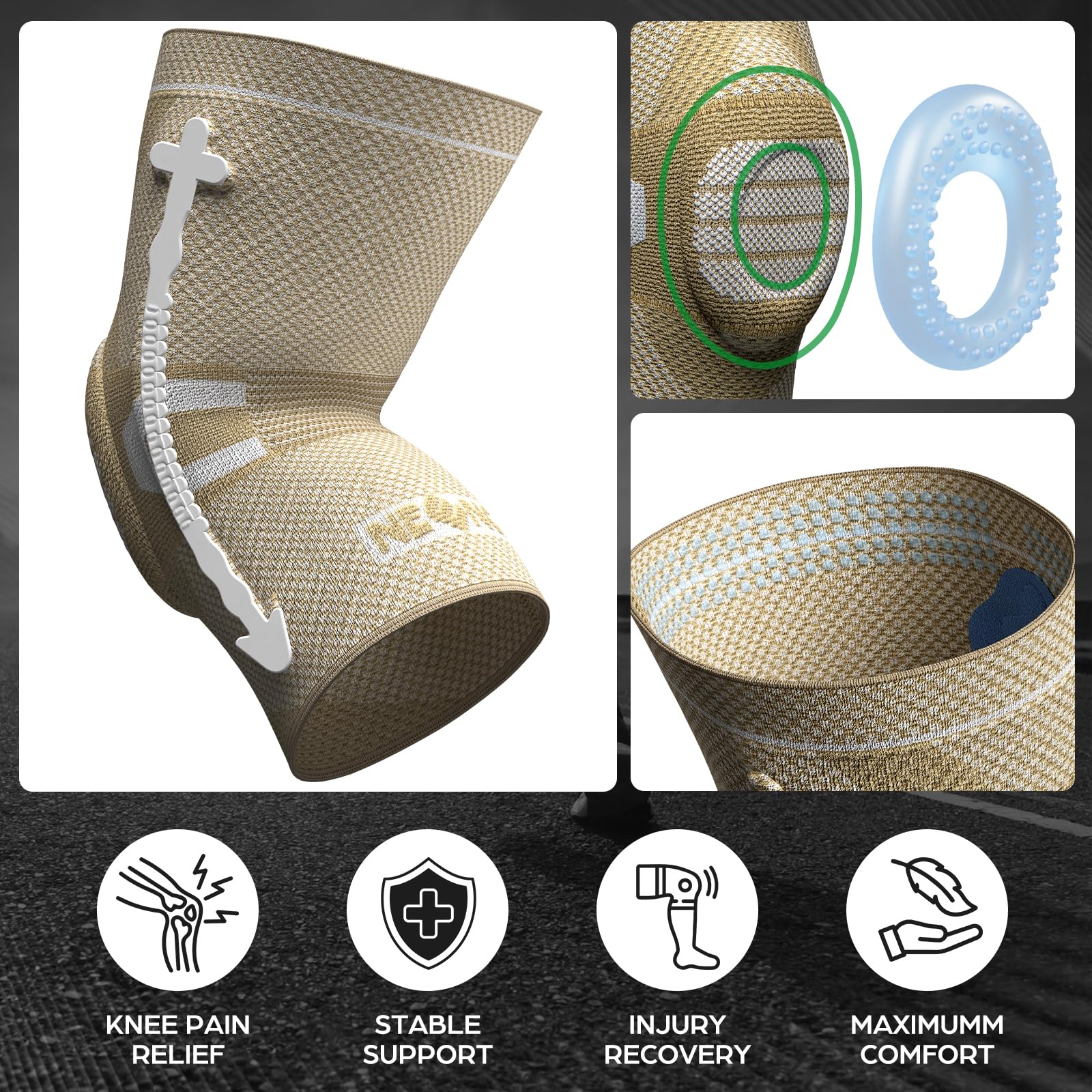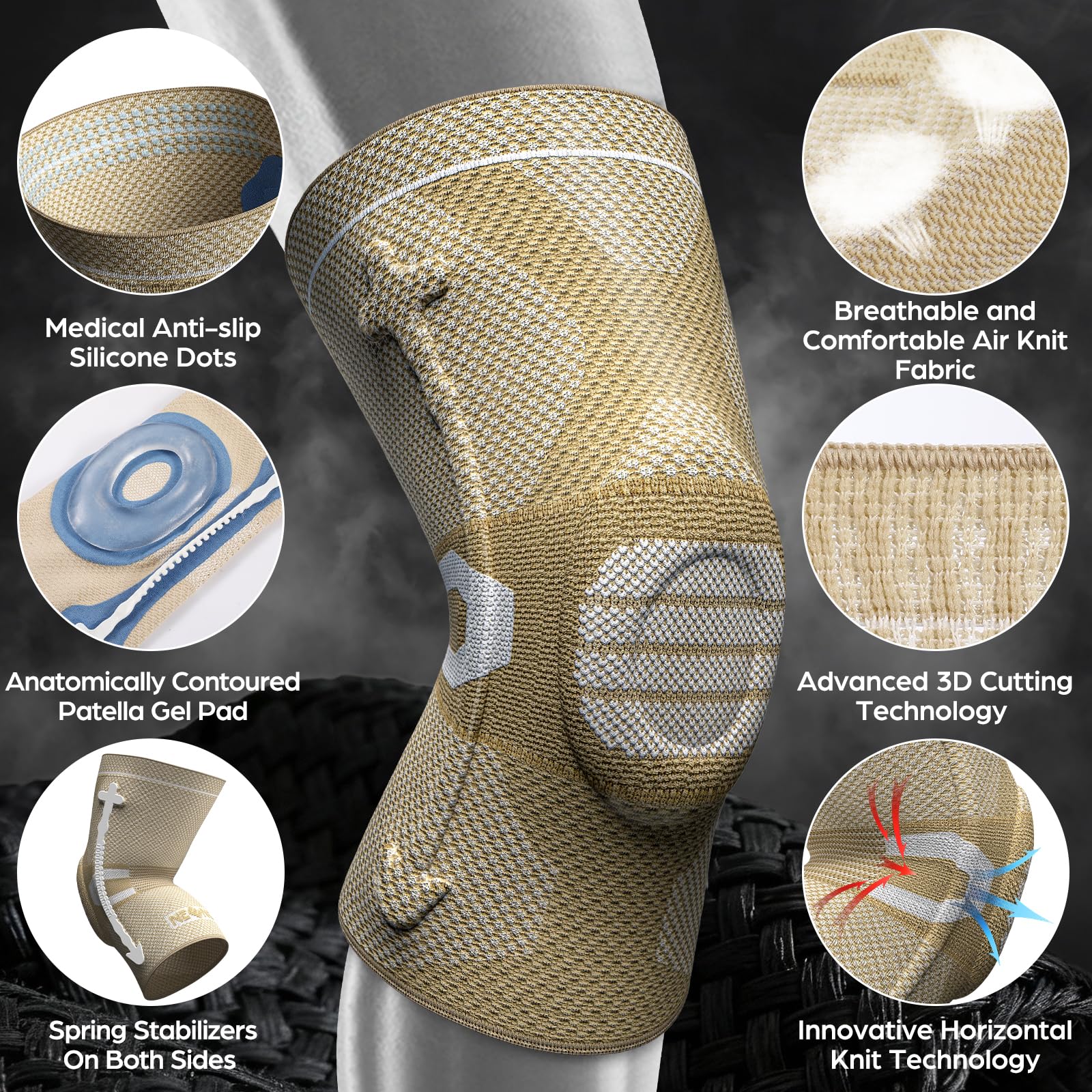 EXCLUSIVE PATENT--- Horizontal Knit Technology: An anatomically contoured patella gel pad surrounds your kneecap, double-sided metal spring stabilizers fit tightly with your knee joint. These special functional element strengthen side support and maintains joint stability. It will effectively disperses joint pressure, keeping your knee warm, lubricating your joints, accelerate blood circulation. BEST CHOICE for sports protection and pain relief.