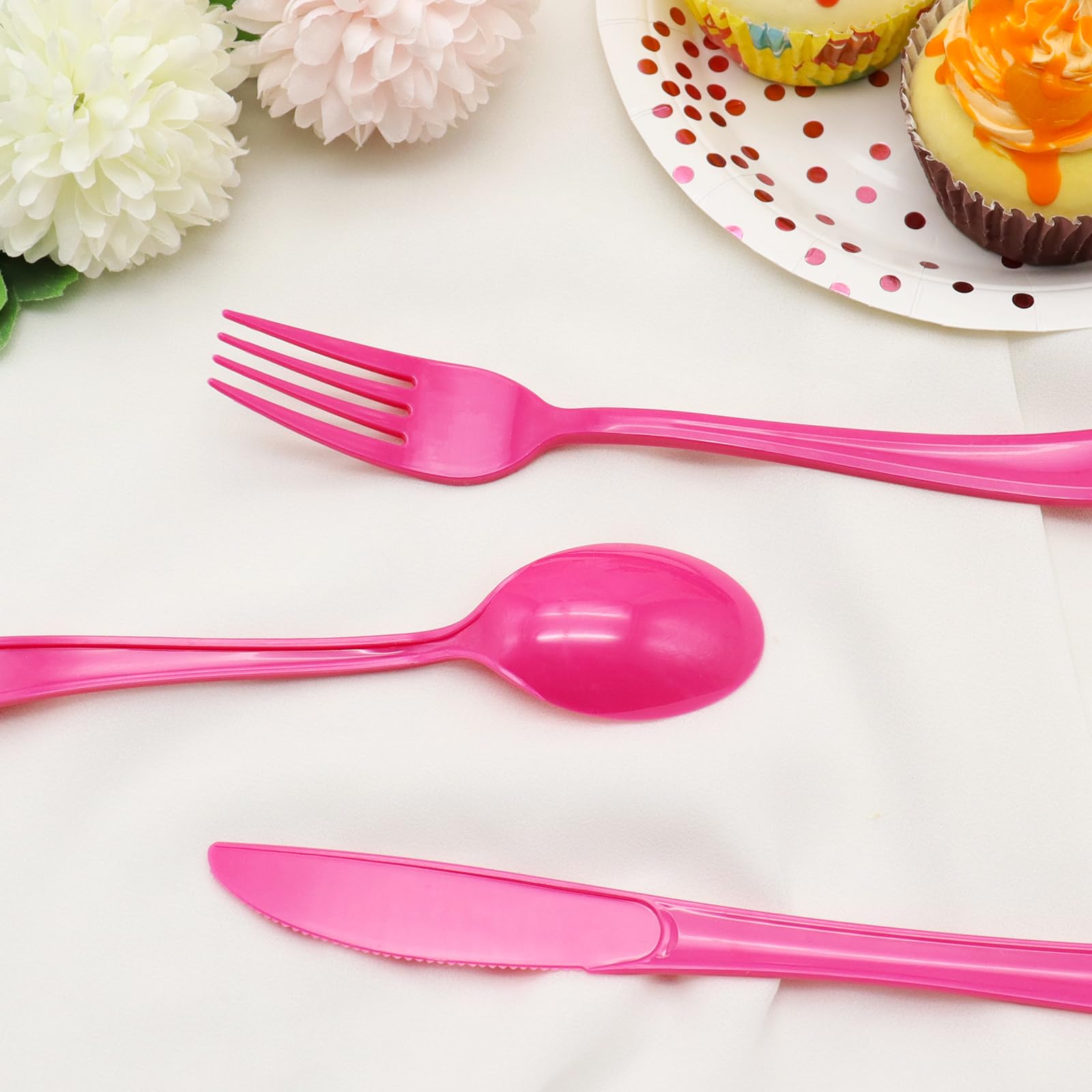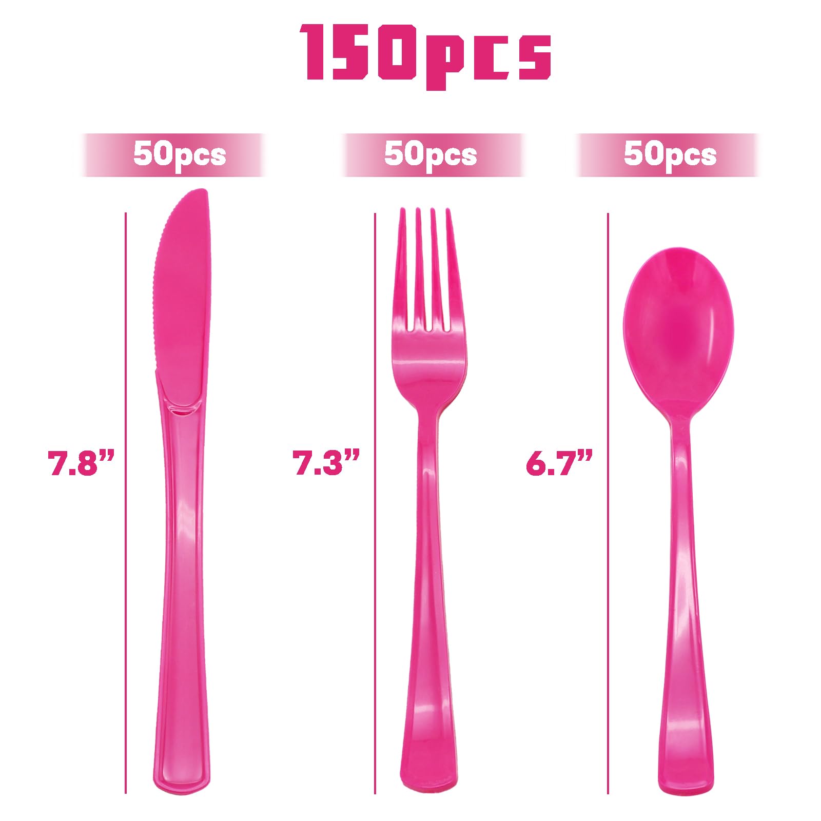 【Cost-Effective Pink Silverware Set】: This hot pink silverware includes 50 hot pink forks, 50 hot pink spoons and 50 hot pink knives, total 150 hot pink plastic cutlery. The hot pink utensil set is versatile and affordable, and in addition to meeting everyday household, party or business uses, it can also be used as a beautiful gift option for more than one person at the same meal.