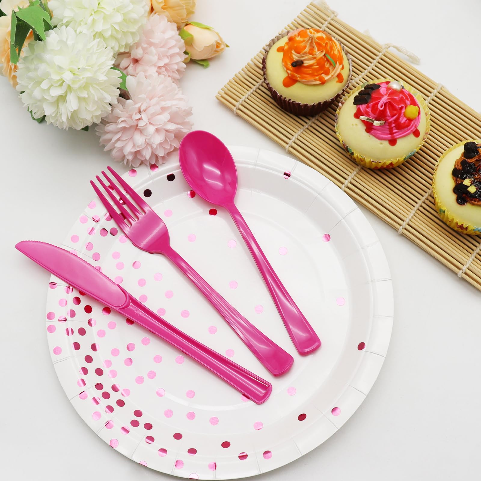 【Convenient and Reusable】The hot pink cutlery set is disposable and can easily be thrown away after the party, eliminating the hassle of a long wash and clean-up so you can focus on having a great time with friends and family. Of course, if you want to continue using the hot pink silverware set, simply wash it in soapy water to restore its lustre and get it ready for your next party.