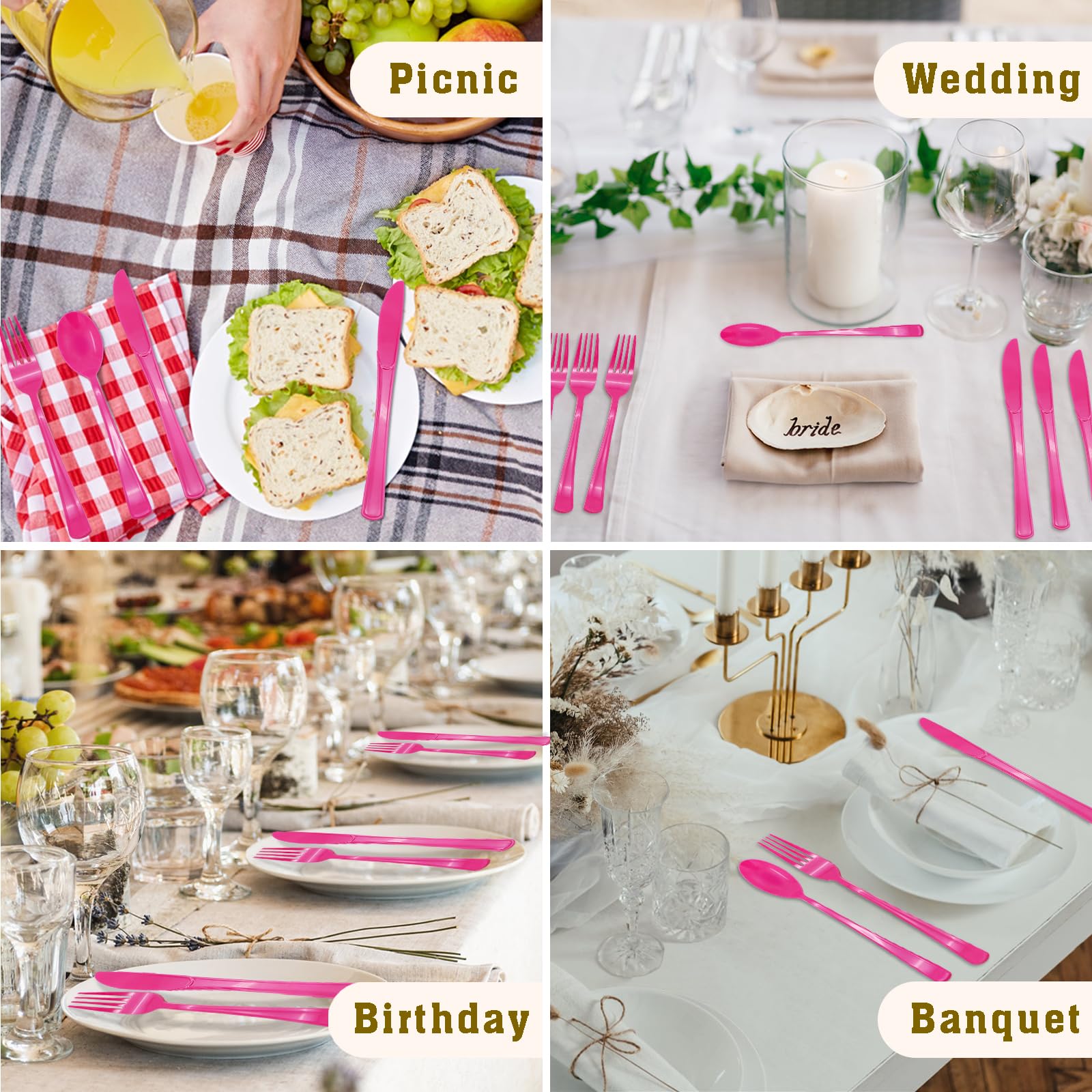 【Reliable Quality】: The hot pink plastic silverware is made of food-grade plastic material, which is non-toxic and harmless and can be in direct contact with food. Thickly designed at the handle, it is less prone to breakage and deformity, and has excellent durability and reliability. High-temperature resistant and suitable for all types of food, whether cutting meat or scooping soup, the hot pink cutlery meets customers' needs.