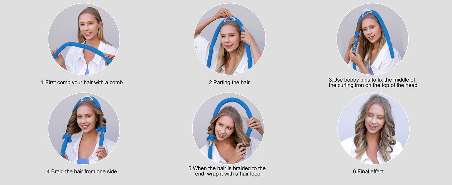 【Easy to Use】While your hair is slightly damp, put the curling rod over your head like a headband, you can clip it at the top or secure one side with a scrunchie like a ponytail, and then wind dry hair around the other side of the curling ribbon and secure with a scrunchie on the bottom. Make sure to wind tightly and start near the top of your head. Can leave in for more than two hours in the daytime or overnight with dry hair.