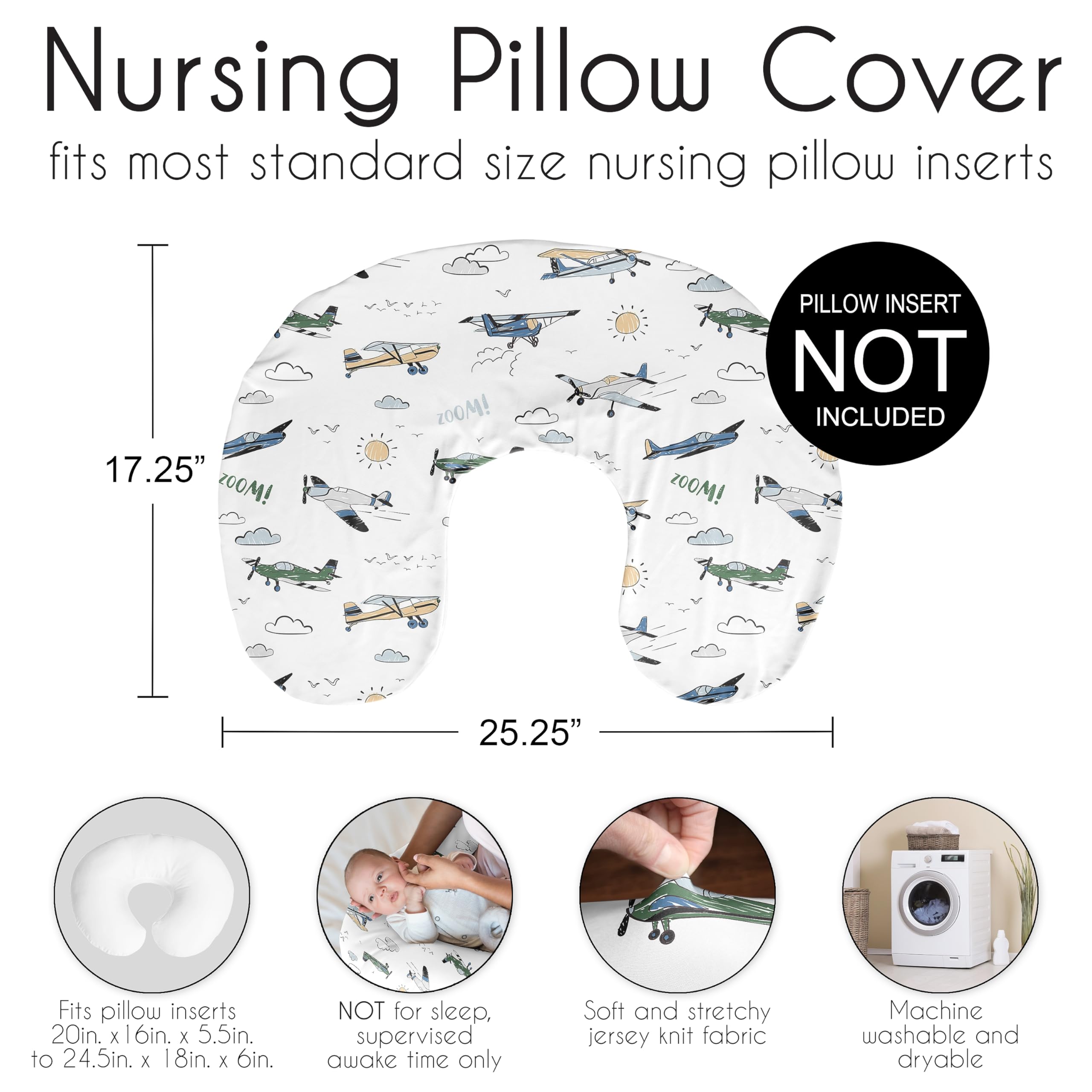 Includes: (1) Nursing Pillow Cover: 25.25 in. x 17.25 in. COVER ONLY – PILLOW NOT INCLUDED. Fits most standard nursing pillows. Materials: 95% Rayon / 5% Spandex Jersey Stretch Knit. Machine wash cold, tumble dry low.