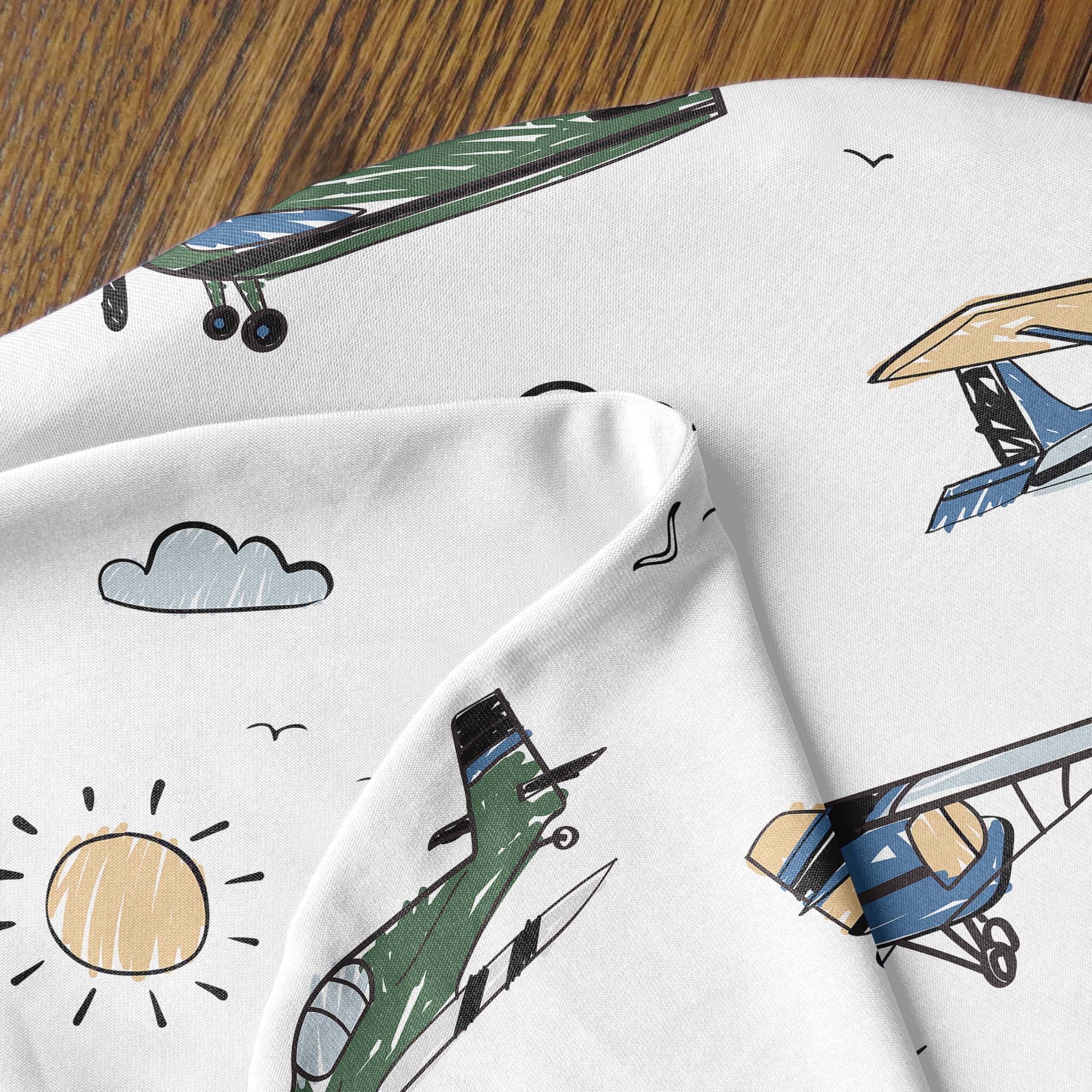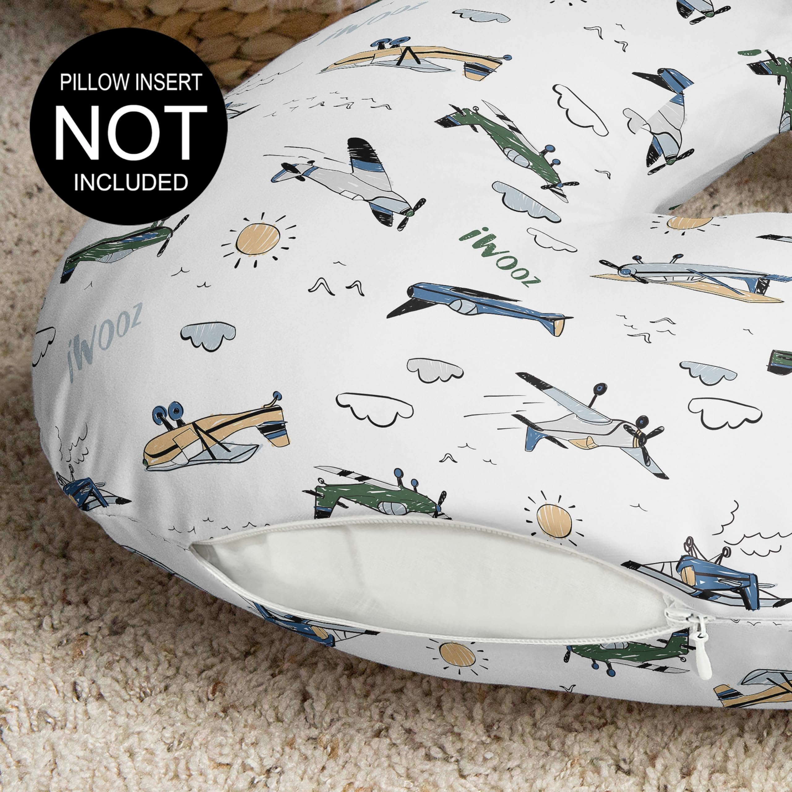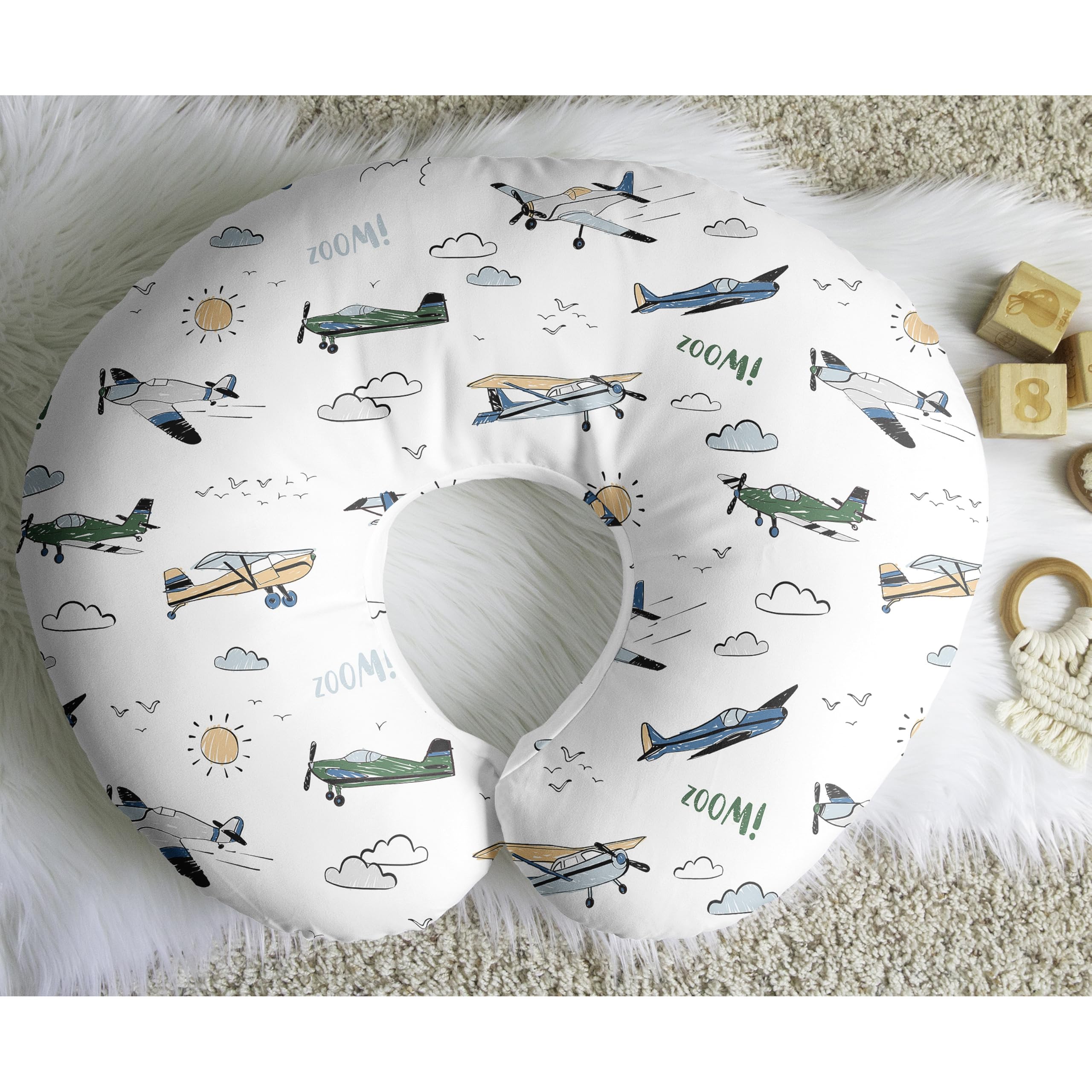 This baby nursing pillow cover is designed using a grey, yellow, green, gray, white and blue vintage airplanes, transportation, air plane, clouds, sun, sky, aviator, aviation, airplane print.