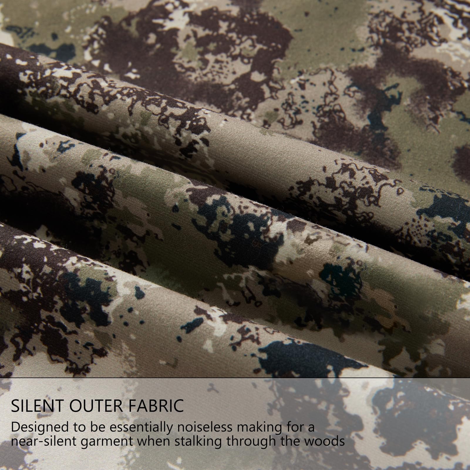 Silent outer fabric is designed to be essentially noiseless making for a near-silent garment when stalking through the woods