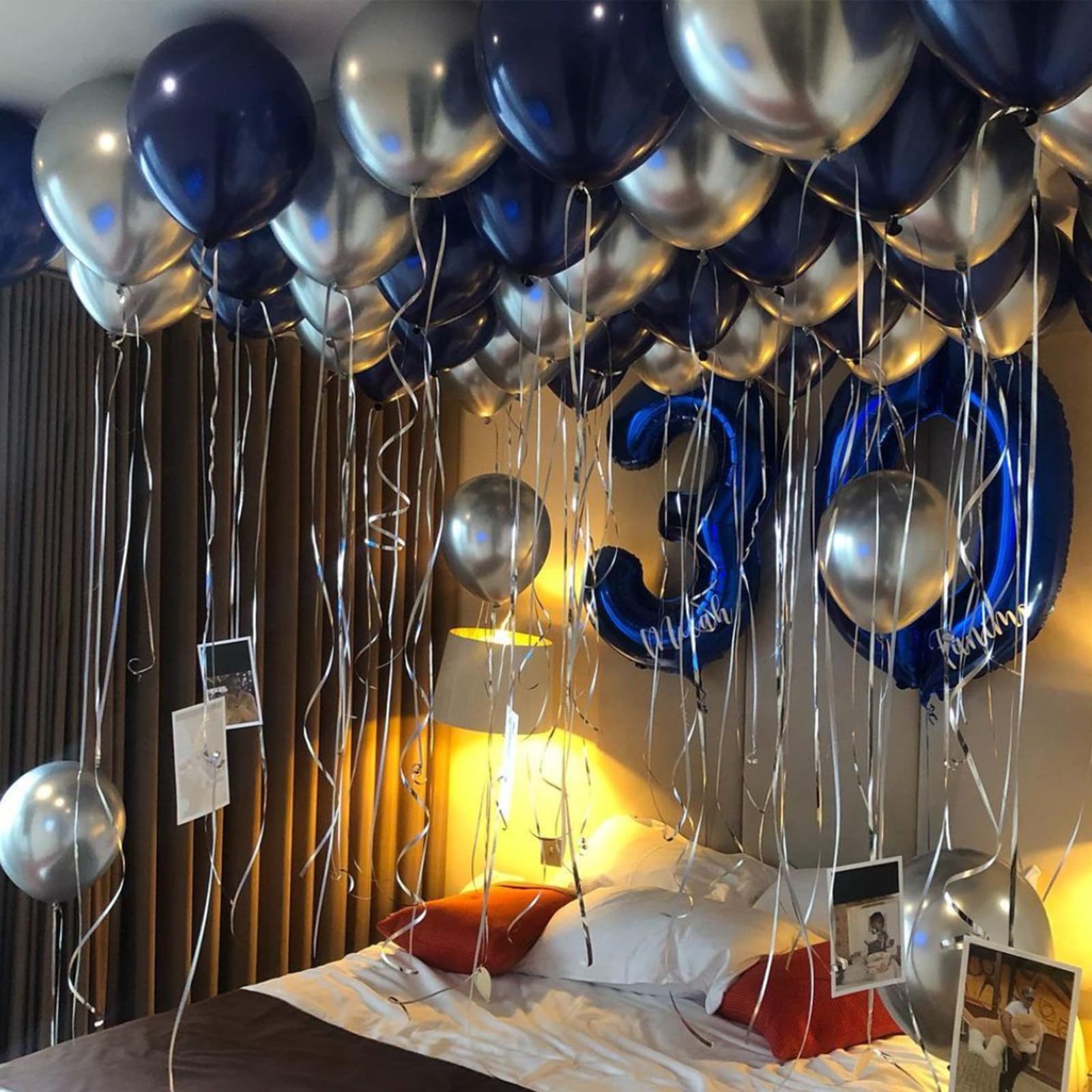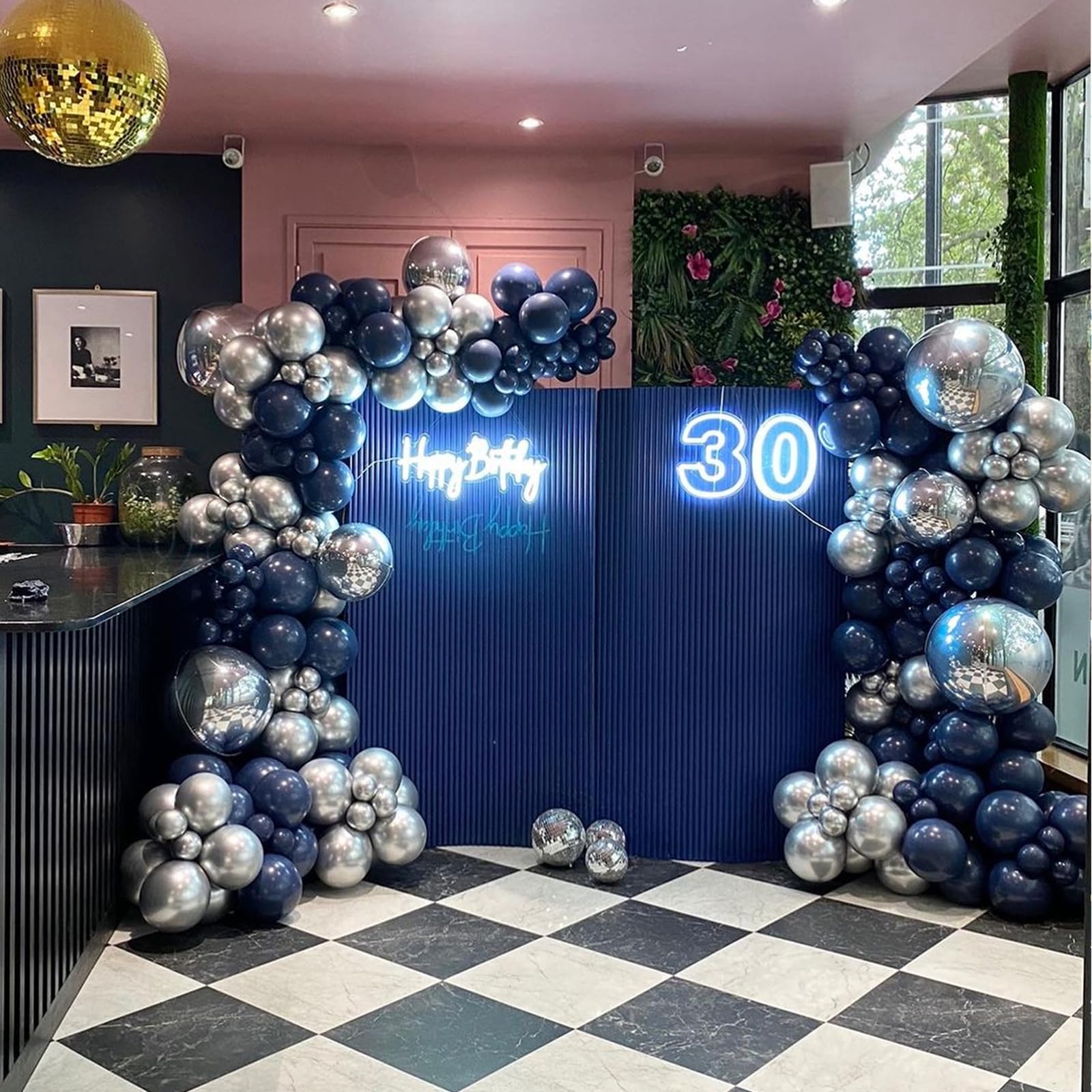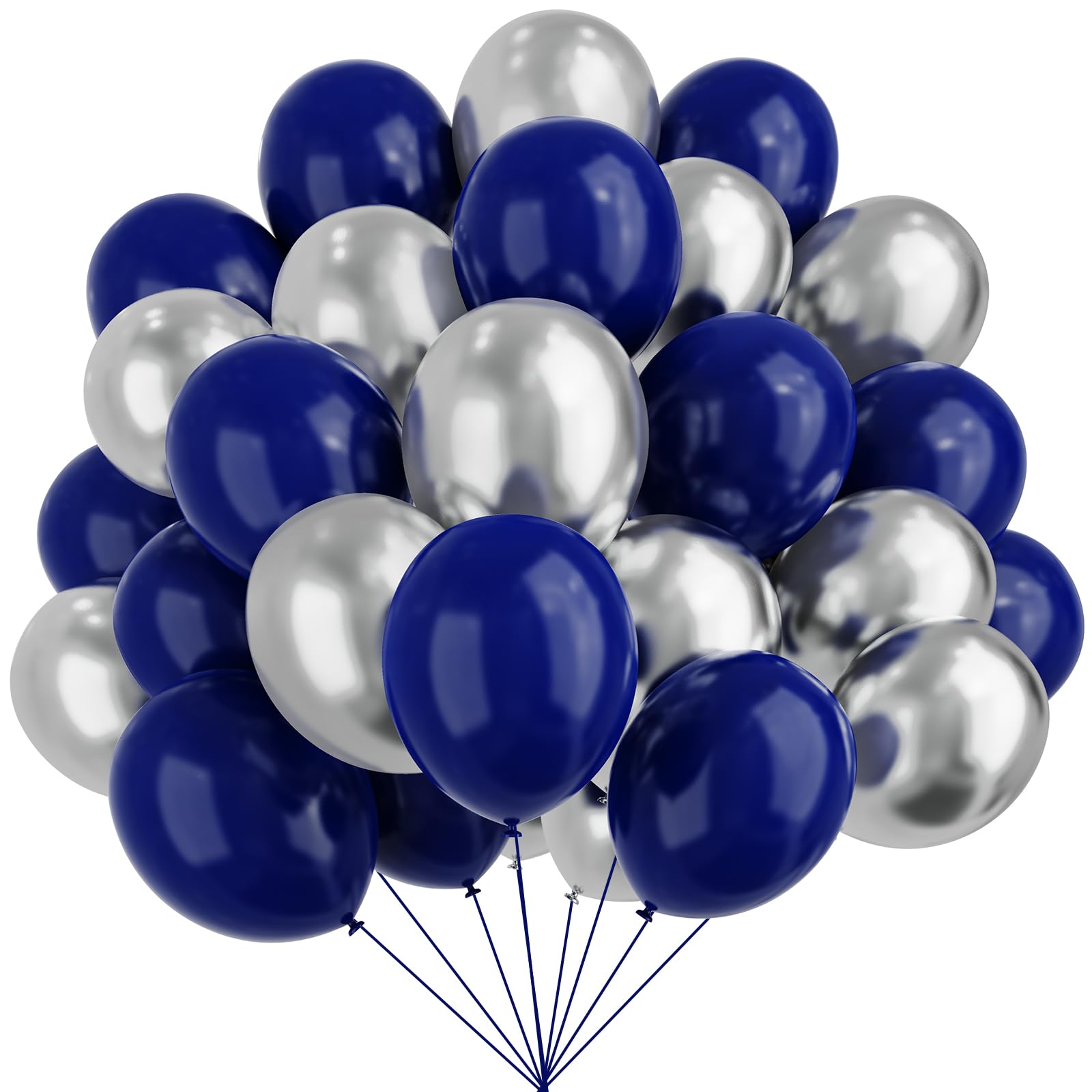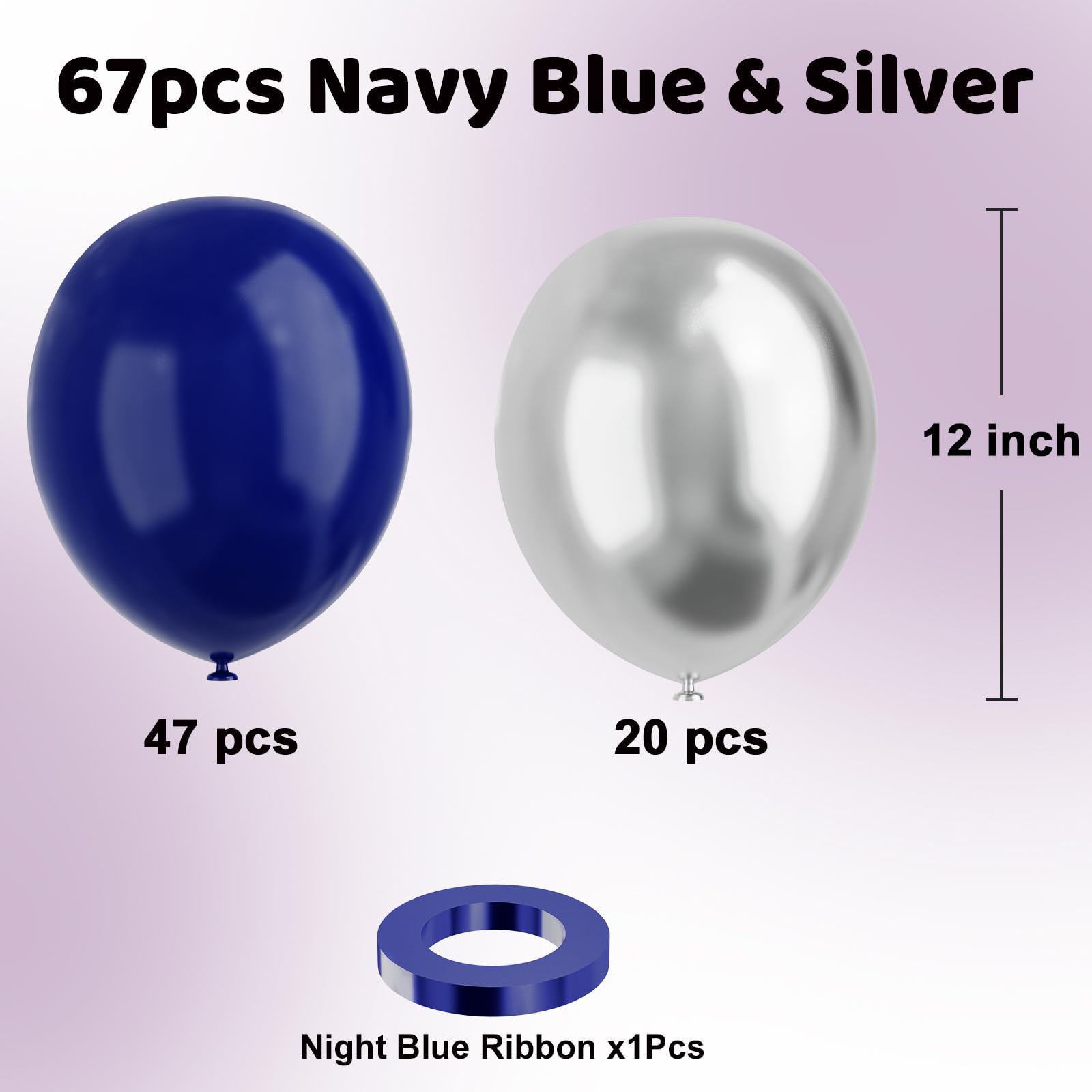 {All-in-One Kit} This navy blue and silver balloon kit includes everything you need to create a stunning decoration, 47 navy blue balloons, 20 metallic chrome silver balloons and 1 roll of navy blue ribbons. The size of the balloon is about 12 inches after inflation. The combination of navy blue and silver adds a touch of glamour to any party.