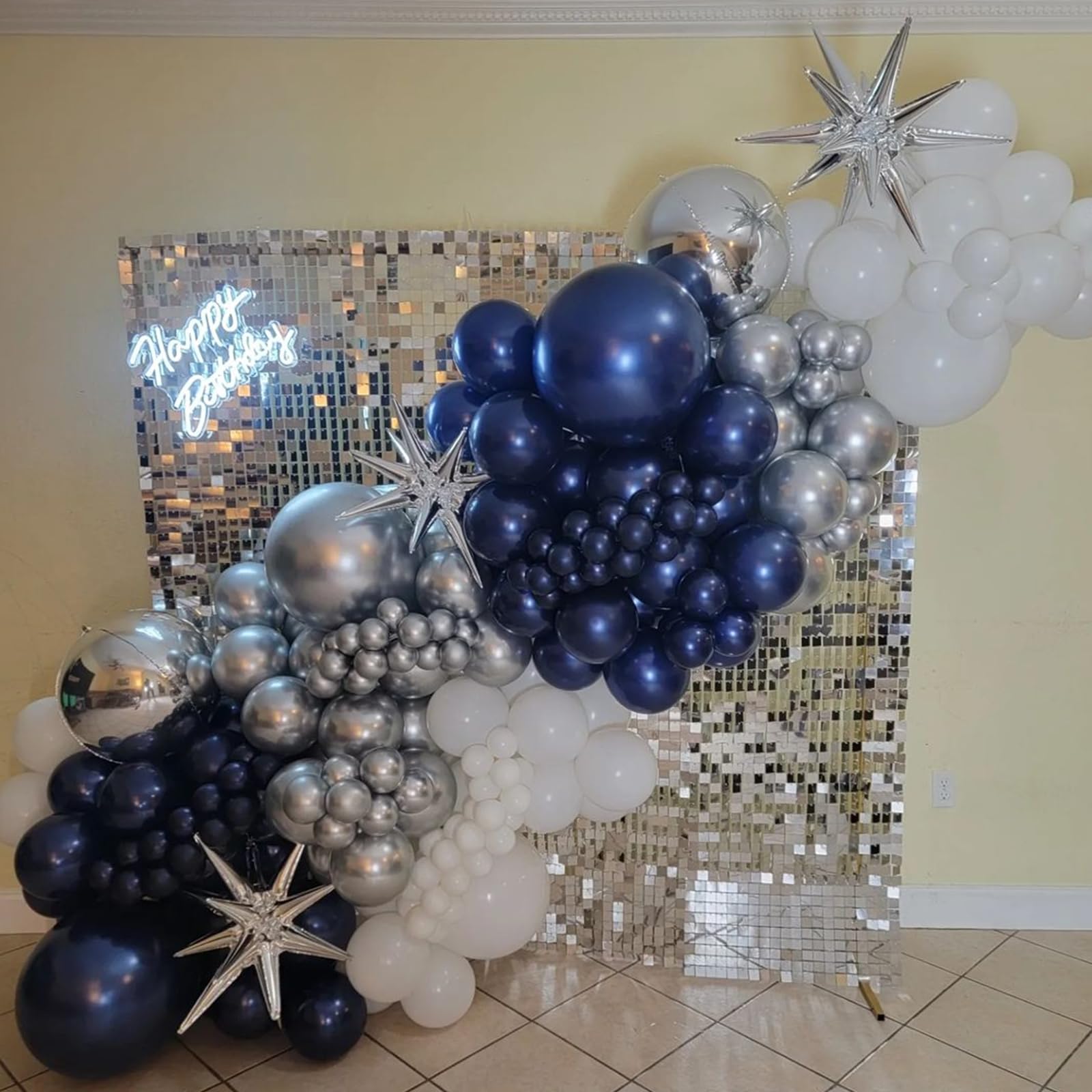 {Navy Blue and Silver Party Supplies} Our navy blue and silver latex balloon sets can add atmosphere to your party. It is the perfect decoration for happy occasions or celebratory moments such as birthdays, graduations,wedding, retirement, New Year's Eve party decorations, opening ceremonies and anniversary celebrations, suitable for indoor and outdoor events.