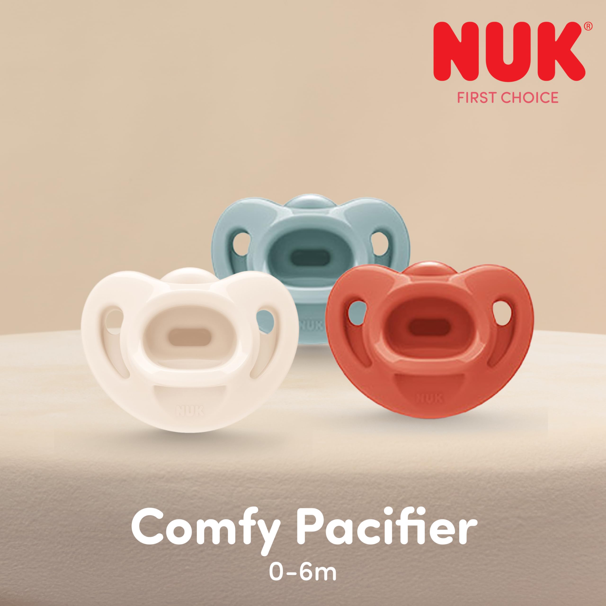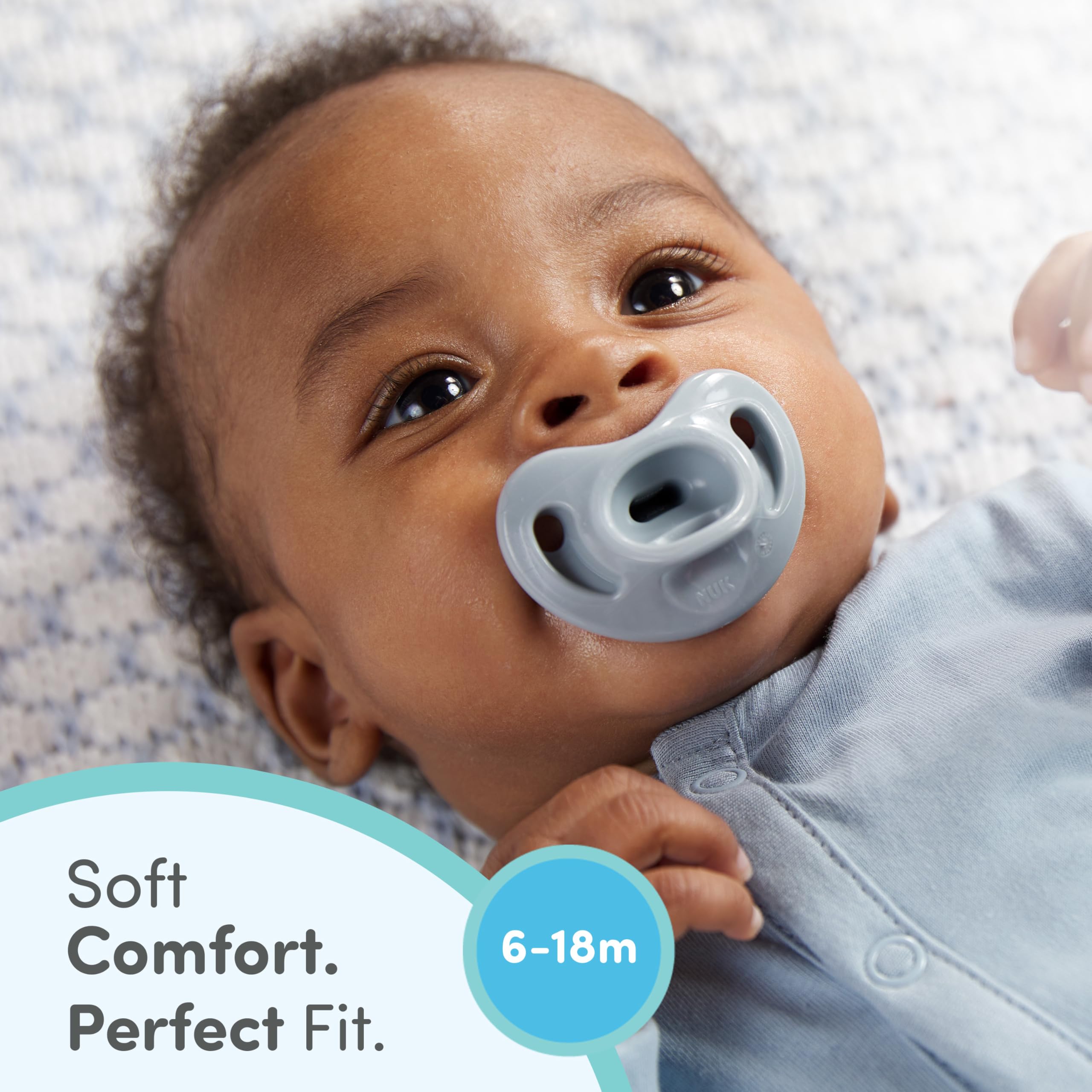 NUK Comfy™ Pacifiers feature a one-piece 100% silicone design that gently contours to baby's face. The heart-shaped shield fits perfectly under baby’s nose for easier breathing and to prevent irritation. The unique, breast-like nipple naturally fits baby’s palate and helps promote healthy oral development. Invented over 60 years ago by pediatric dentists and doctors, NUK orthodontic pacifiers are modeled after the natural shape of mom’s nipple while breastfeeding, creating an easy transition from breast to pacifier and back. The NUK® Comfy™ pacifier is made of 100% medical-grade silicone, and is BPA-free and dishwasher-safe (top rack only).