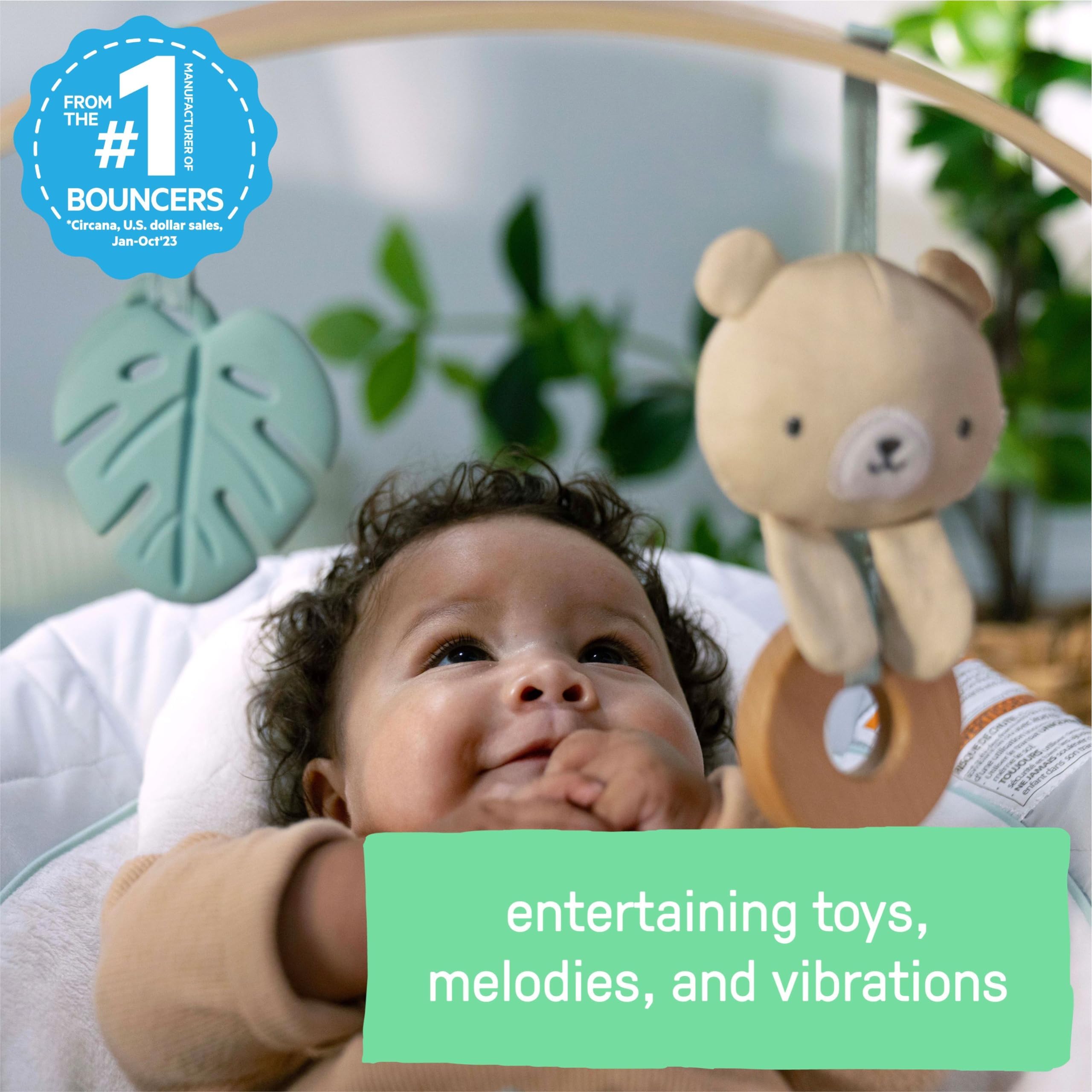 Keep baby entertained and safely seated without compromising your chic home dΓ©cor with the Ingenuity Cozy Spot Soothing Baby Bouncer. Designed in the USA by the #1 Manufacturer of Bouncers*, this large, comfy plush seat is easy to love and care for. As part of the Cozy Spot Collection, which includes the best-selling Cozy Spot Gym, this bouncer embodies beautiful simplicity and functionality. The sustainably harvested birch wood toy bar features 2 removable toys and premium, ultra-plush materials to give baby a soothing space all their own. Toys include a Nate the Bear plush toy with a natural wood ring and a silicone leaf-shaped toy. Soothing melodies keep baby engaged, and the bouncer features volume control and auto-shutoff to let parents remain in control of the sounds. (Batteries not included). Equipped with removable head support and a 3-point harness, Cozy Spot offers a comfy, safe space for baby. The seat pad is machine-washable, and toys easily wipe clean. Featuring a soft, gender-neutral color palette, Cozy Spot makes for the perfect baby shower gift crafted for ages 0-6 months. (*Circana, Retail Tracking Service, U.S., Bouncers, dollar sales, 12 months ending October 2023)