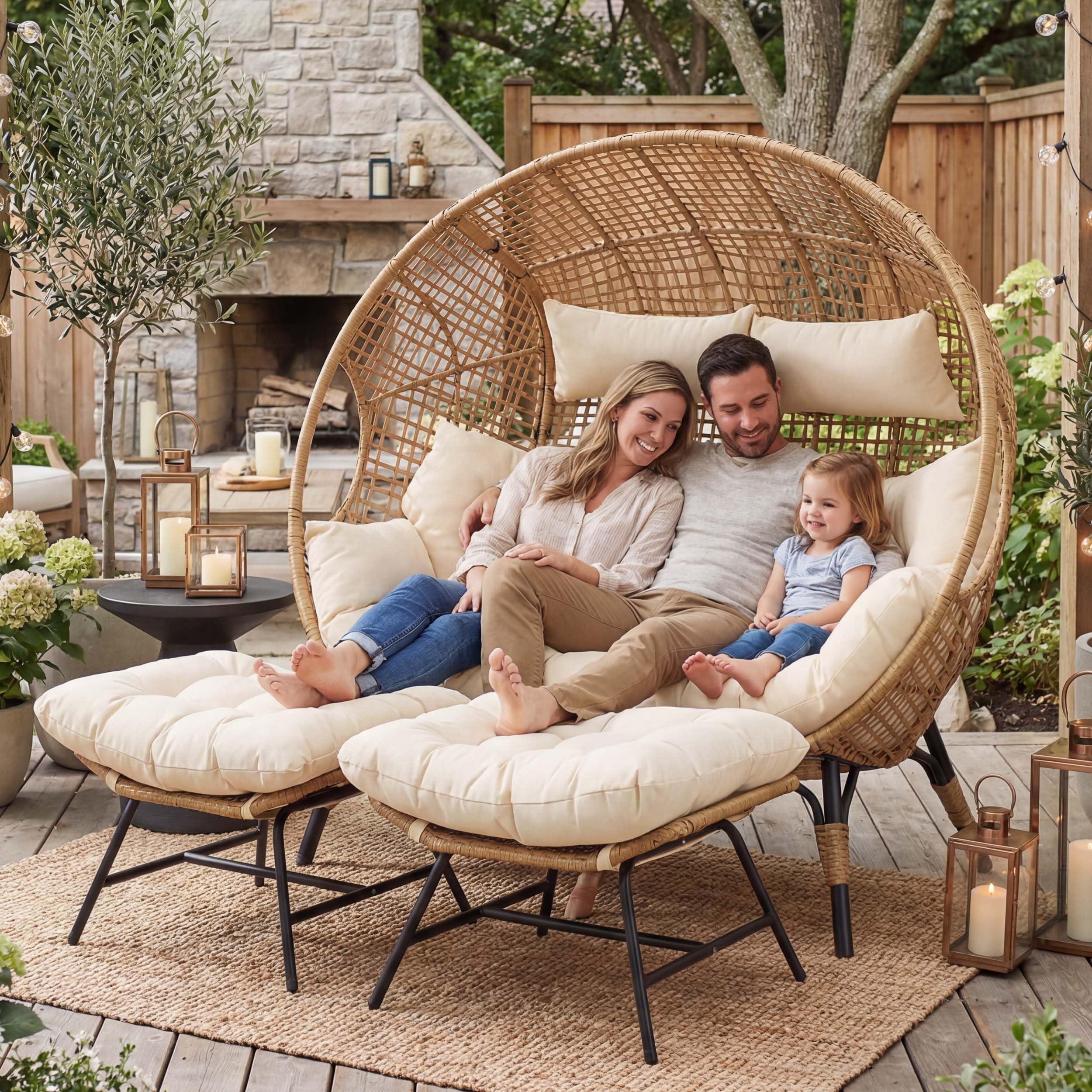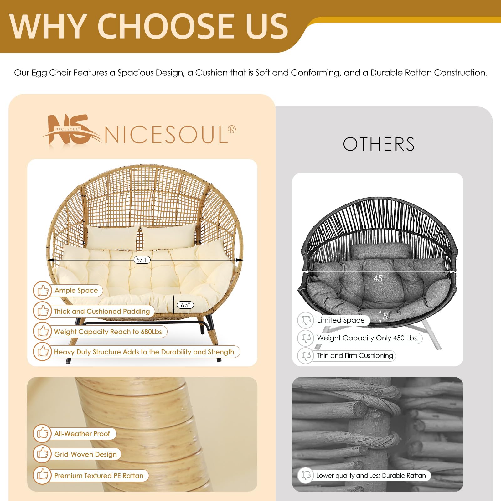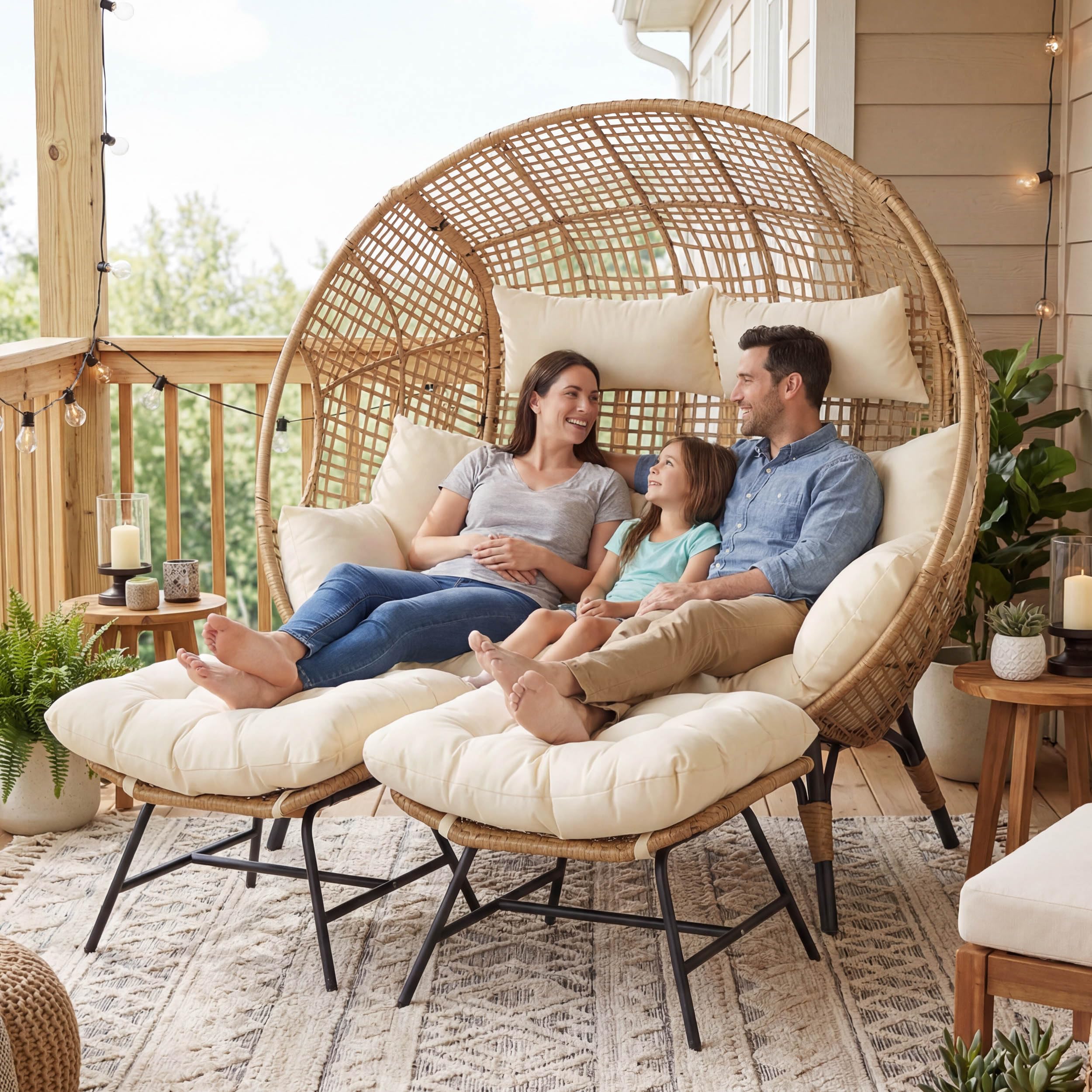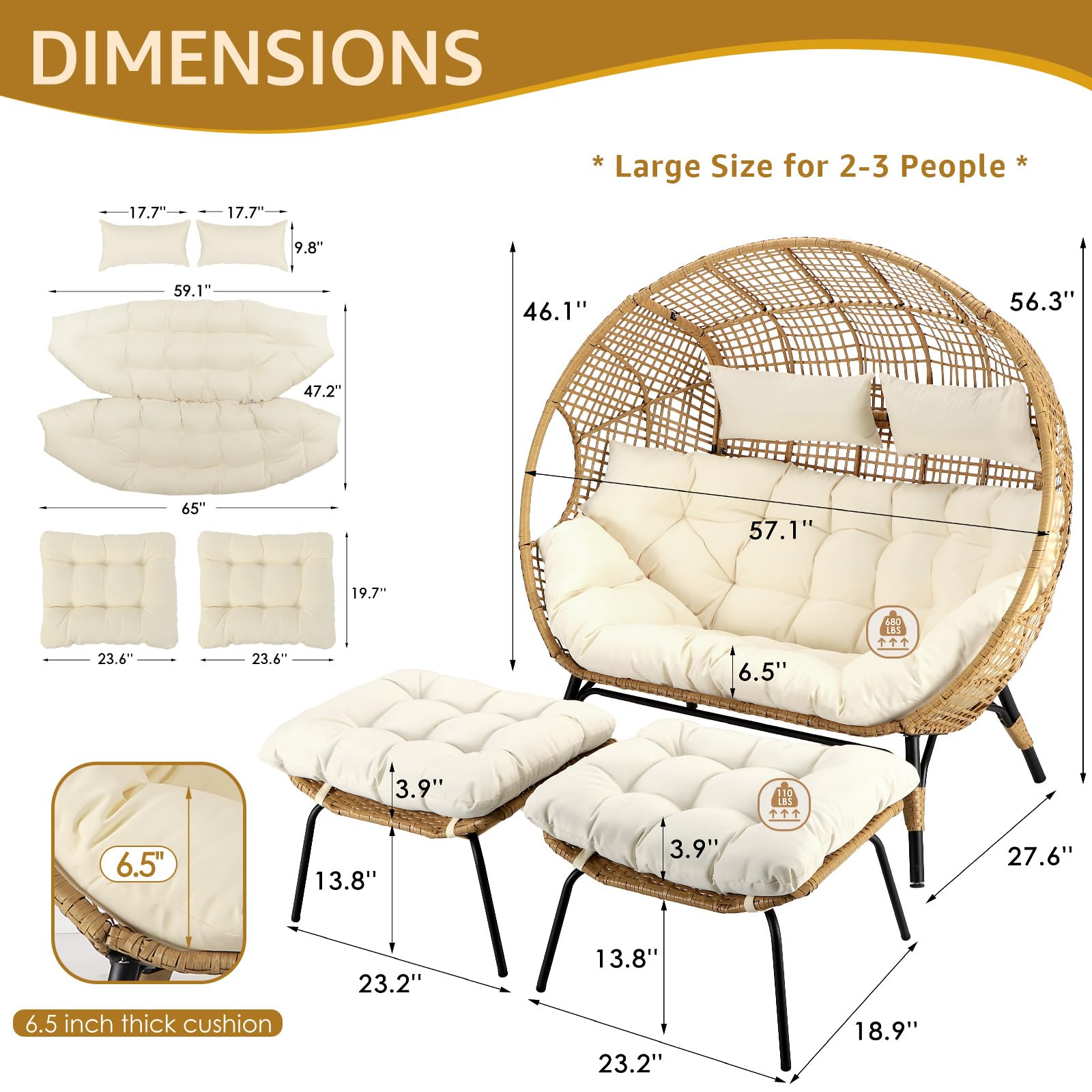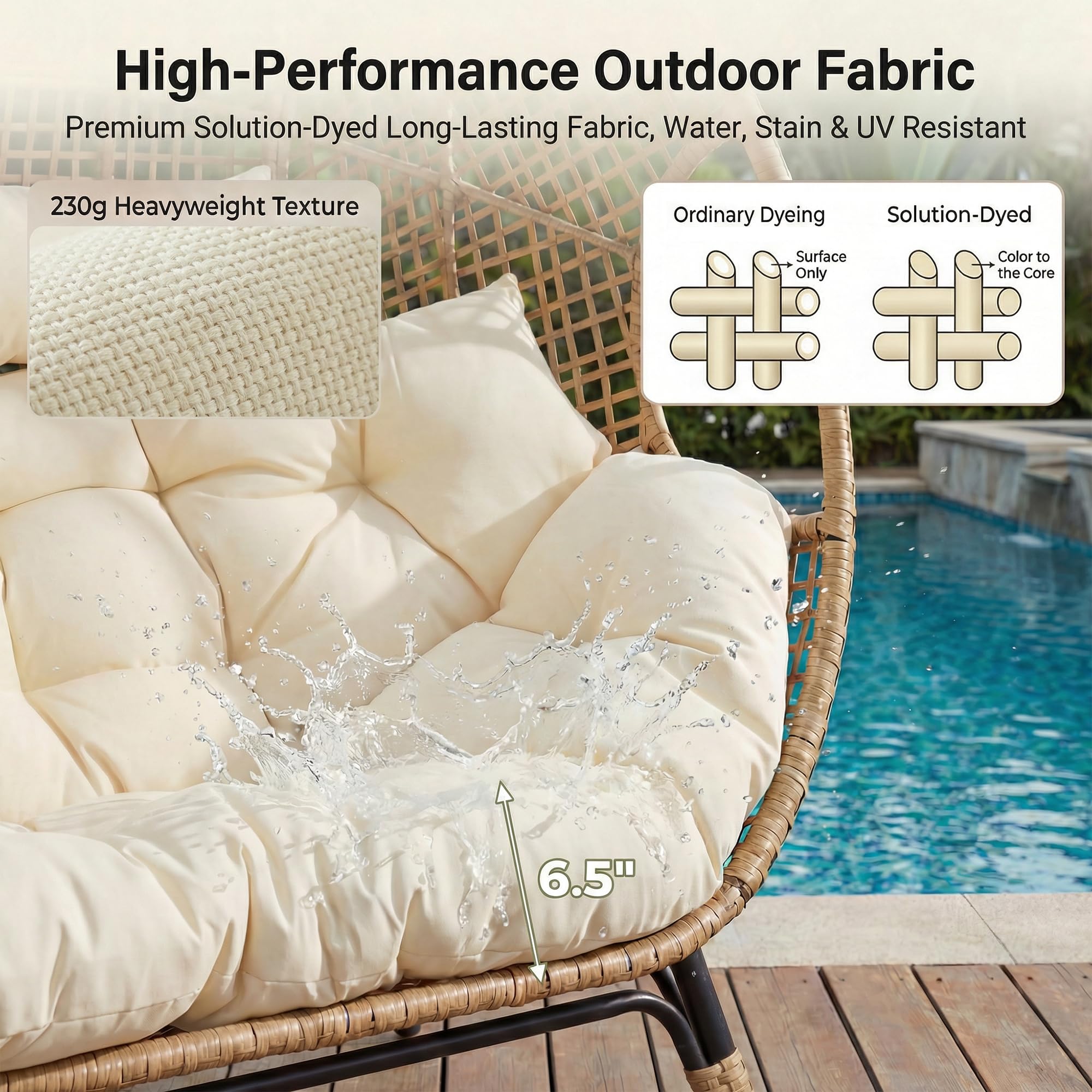 Generous Double Seating: Our Double Egg Chair offers a grand size of 35.4"D x 57.1"W x 56.4"H, comfortably accommodating two people; Larger than many alternatives, it provides ample space for shared relaxation, whether indoors or outdoors, making it perfect for couples or small families seeking both comfort and style