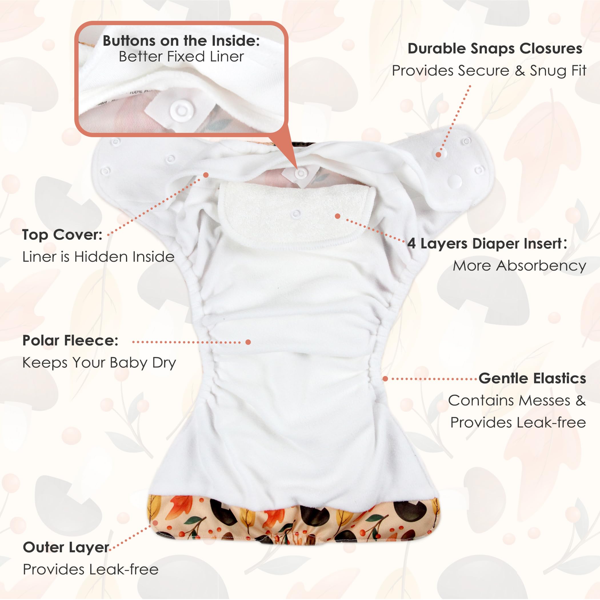 Soft Exterior: Polyester, leek-free and breathable PUL, this kind of soft materials, breathe and better construction diapers help keep your baby comfortable; Double Rows of snaps fit well, the leg gusset can keep off the leaks