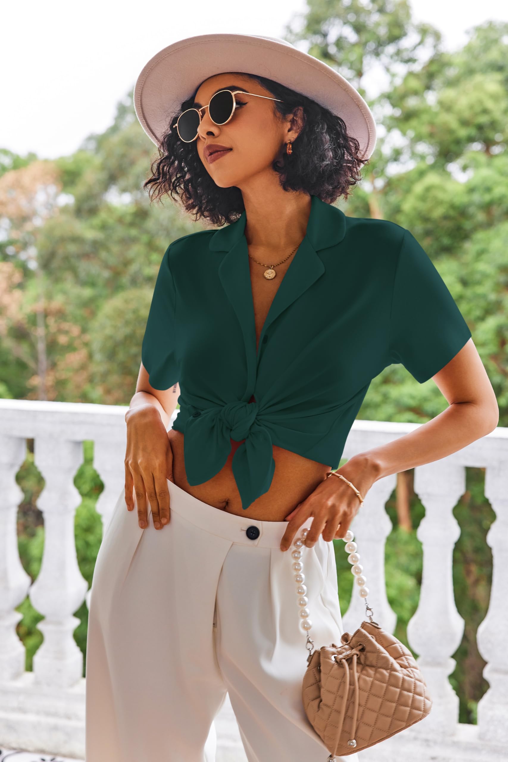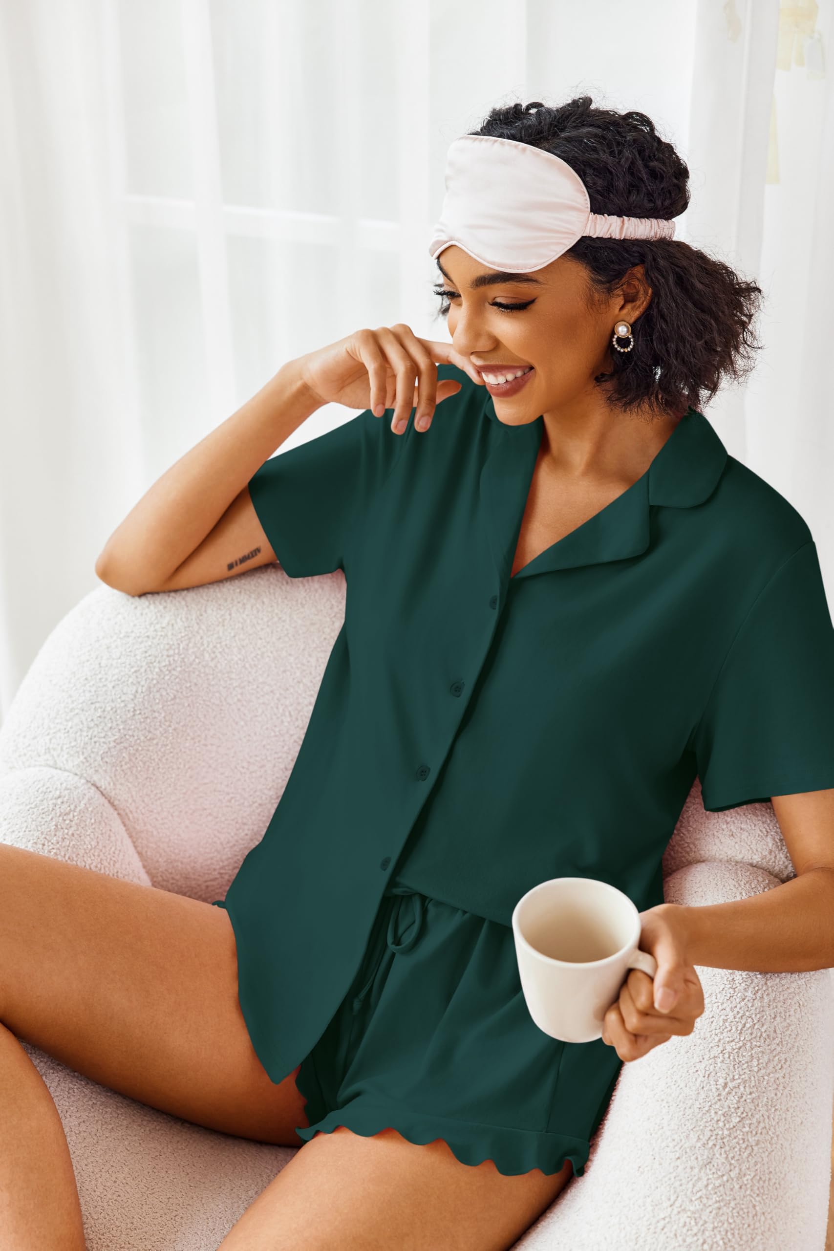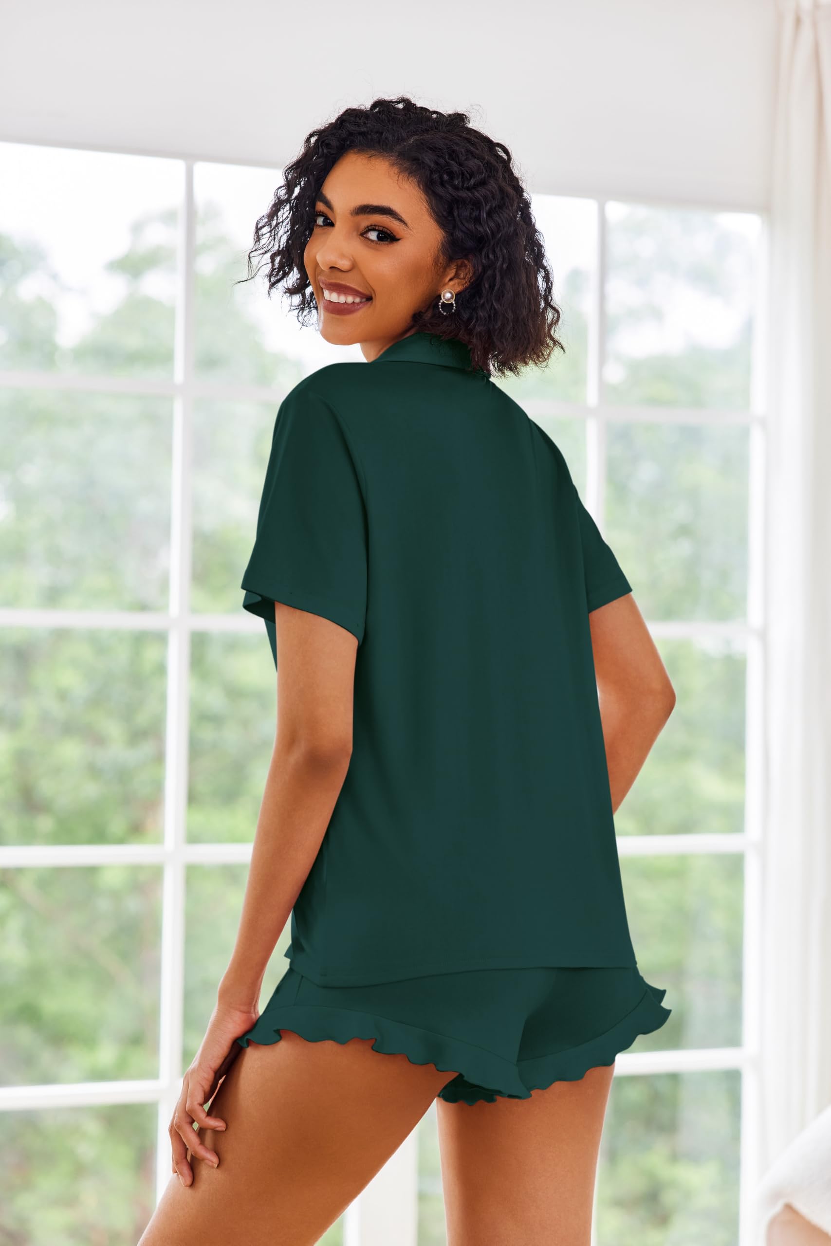 【Pajama Top】:Women's short sleeve pajamas set with solid color, sleepshirt hits at hip , turn-down collar, Full Button Design is easy to put on and take off