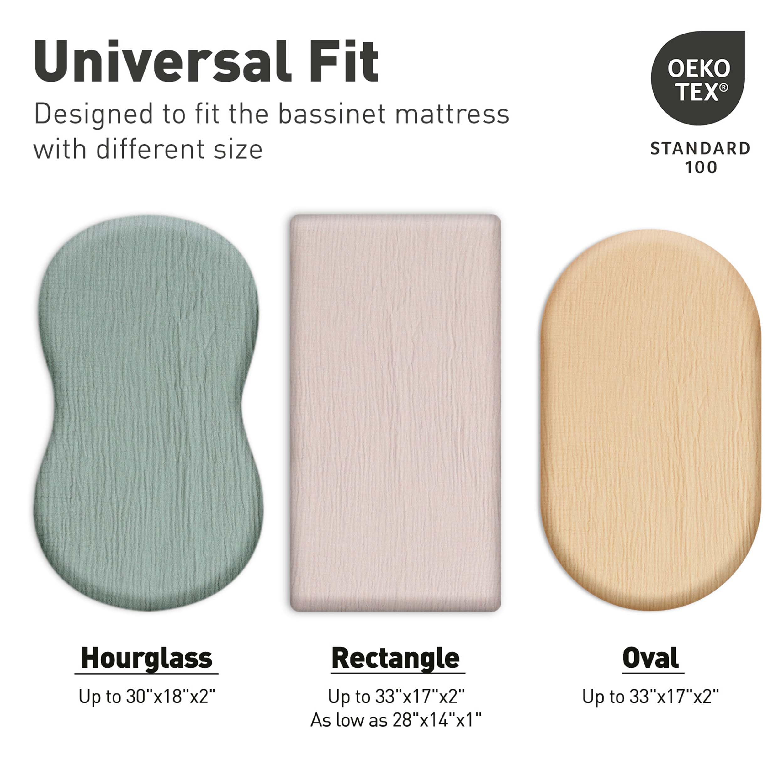 PERFECT SIZE & EASY TO CLEAN: Our baby sheets are 33 x17 x4 inches, universal fit for all standard size oval, rectangle and hourglass bassinet mattress. Our bassinet sheets is easy to clean up and machine washable, light and breathable, and easy to dry, please wash before use.
