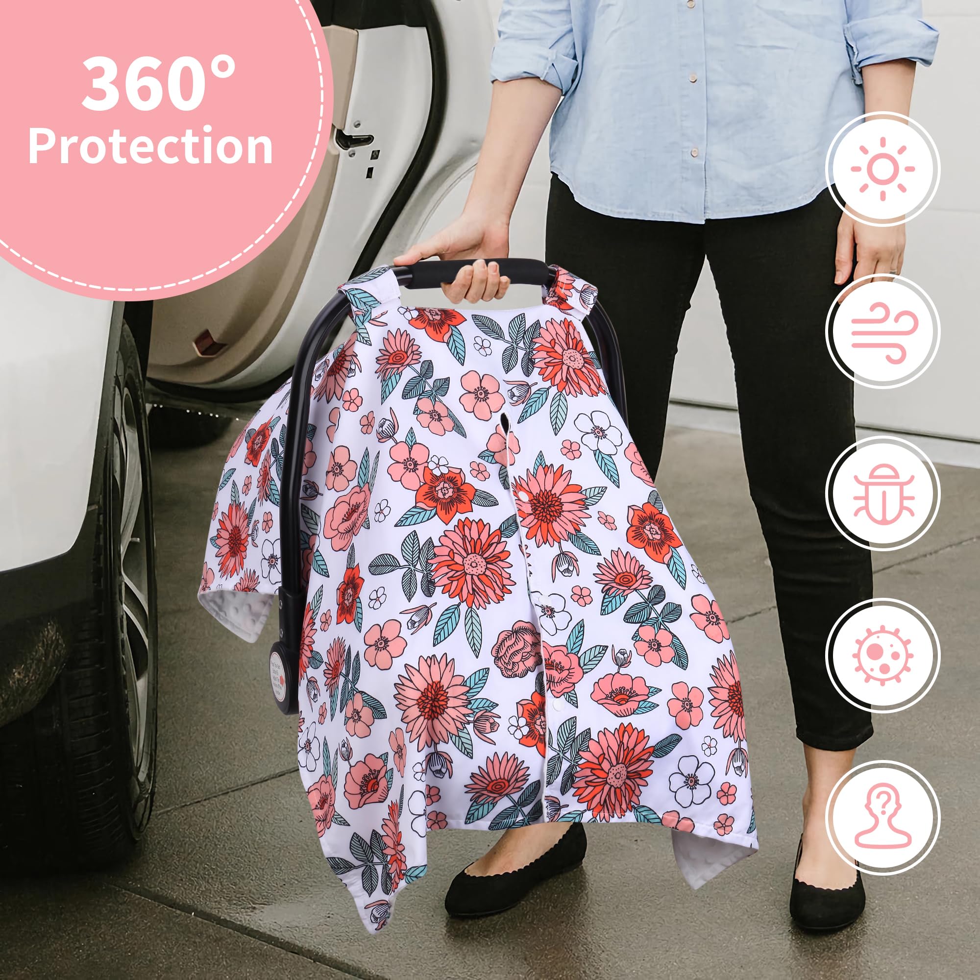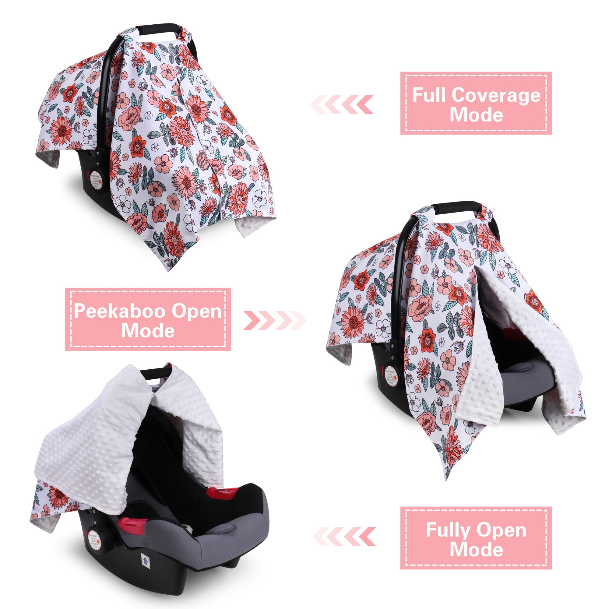 DOUBLE LAYER FABRIC: Our baby carseat covers are made of double-layer fabrics. The outside is durable polyester with cute patterns; the inside is soft minky with warm pile. It's not too thin or too thick for year-round use, and with a breathable window