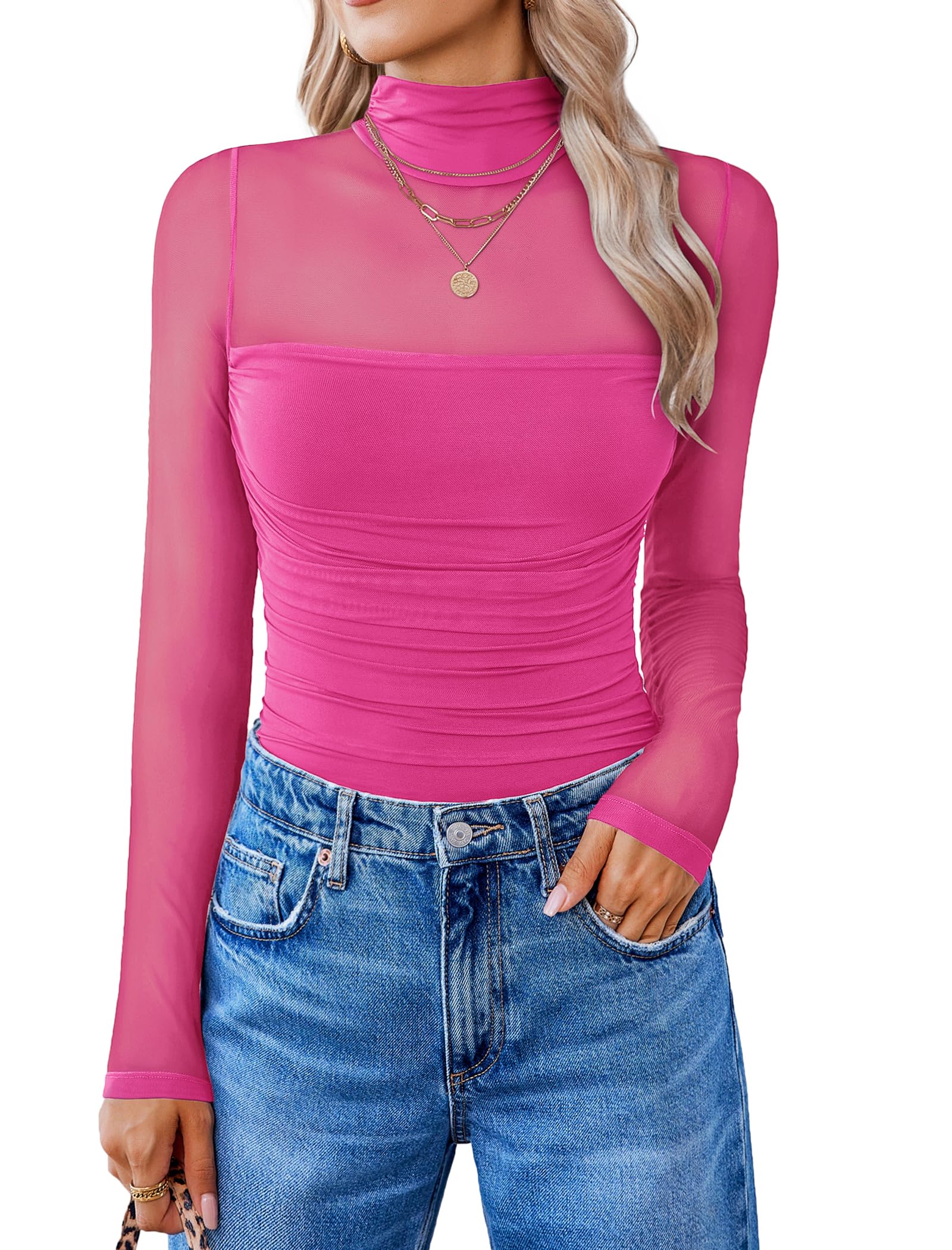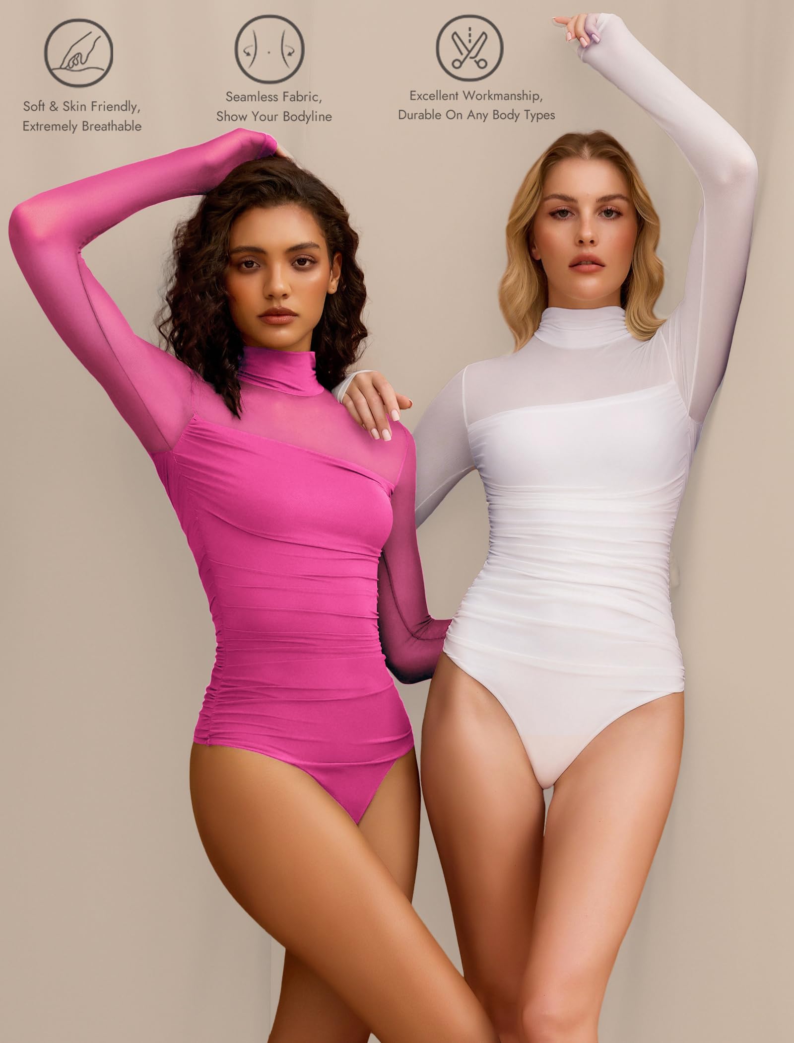 【Design】Sheer bodysuit for women feature Turtle neck and mesh sleeves ,design with double-layer fabric, layered ruched decoration,from chest to waist with super soft material,make it more slim fitting, bring a sense of detail design to basic styles, but also make them more elegant and versatile,great staple for your wardrobe.