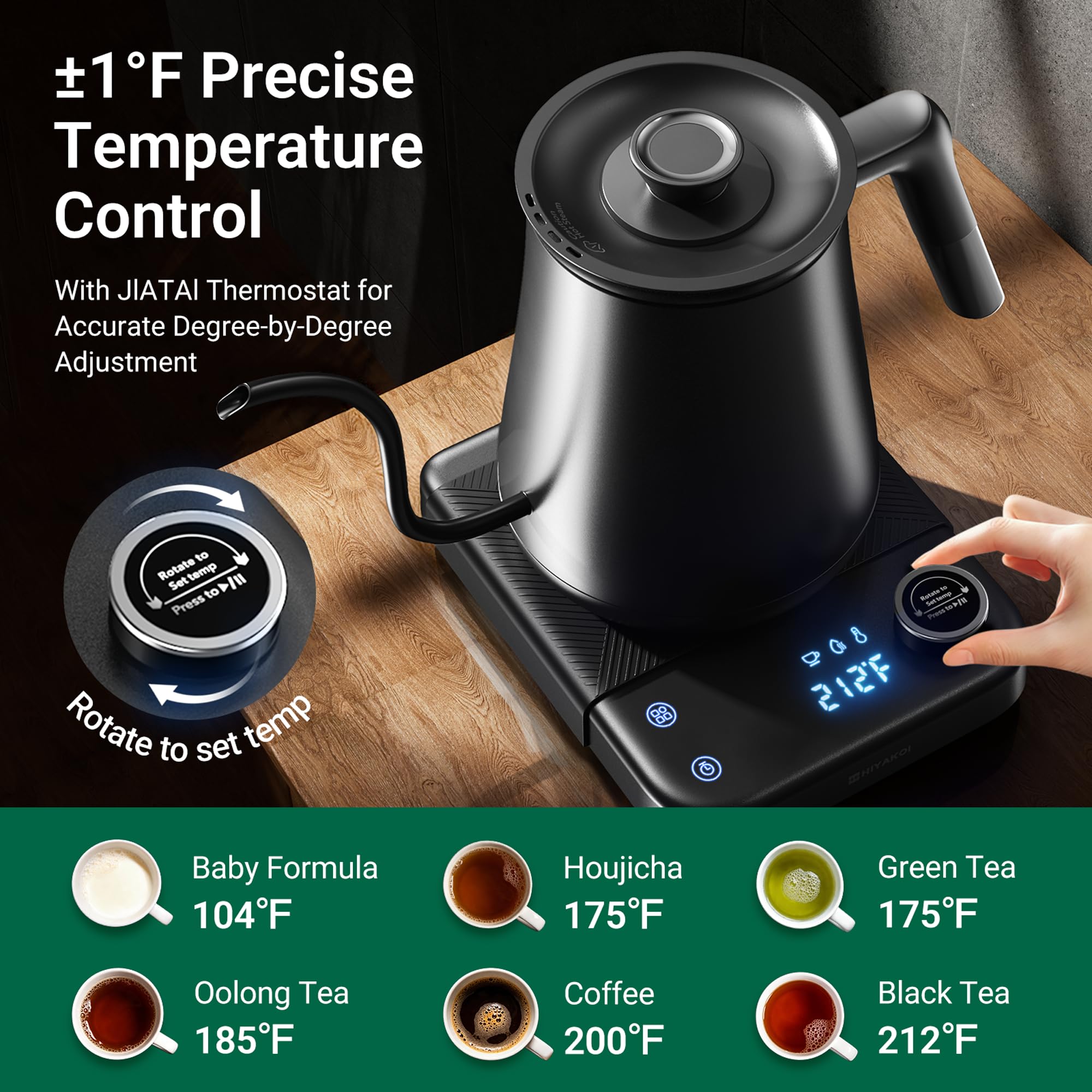 ±1°F Precise Temp Control: Our kettle features a precise digital thermostat with ±1℉ accuracy, allowing for custom temperature settings. Achieve optimal extraction for the nuanced flavors of Light Roast Coffee, Oolong, Green, or Black Tea.